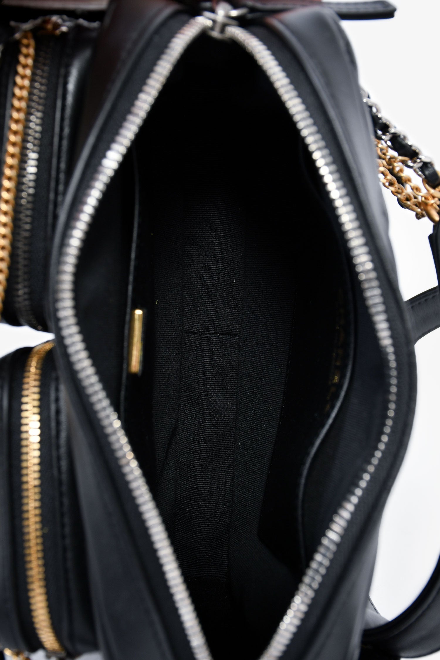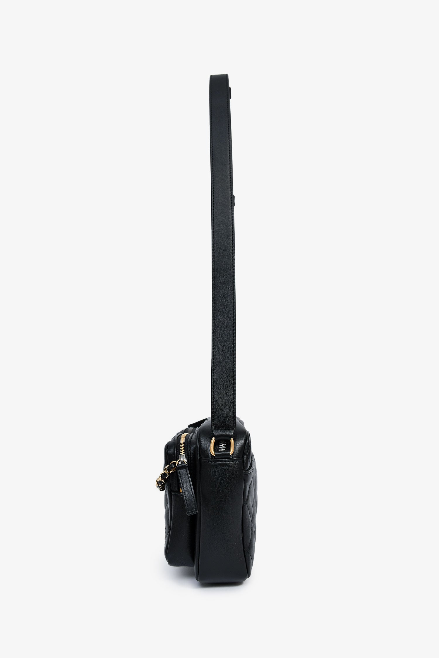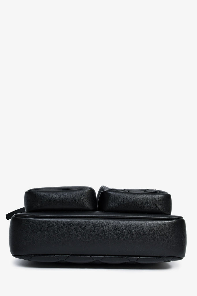 Pre-Loved Chanel™ 2022 Black Leather Chain Detail Camera Bag. Top zipper closure. Two front exterior zip pouches. Interior compartment with two slip wall pockets. Adjustable strap. Textile lining. Two-tone hardware. Tonal stitching.