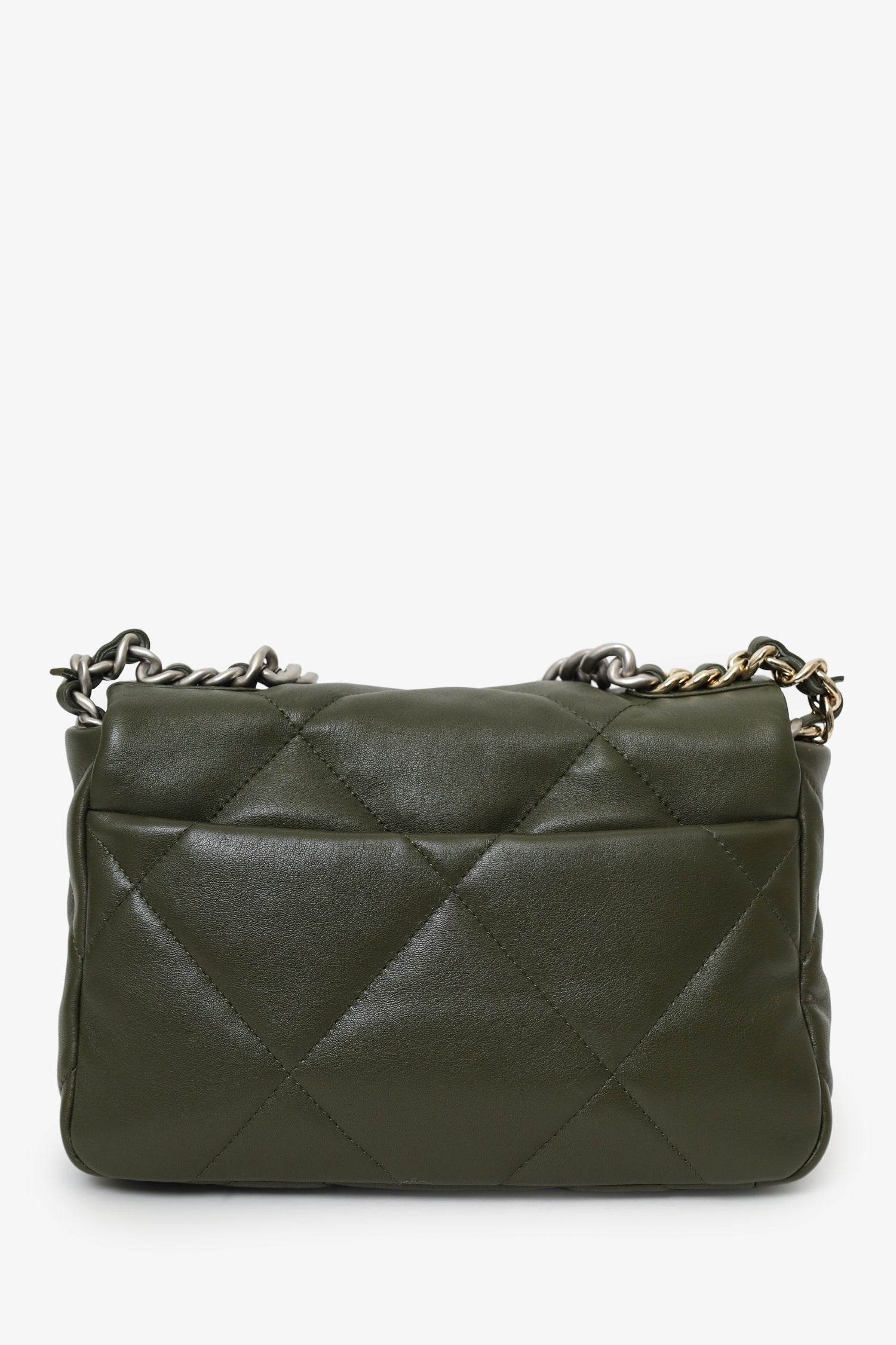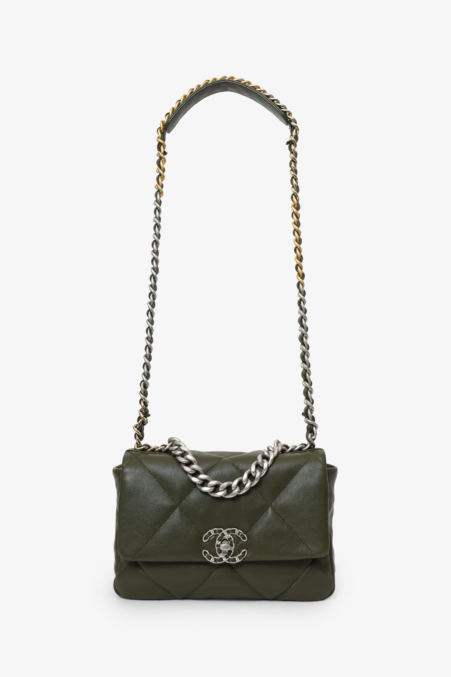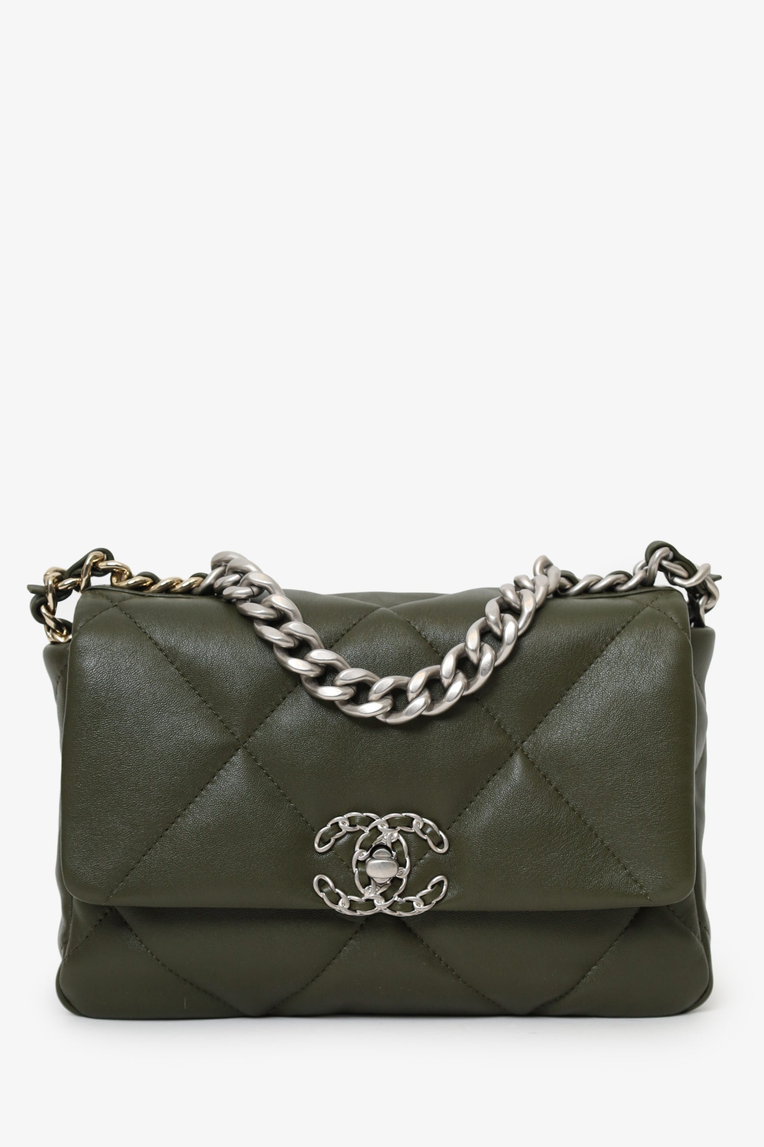 Pre-Loved Chanel™ 2022+ Khaki Green Leather 'Chanel™ 19' Small Flap. Front fold-over flap with turn-lock closure. Top chainlink handle. Chainlink crossbody strap. Single exterior rear pockets with magnetic closure. Leather-lined interior. Single interior zip pocket. Silver and gold-tone hardware. Tonal stitching.