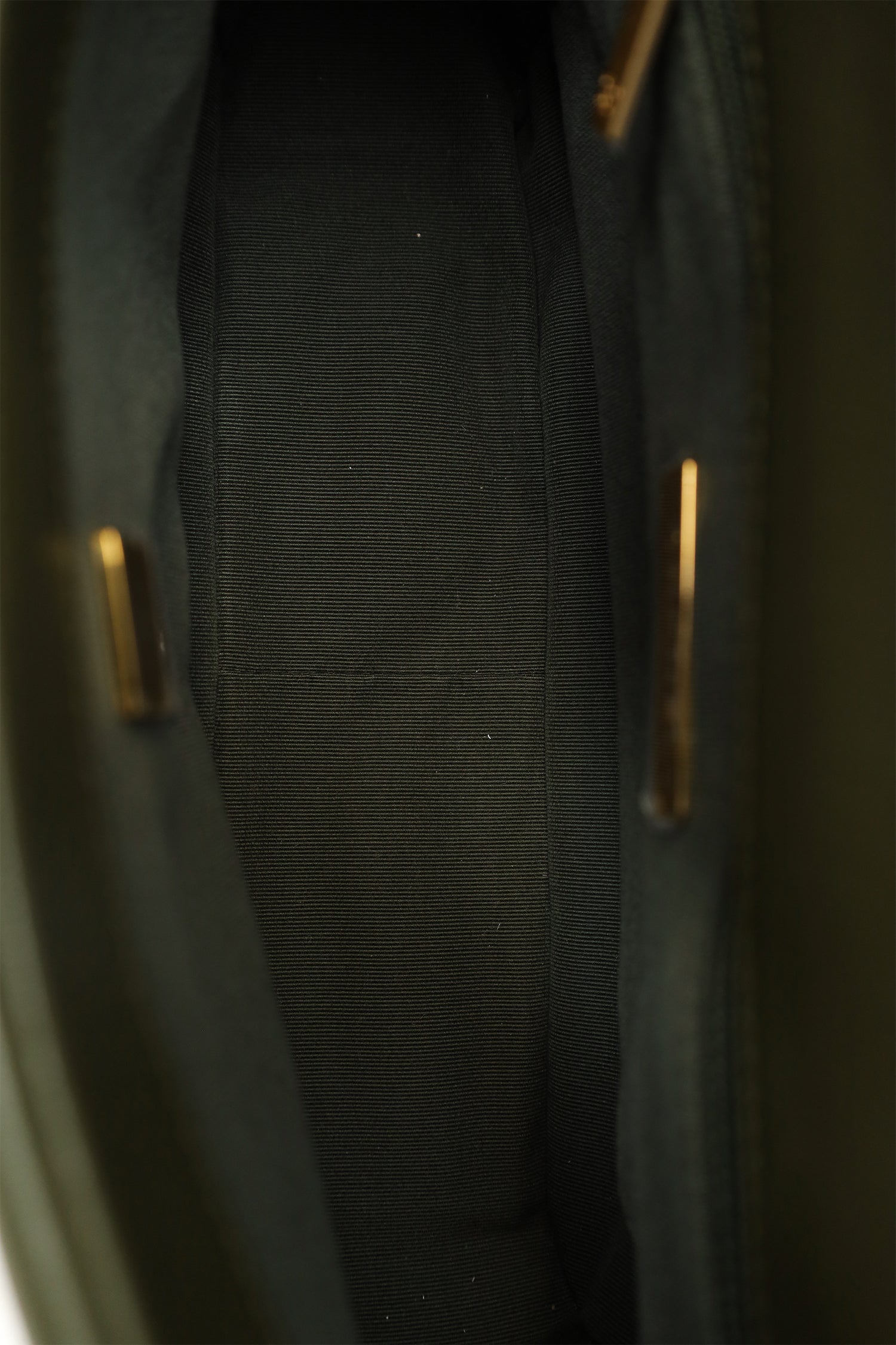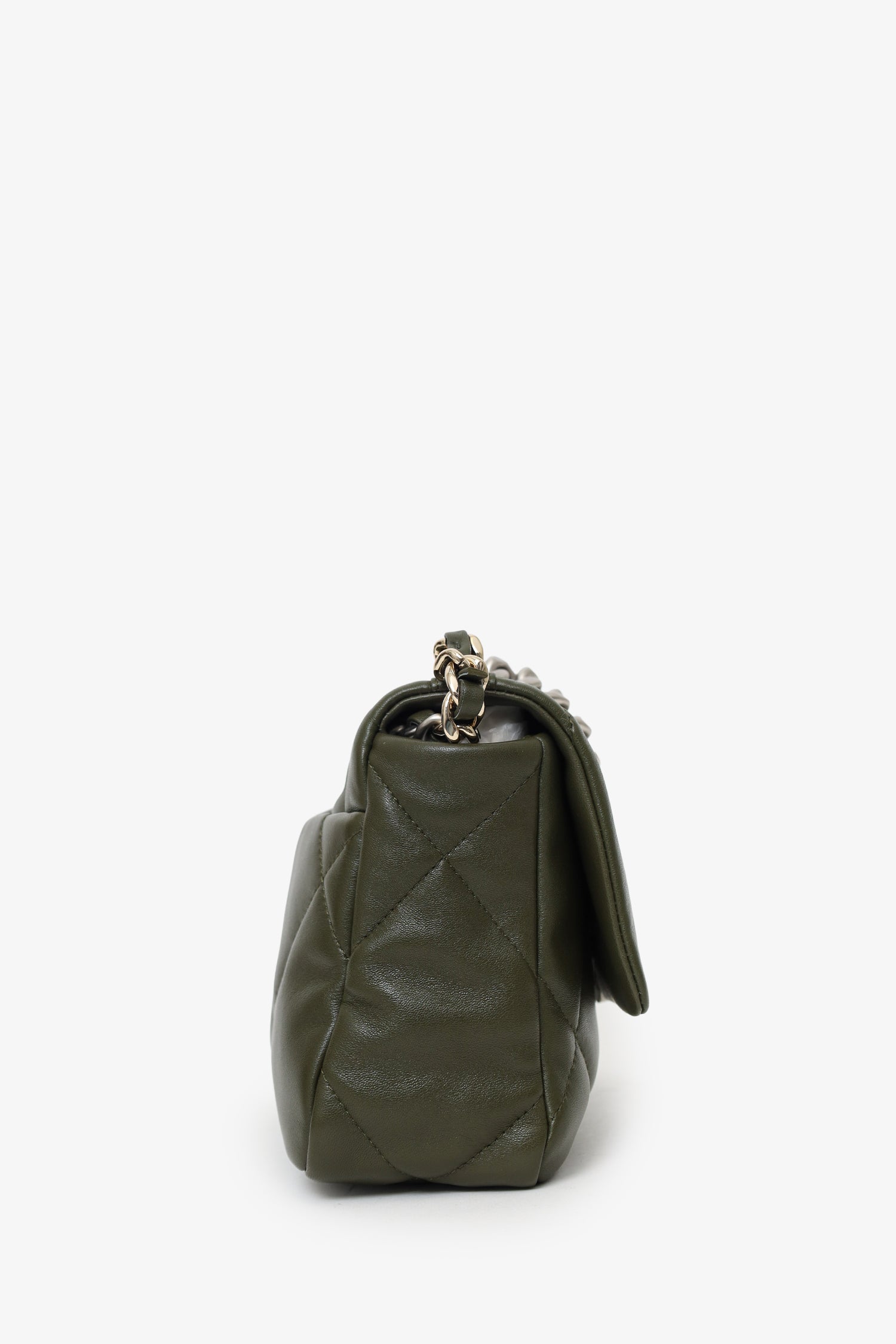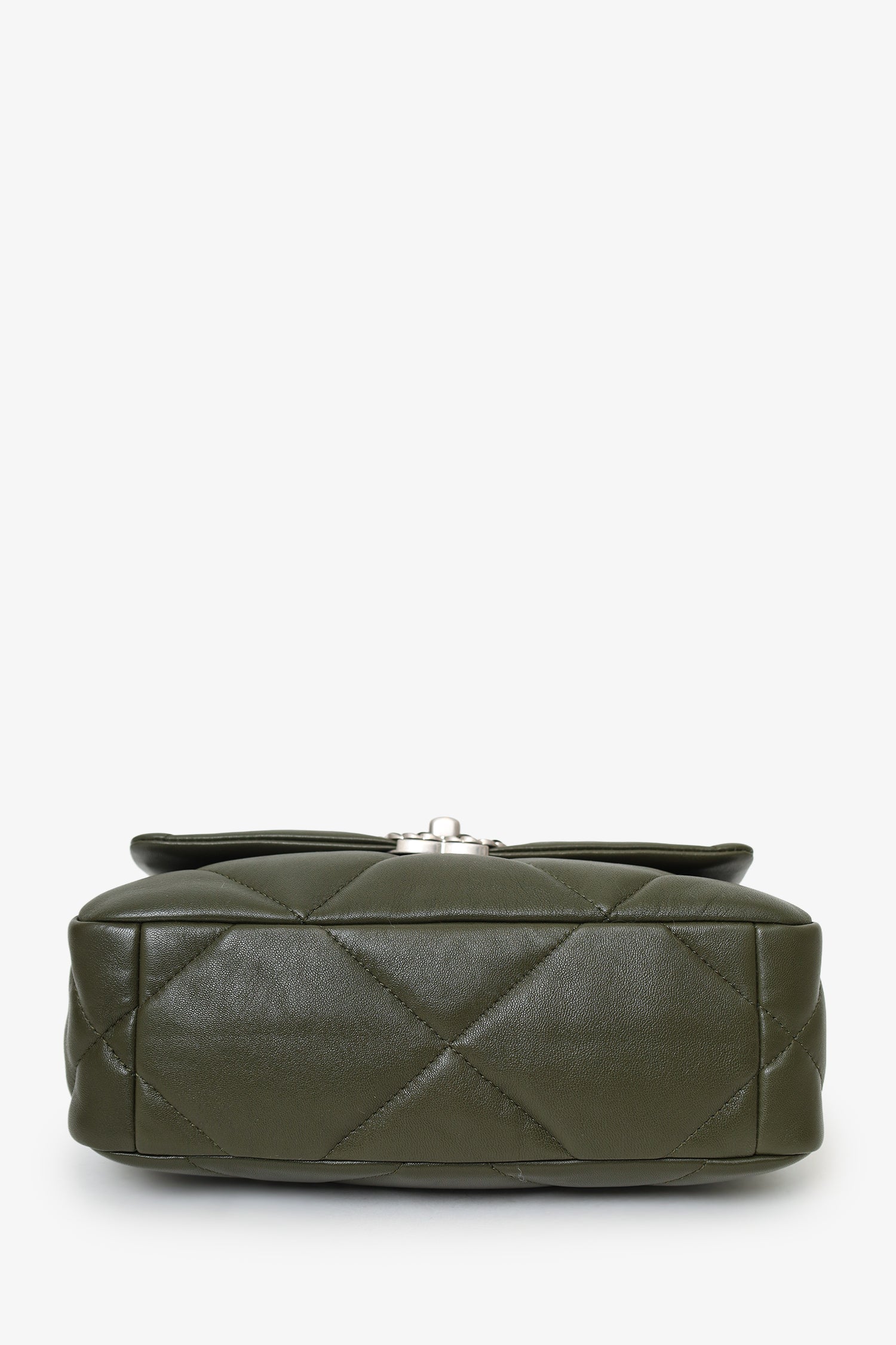 Pre-Loved Chanel™ 2022+ Khaki Green Leather 'Chanel™ 19' Small Flap. Front fold-over flap with turn-lock closure. Top chainlink handle. Chainlink crossbody strap. Single exterior rear pockets with magnetic closure. Leather-lined interior. Single interior zip pocket. Silver and gold-tone hardware. Tonal stitching.