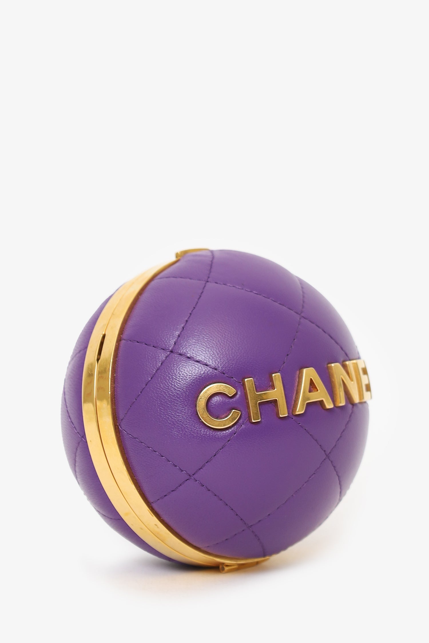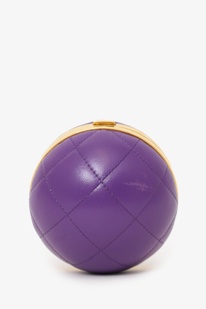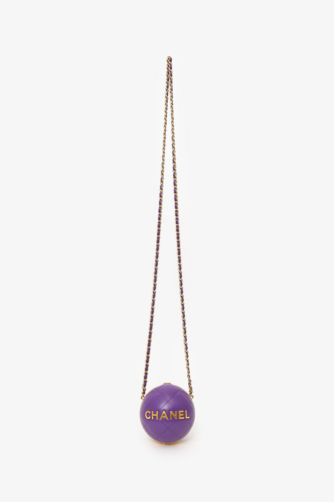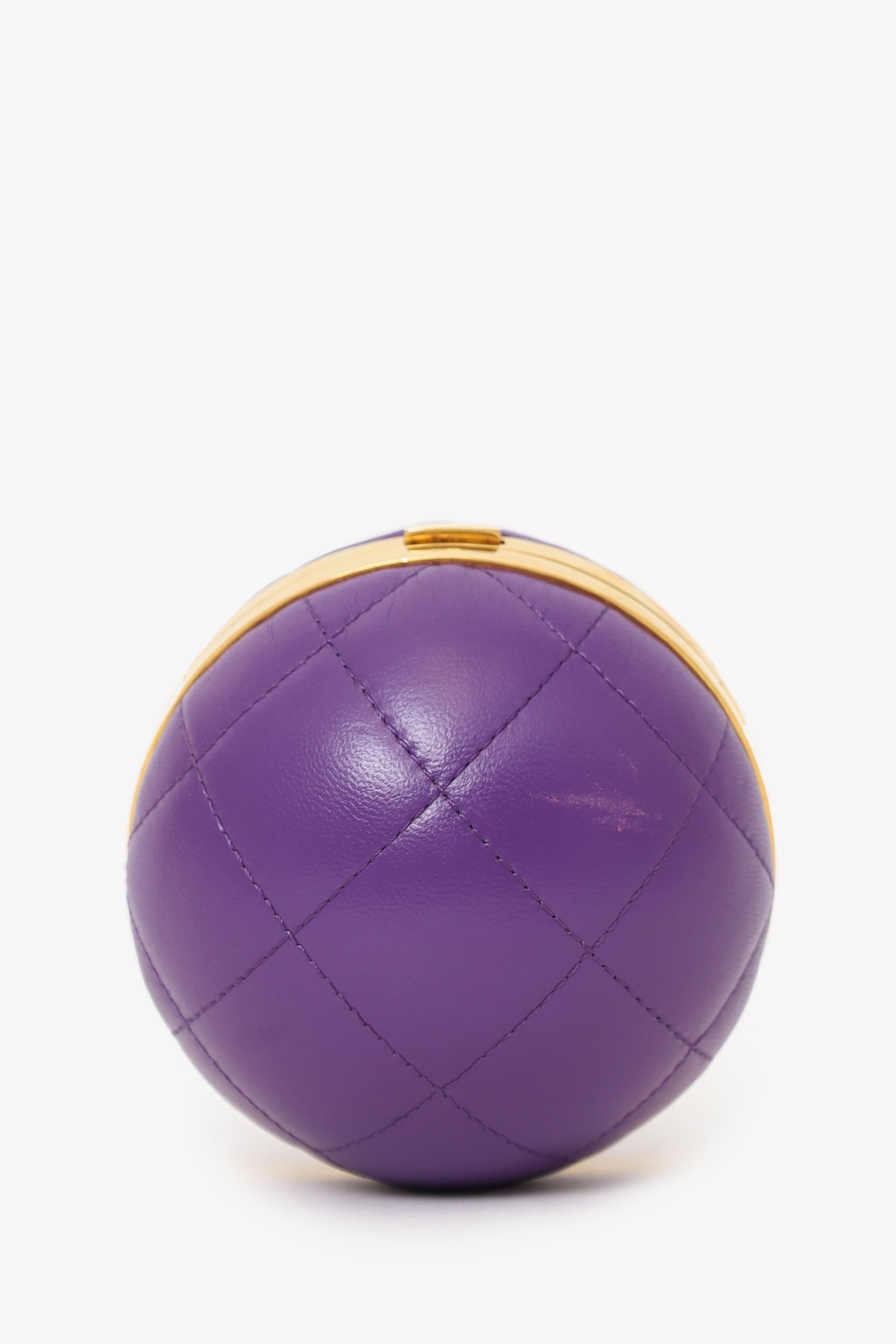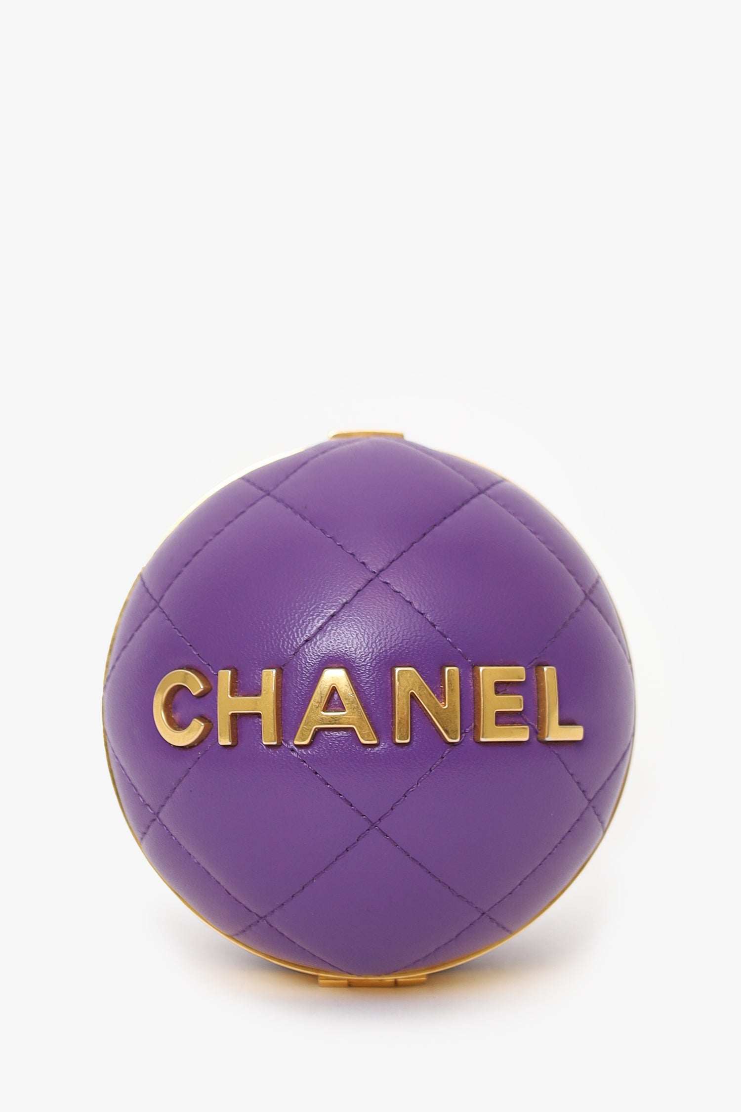Pre-Loved Chanel™ 2022 Purple Paris-Le19M Coco Sphere Minaudiere Bag. Top push-pin closure. Single chain strap. Leather-lined interior. Two interior pockets. Gold-tone hardware. Tonal stitching.