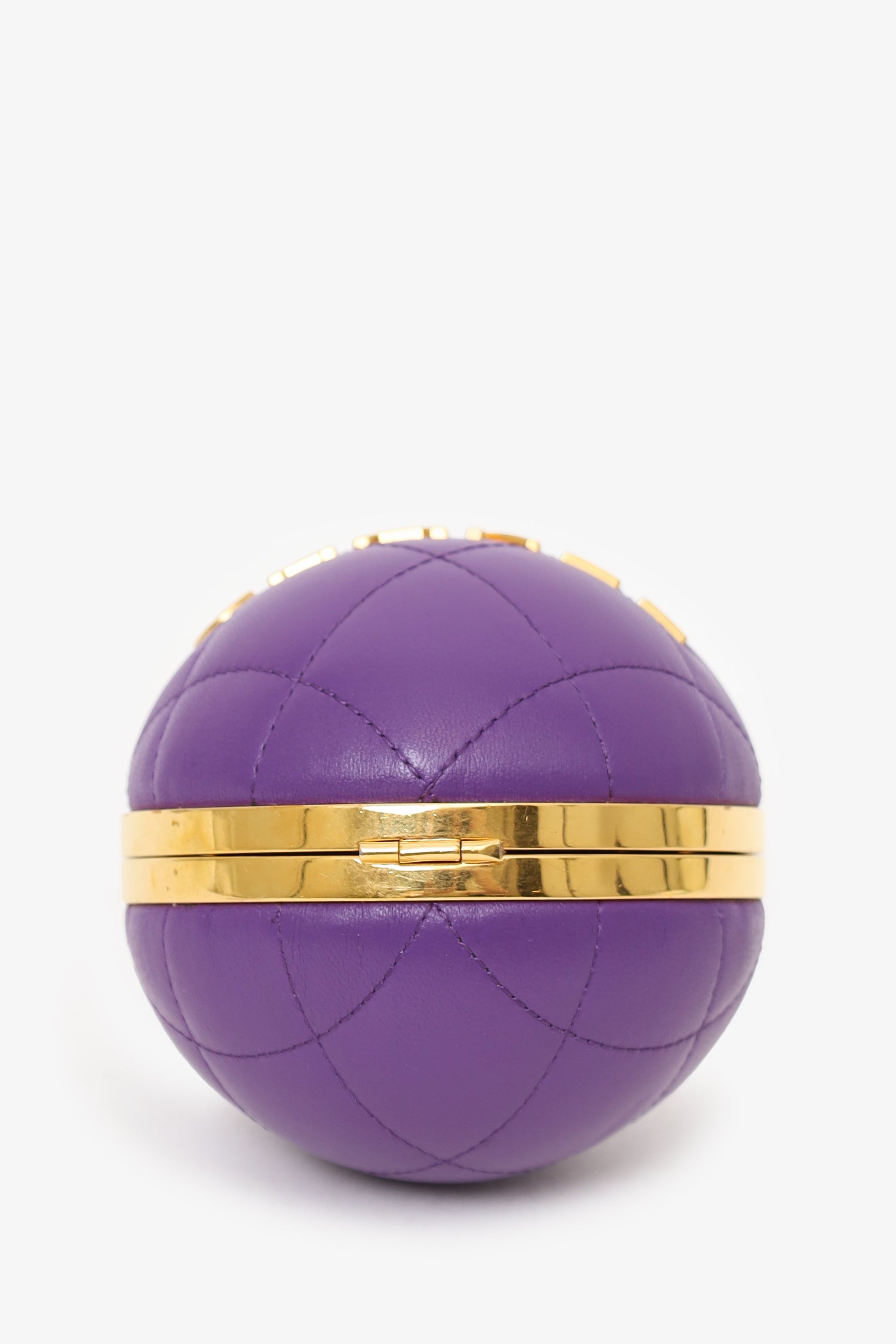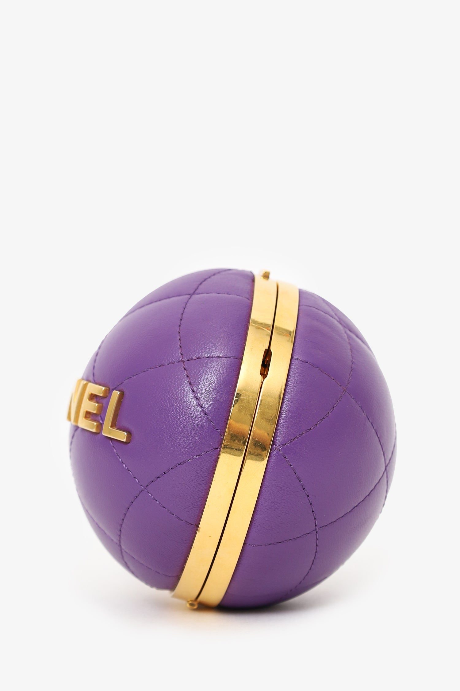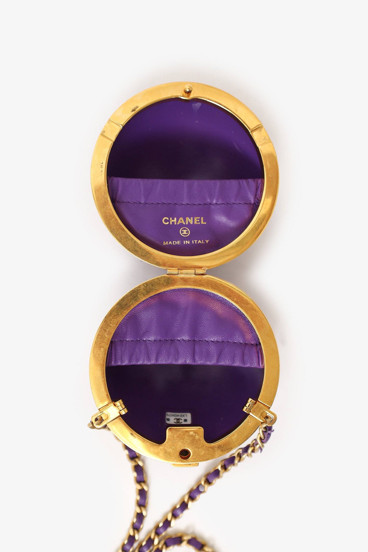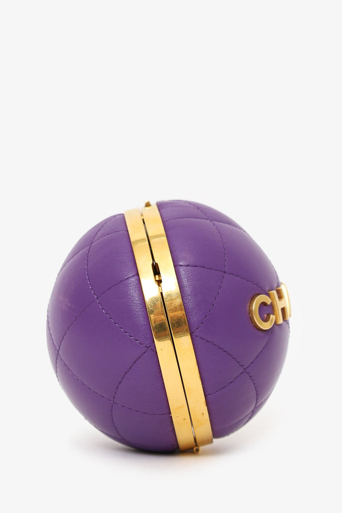 Pre-Loved Chanel™ 2022 Purple Paris-Le19M Coco Sphere Minaudiere Bag. Top push-pin closure. Single chain strap. Leather-lined interior. Two interior pockets. Gold-tone hardware. Tonal stitching.