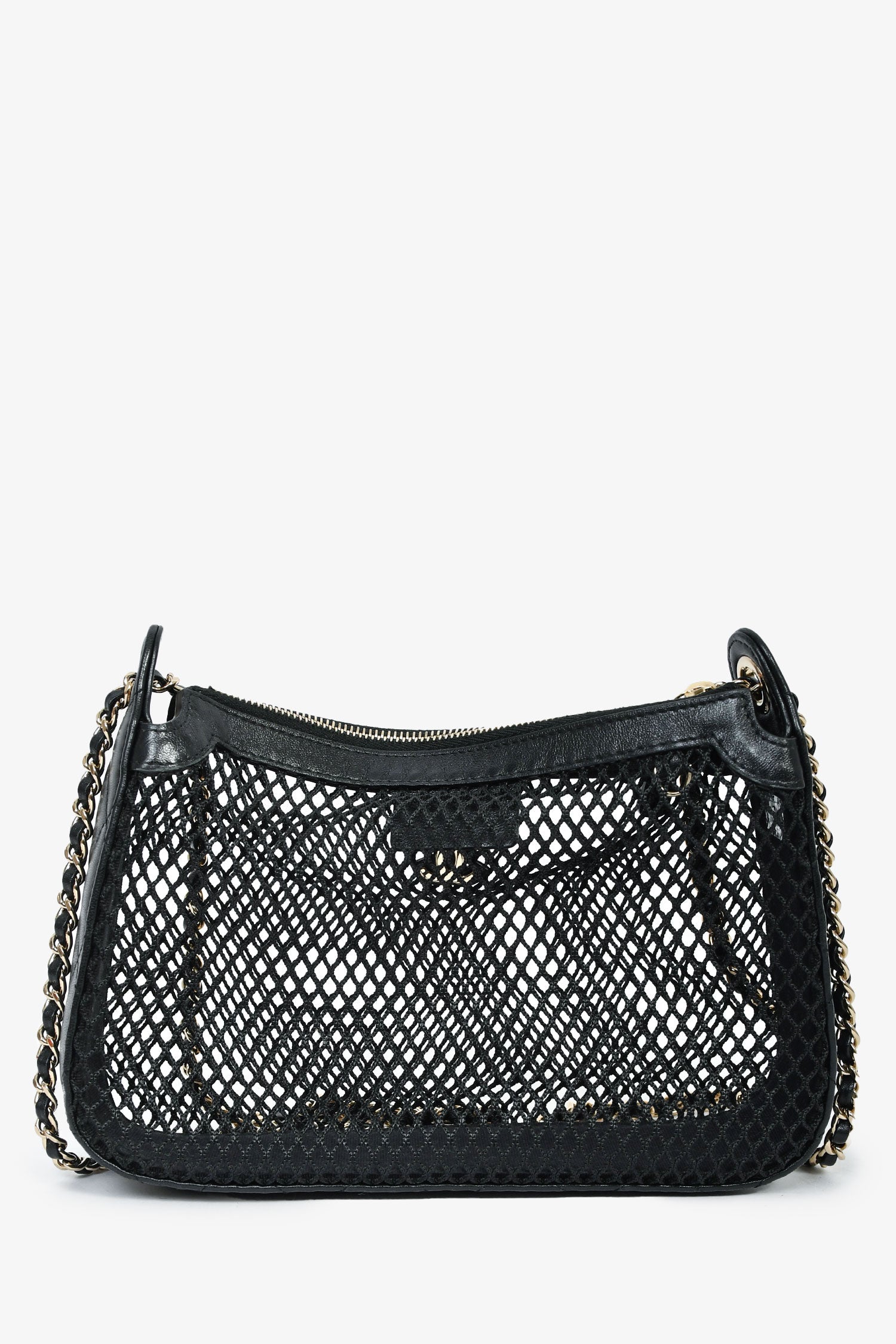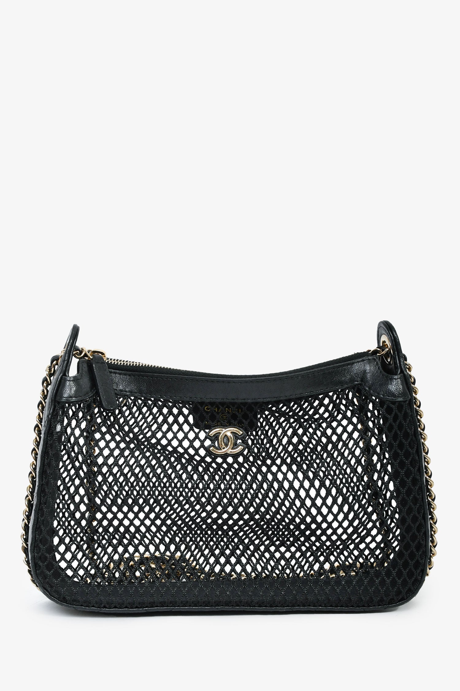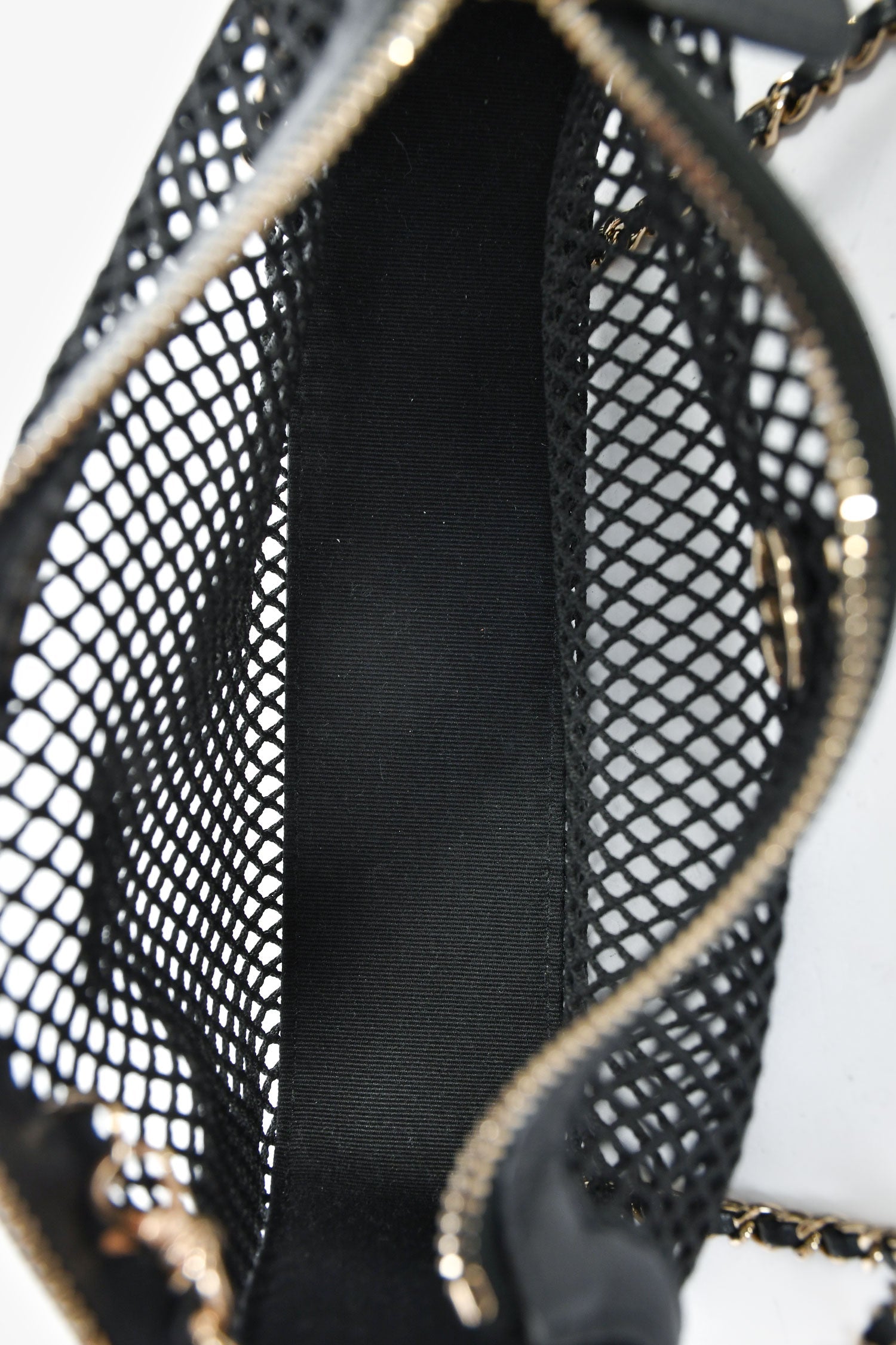 Pre-Loved Chanel™ 2025 Black Mesh Shiny Lambskin Chain Clutch. Zipped top. Chain-link and leather strap. Unlined interior. Attached pouch. Gold-tone hardware. Tonal stitching.