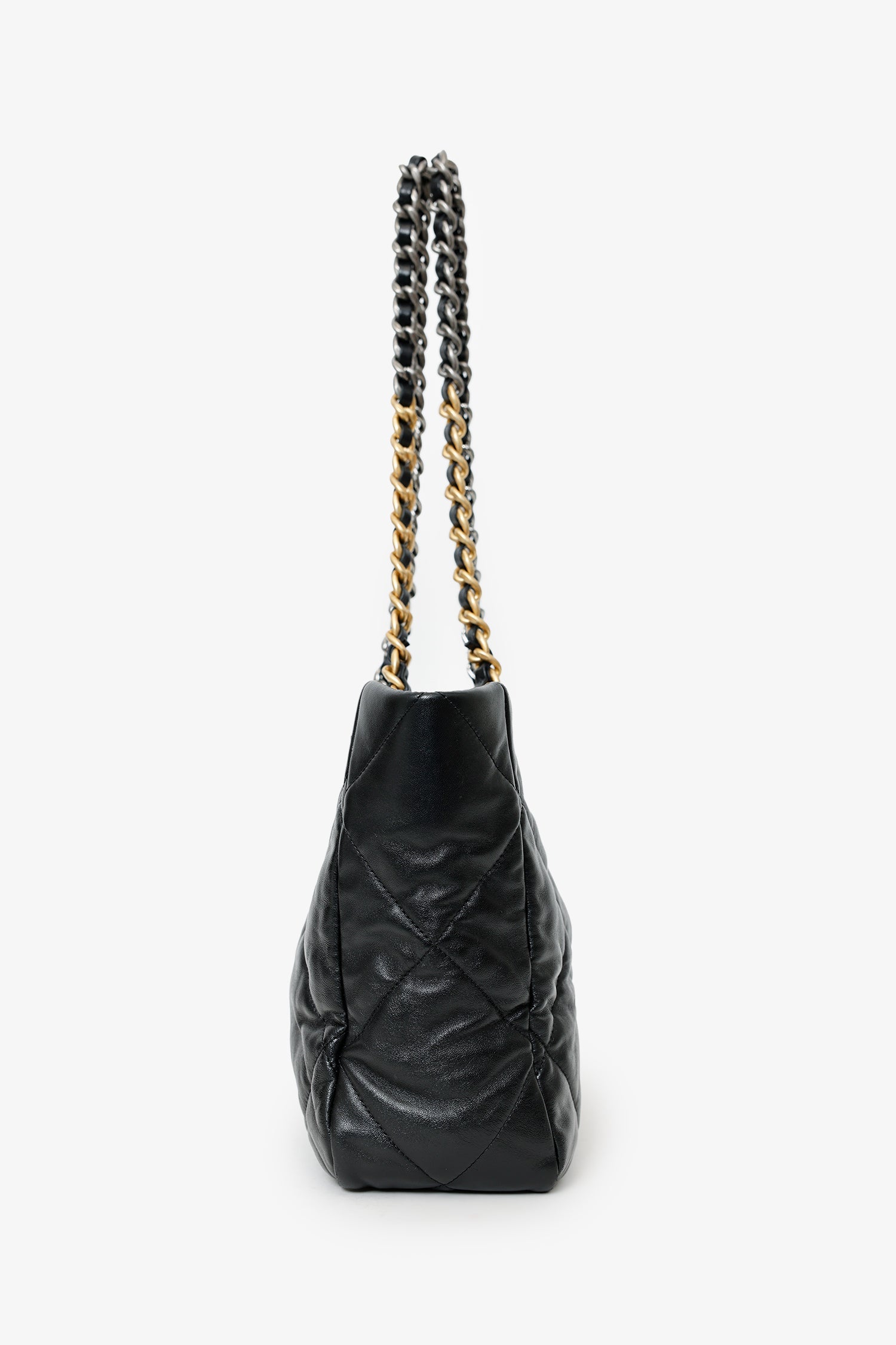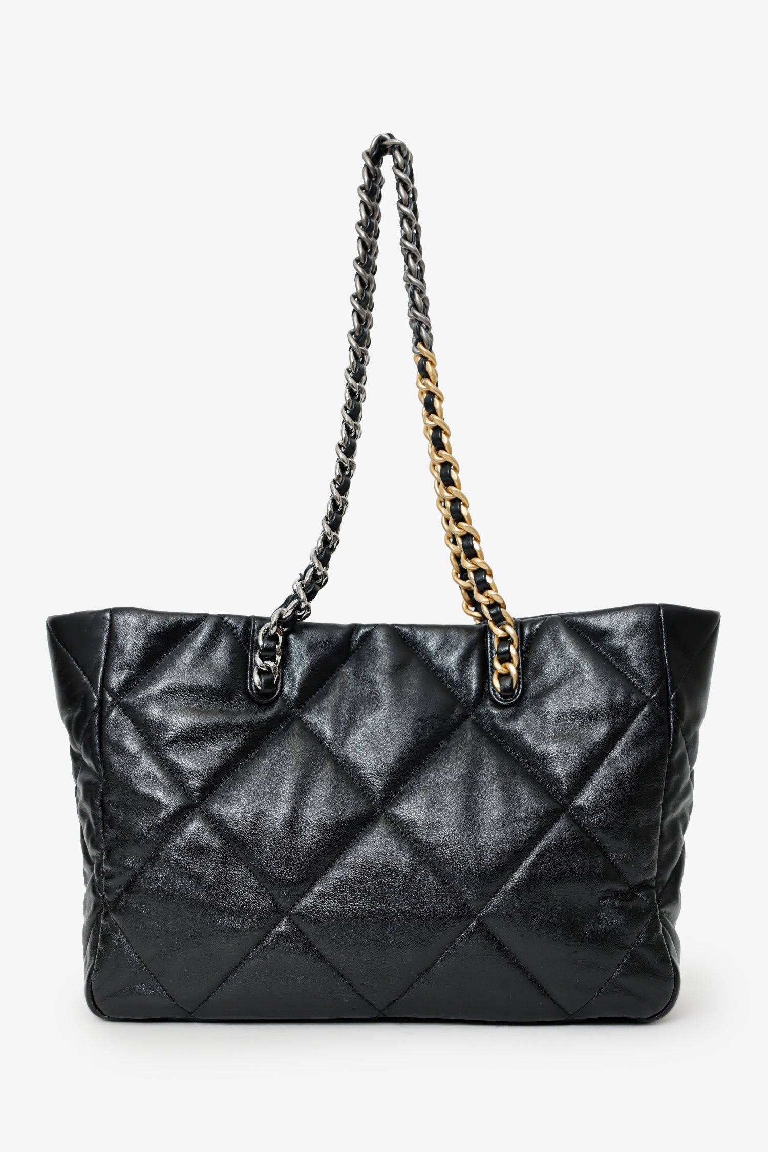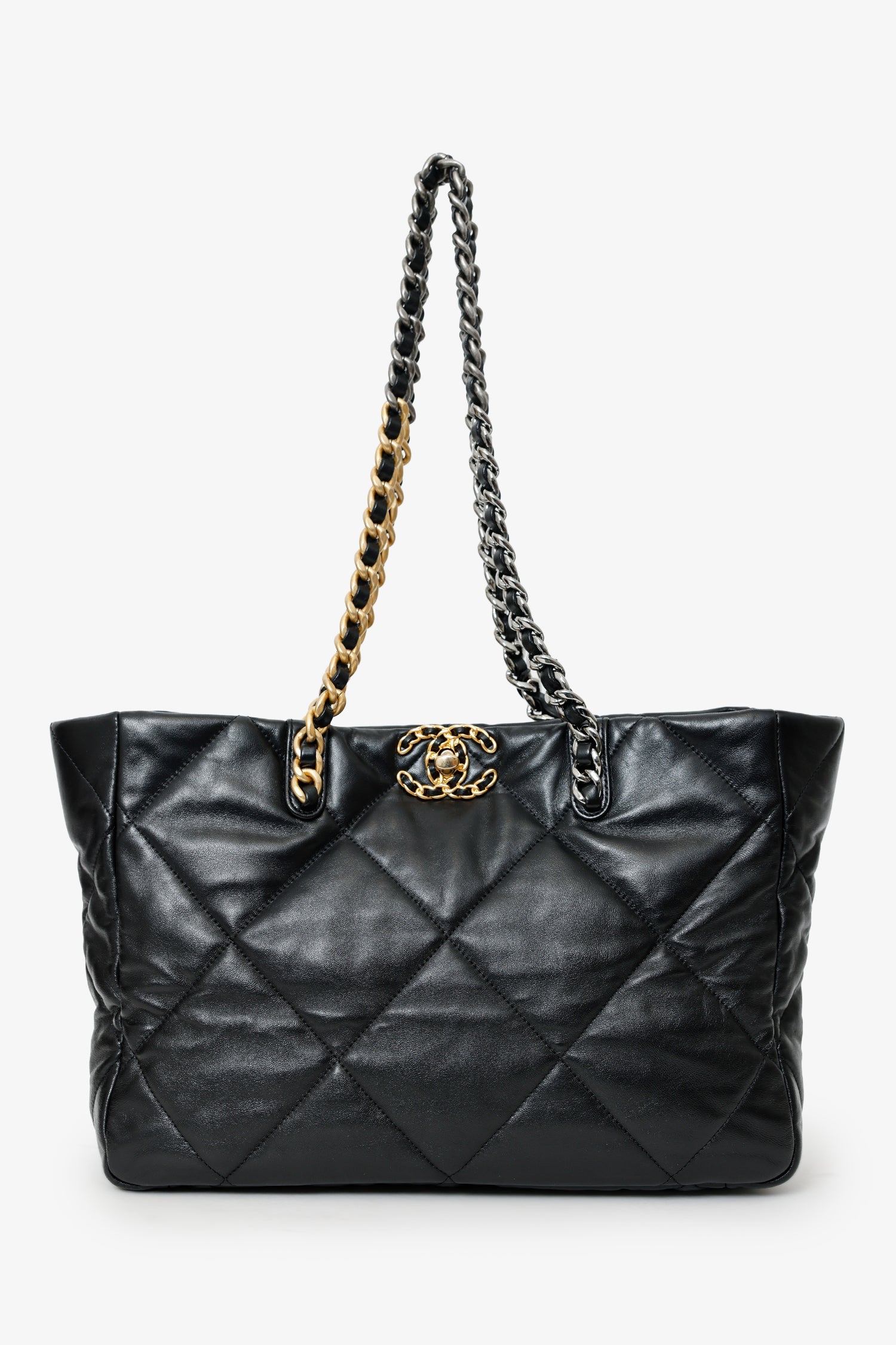 Pre-Loved Chanel™ Black Quilted Lambskin '19 Shopping' Tote Bag. Turn-lock closure. Twin chain link and leather shoulder straps. Lined interior. Single interior rear wall pocket with zip closure. Gold and silver-tone hardware. Tonal stitching.