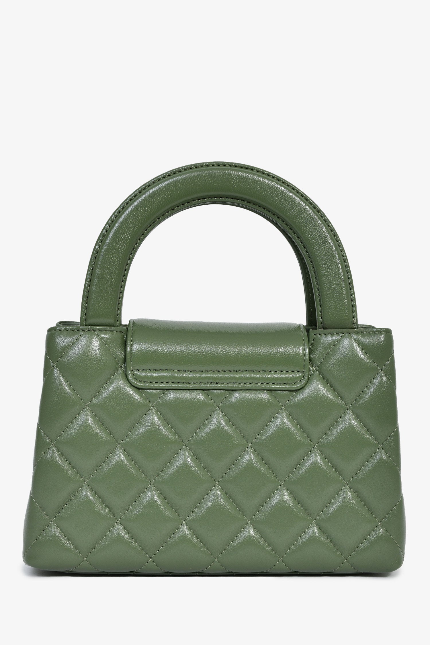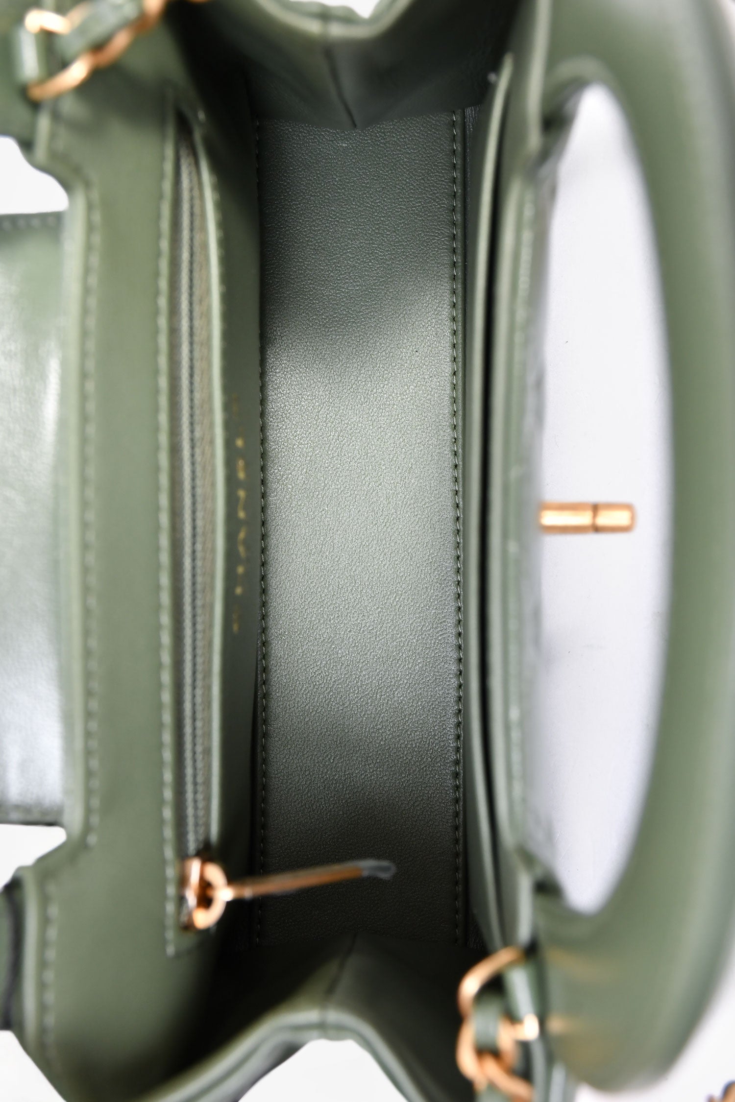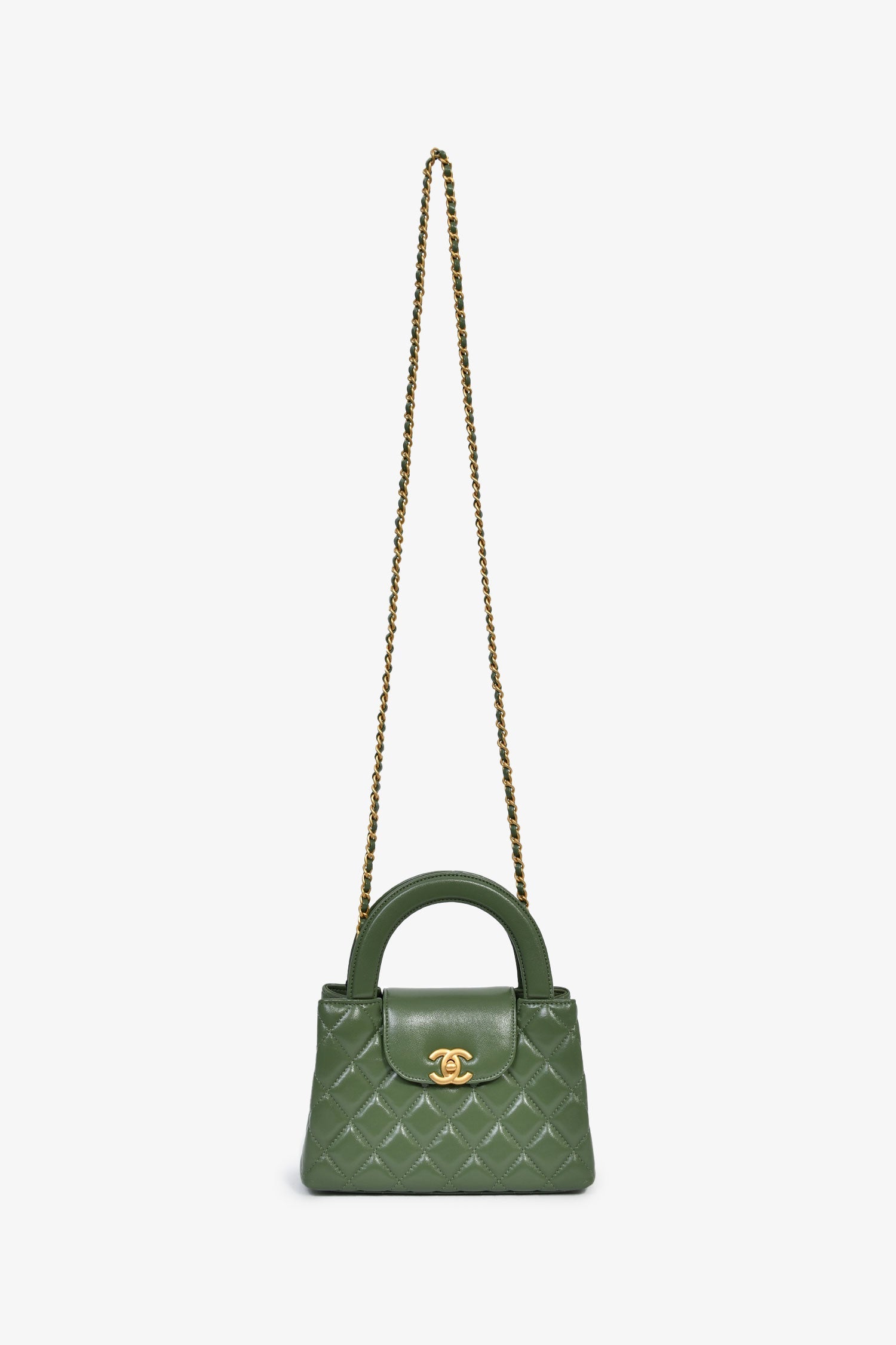 Pre-Loved Chanel™ Green Lambskin Mini Kelly Shopper Tote. Fold-over flap with a turn-lock closure. Dual open top handles and a chain-link crossbody strap. 1 slip and 1 zip compartment. Gold-tone hardware. Tonal stitching.