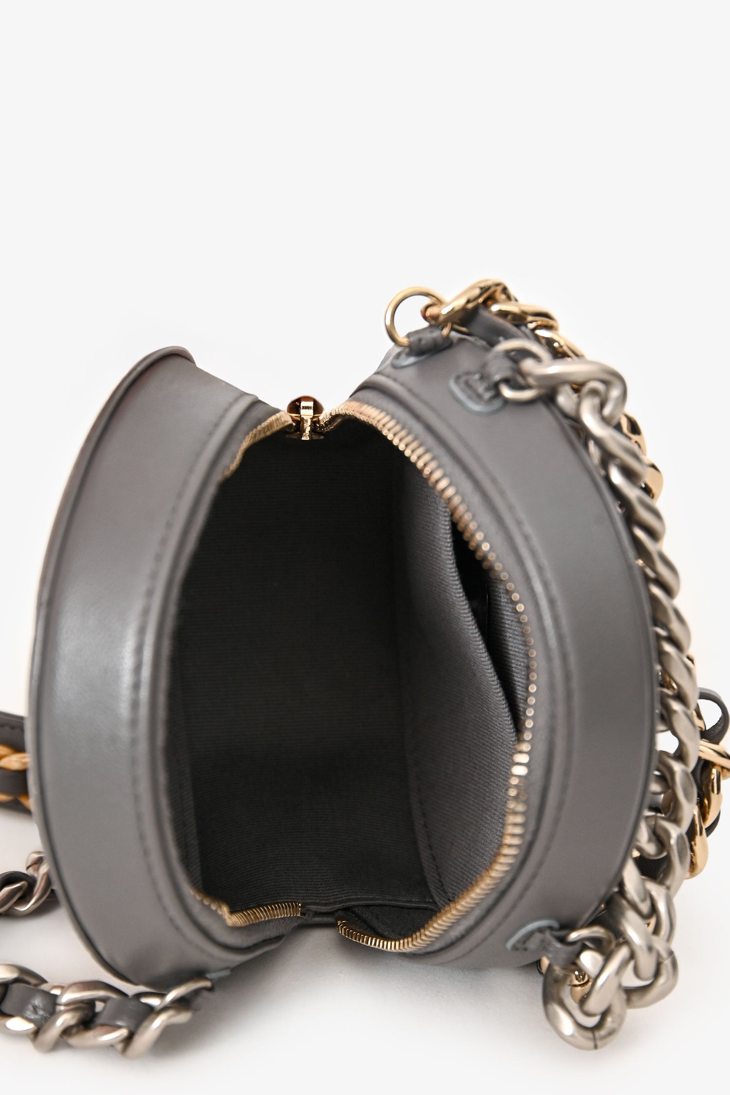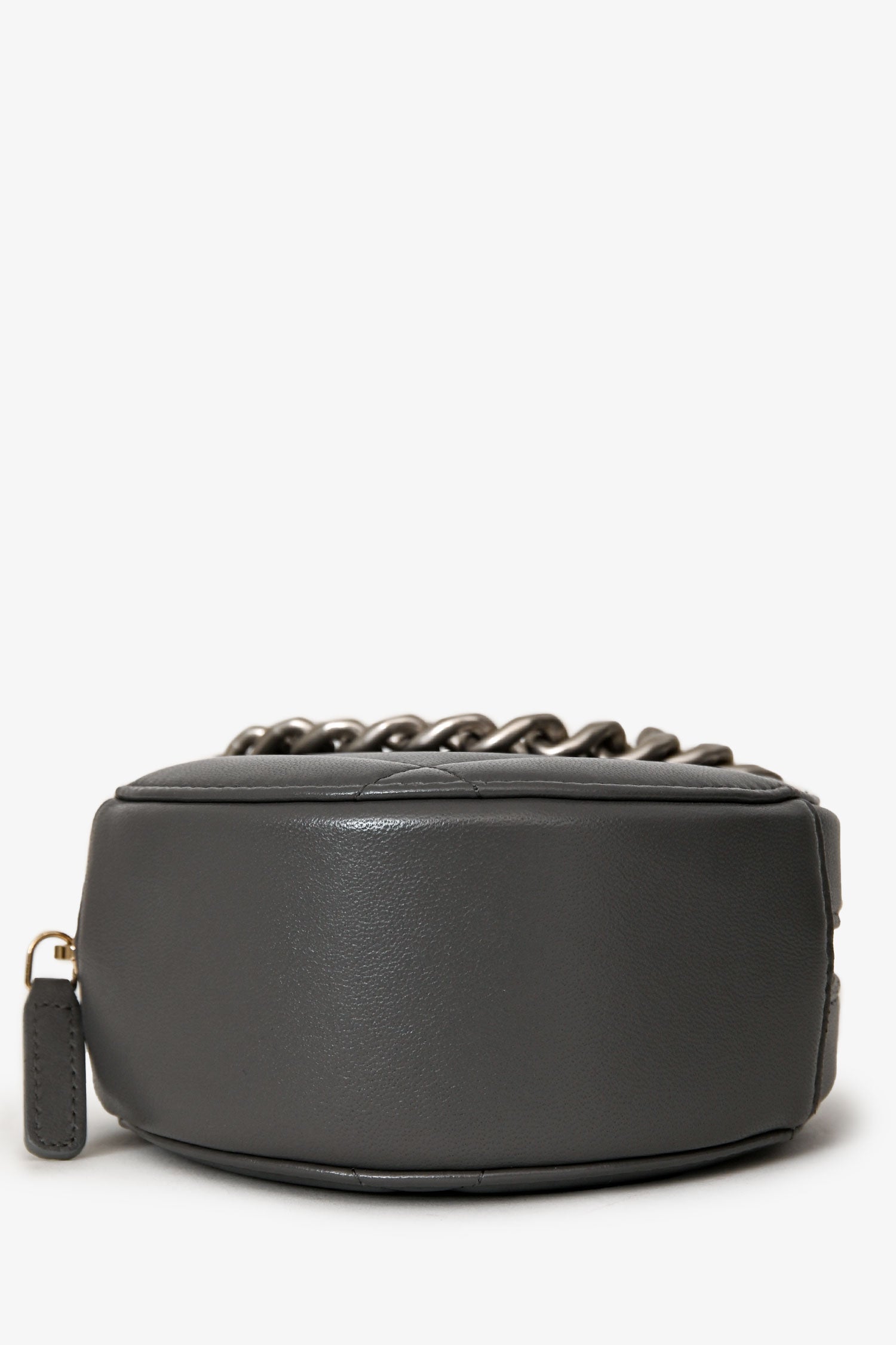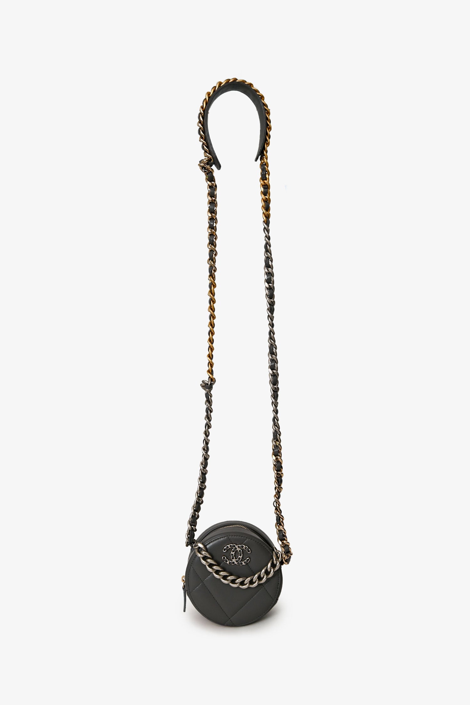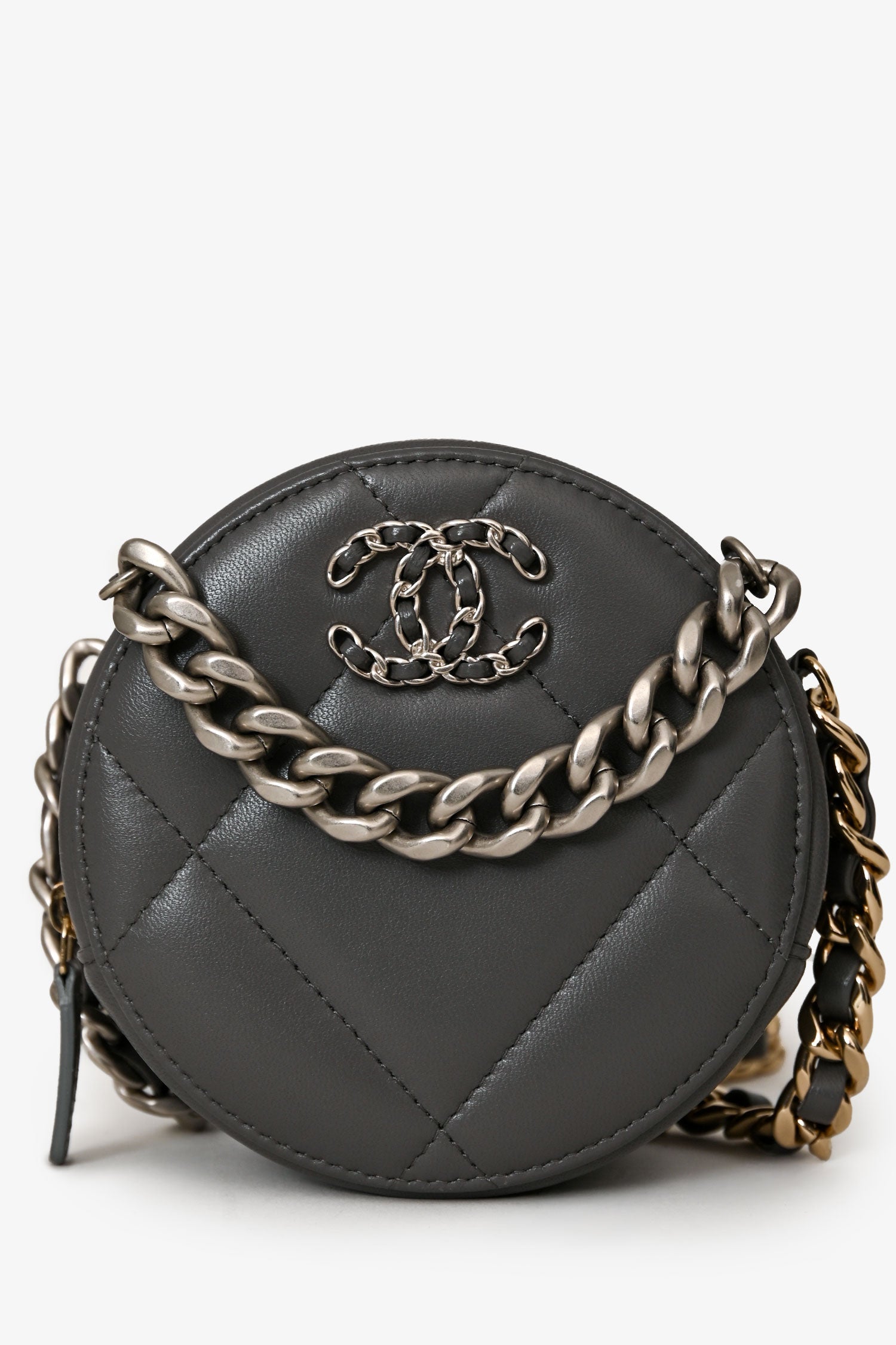 Pre-Loved Chanel™ Grey Lambskin 19 Round Crossbody. Zip-around closure. Chain shoulder strap with leather shoulder pad. Single main compartment; 2 interior slip pockets. Silver-tone hardware. Tonal stitching.