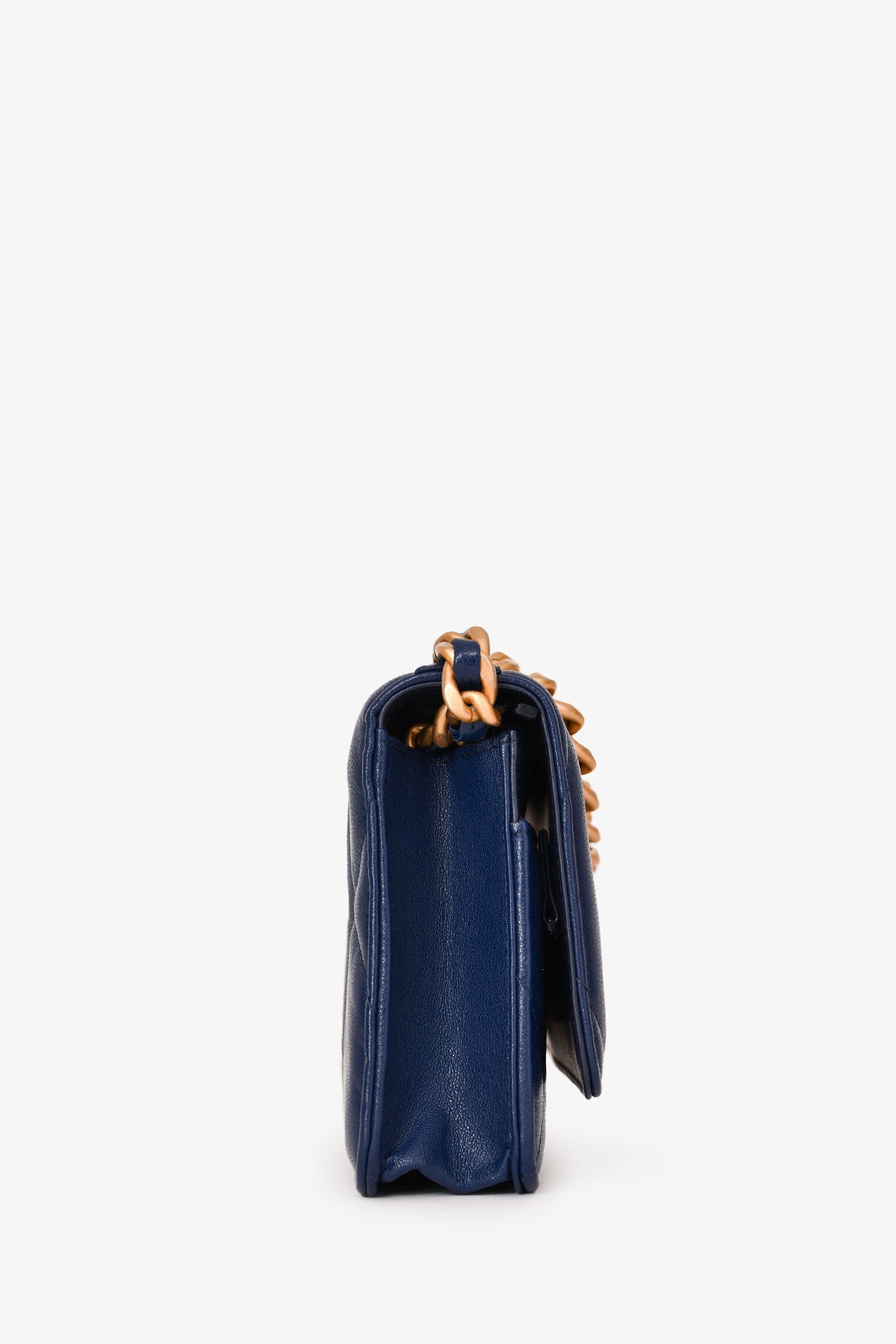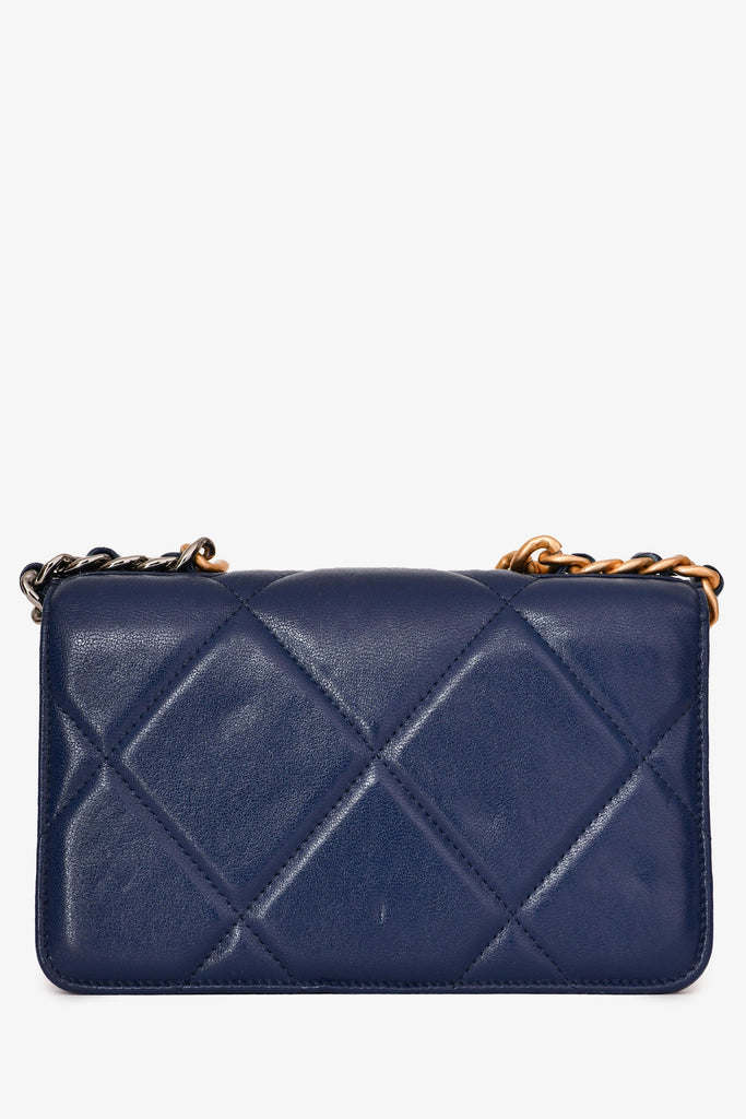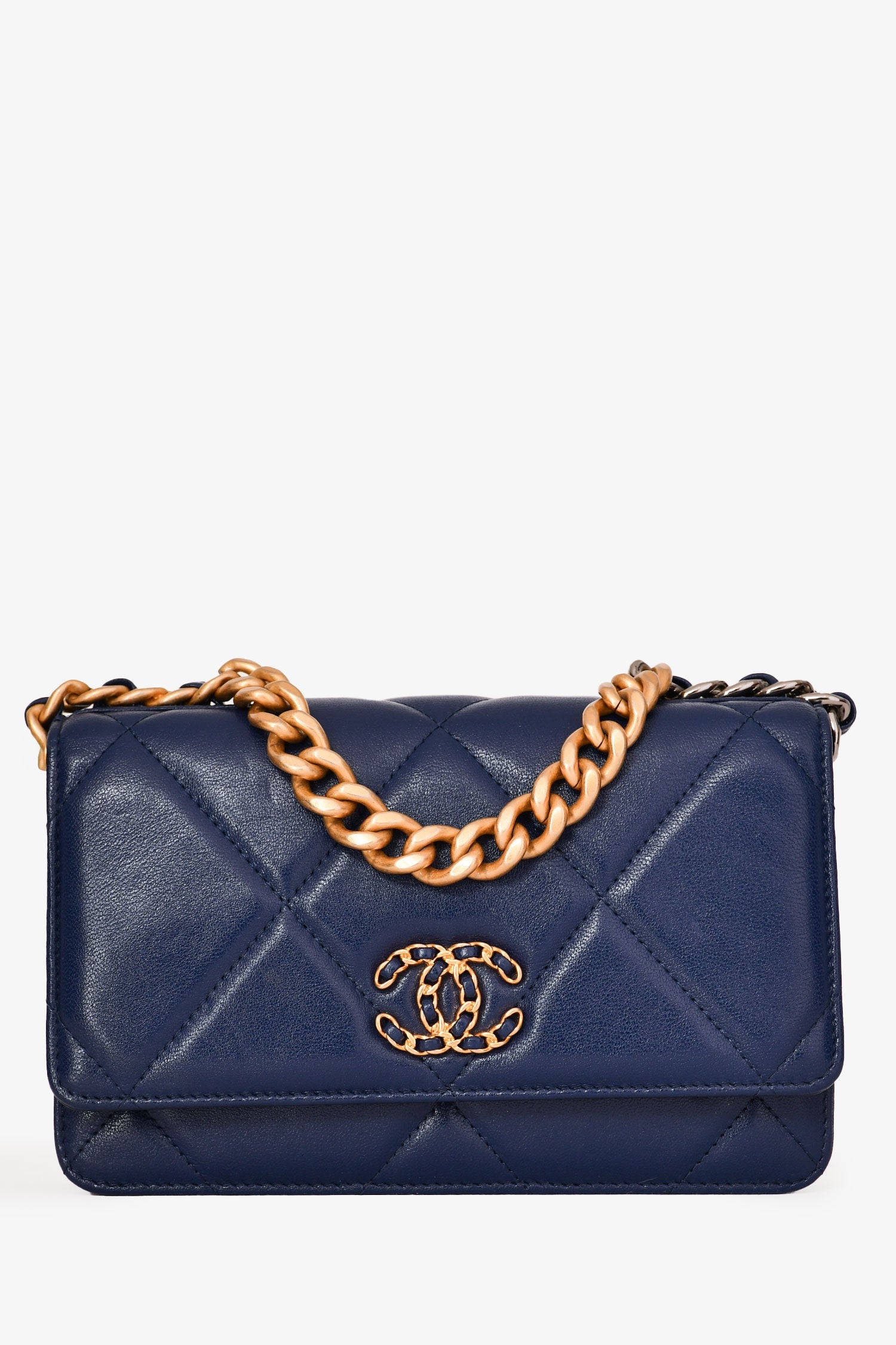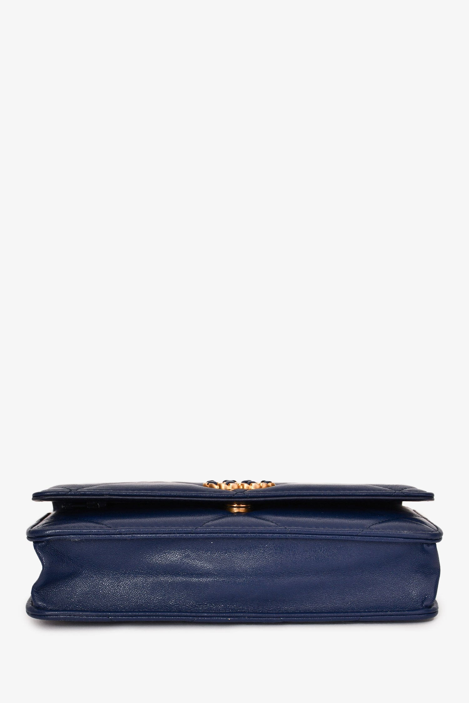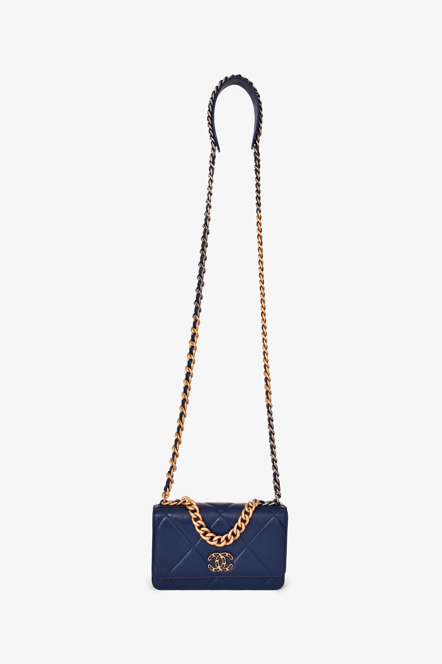 Pre-Loved Chanel™ Navy Lambskin 'Chanel 19' Wallet on Chain. Gold, silver, and antiqued silver-tone hardware. Fold-over flap with a snap closure. Chain-link and leather shoulder strap. 3 interior compartments. Zipper on the underside of the flap. Zipped compartment. 6 card slots. Tonal stitching.