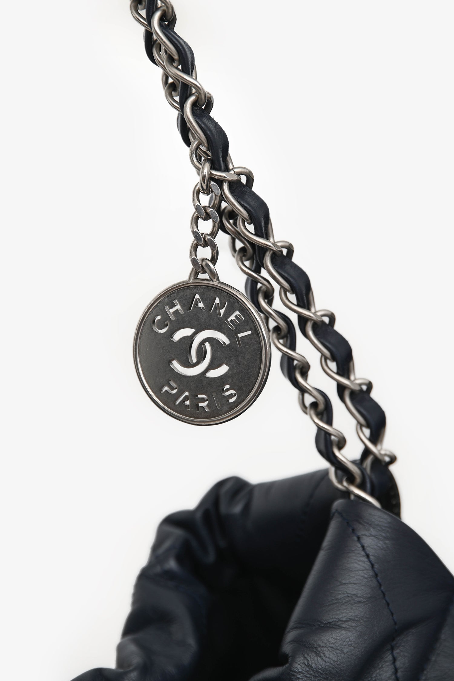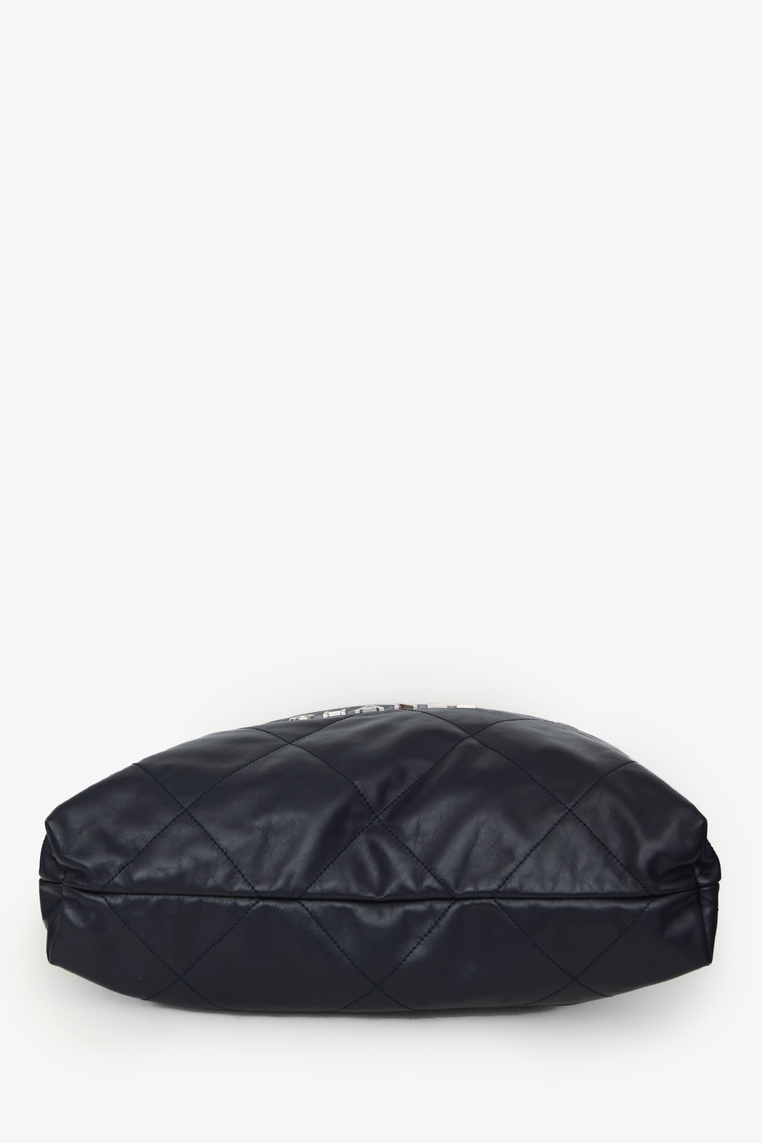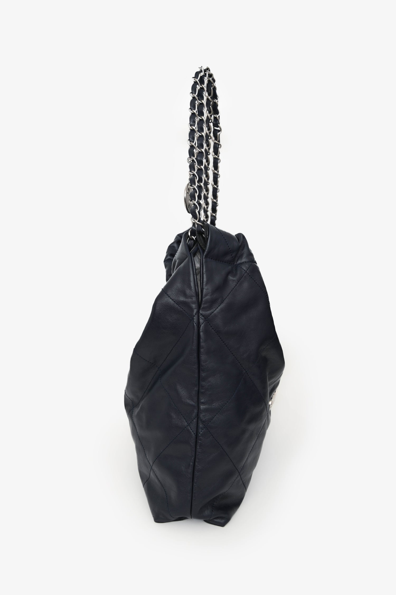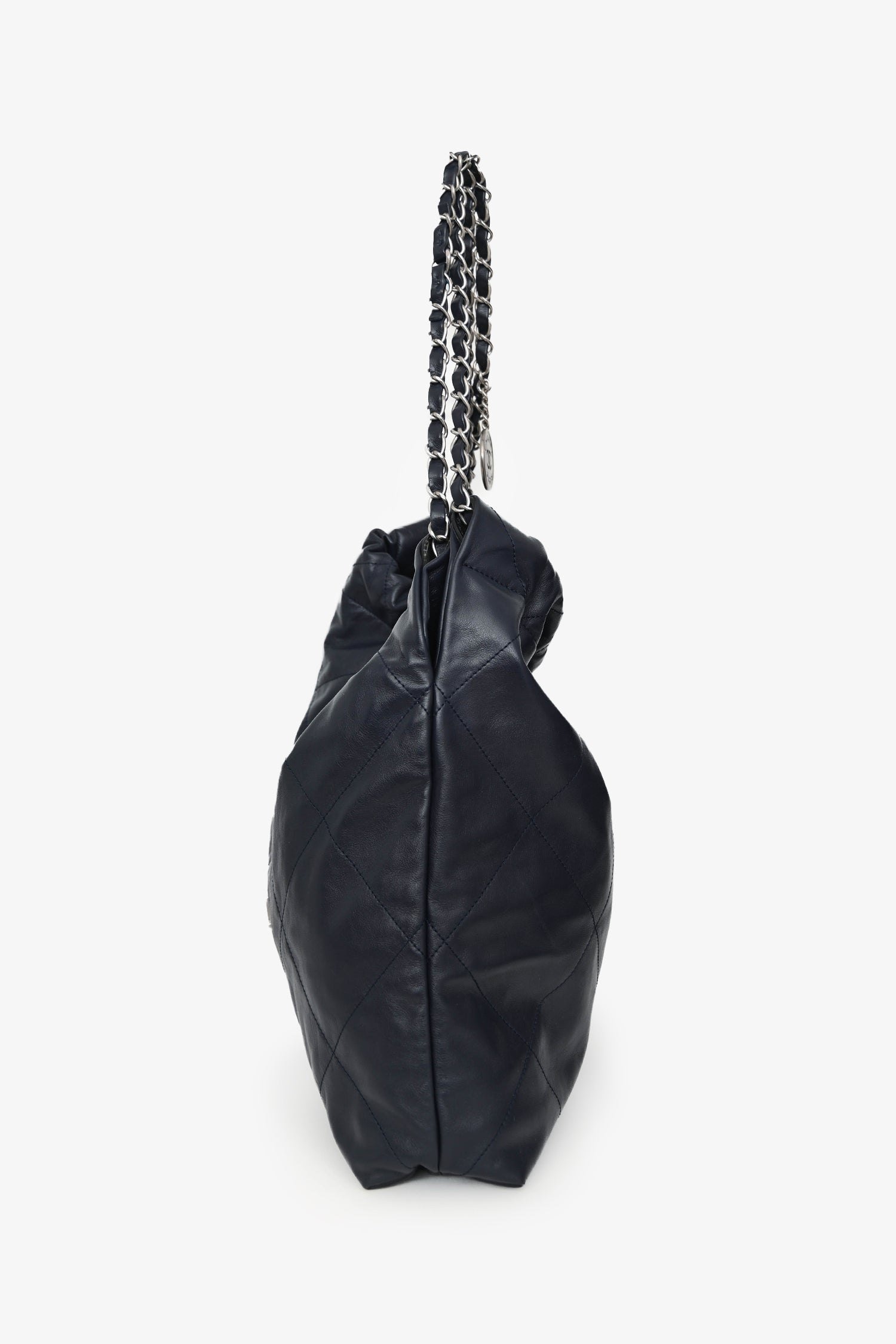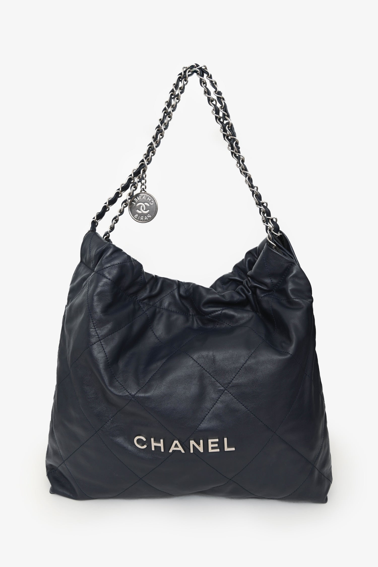Pre-Loved Chanel™ Navy Leather 22 Small Tote. Magnetic snap closure. Leather-and-chain shoulder straps with charm detail. Snap closures at the sides. 1 interior compartment with 1 interior zip pocket. Interior removable pouch with a strap. Silver-tone hardware. Tonal stitching.