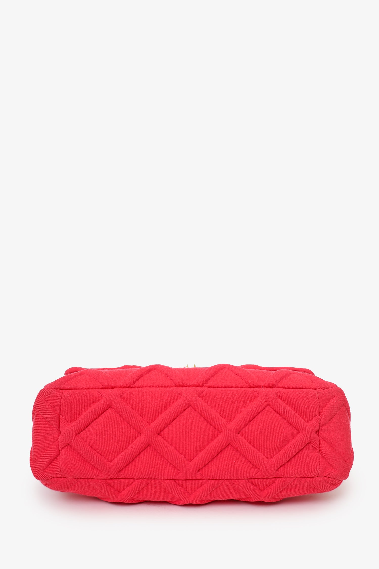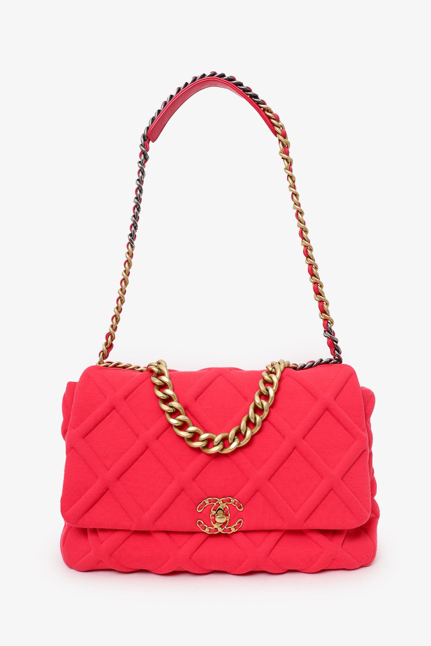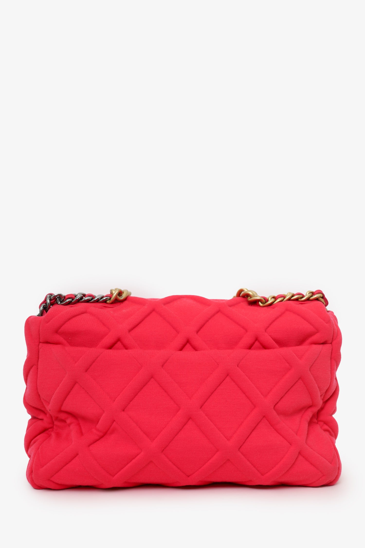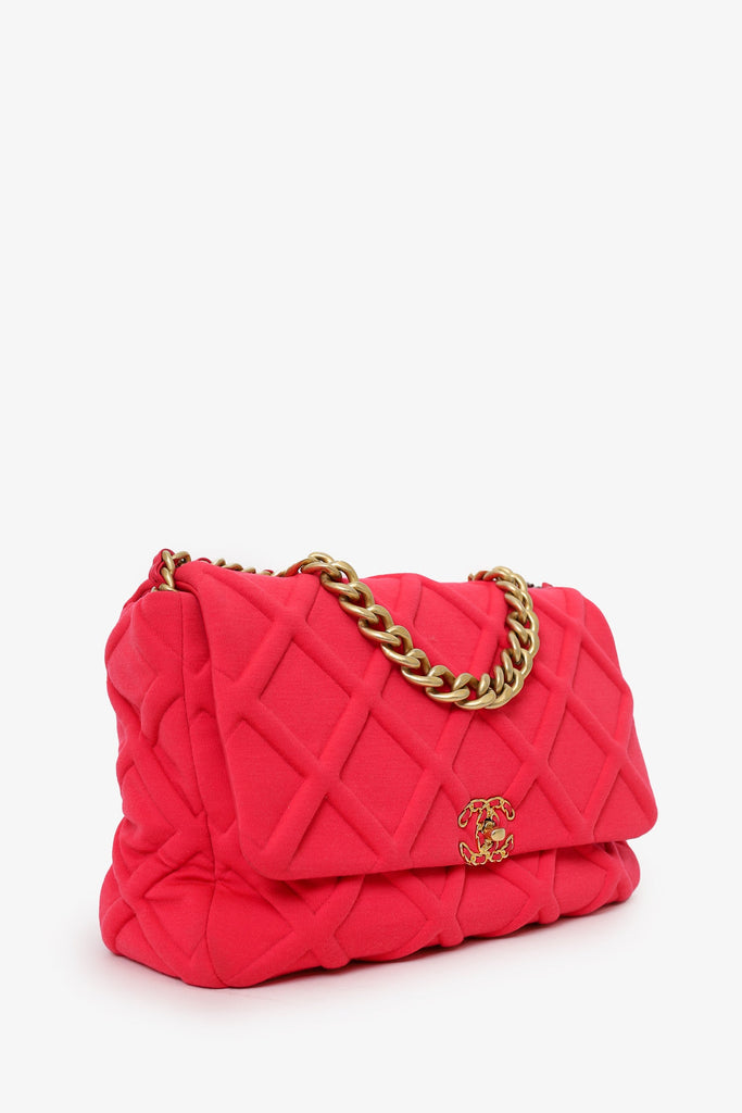 Pre-Loved Chanel Pink Jersey Maxi 19 Flap. Front fold-over flap with turn-lock closure. Chainlink handle and shoulder strap. Lined interior. Single interior zip pocket. Gold and silver-tone hardware. Tonal stitching.