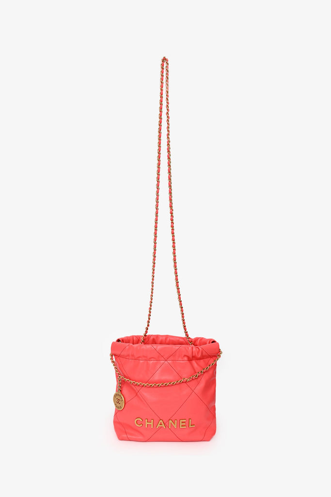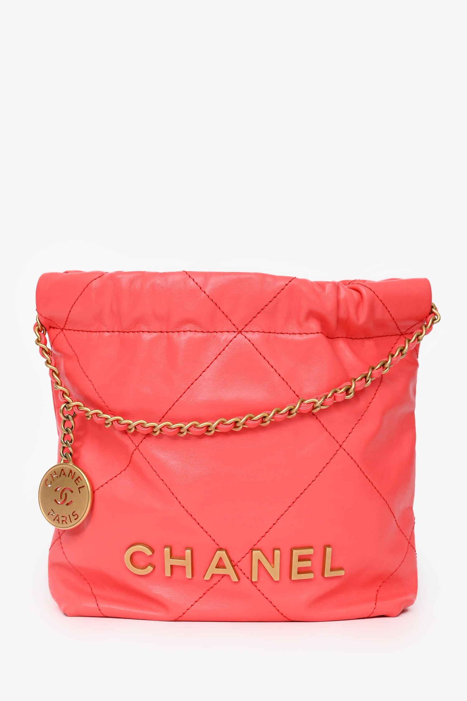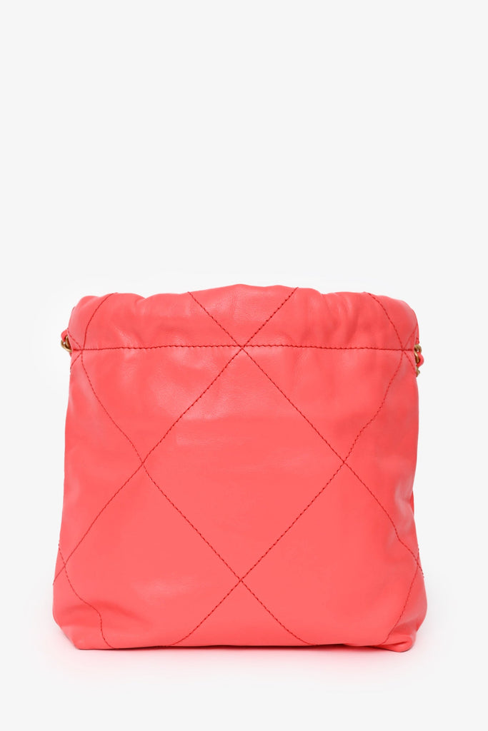 Pre-Loved Chanel™ Pink Mini 22 Hobo. Gold-tone hardware. Leather-threaded chain shoulder strap and top handle. Drawstring closure. Lined interior with single slip pocket. Tonal stitching.