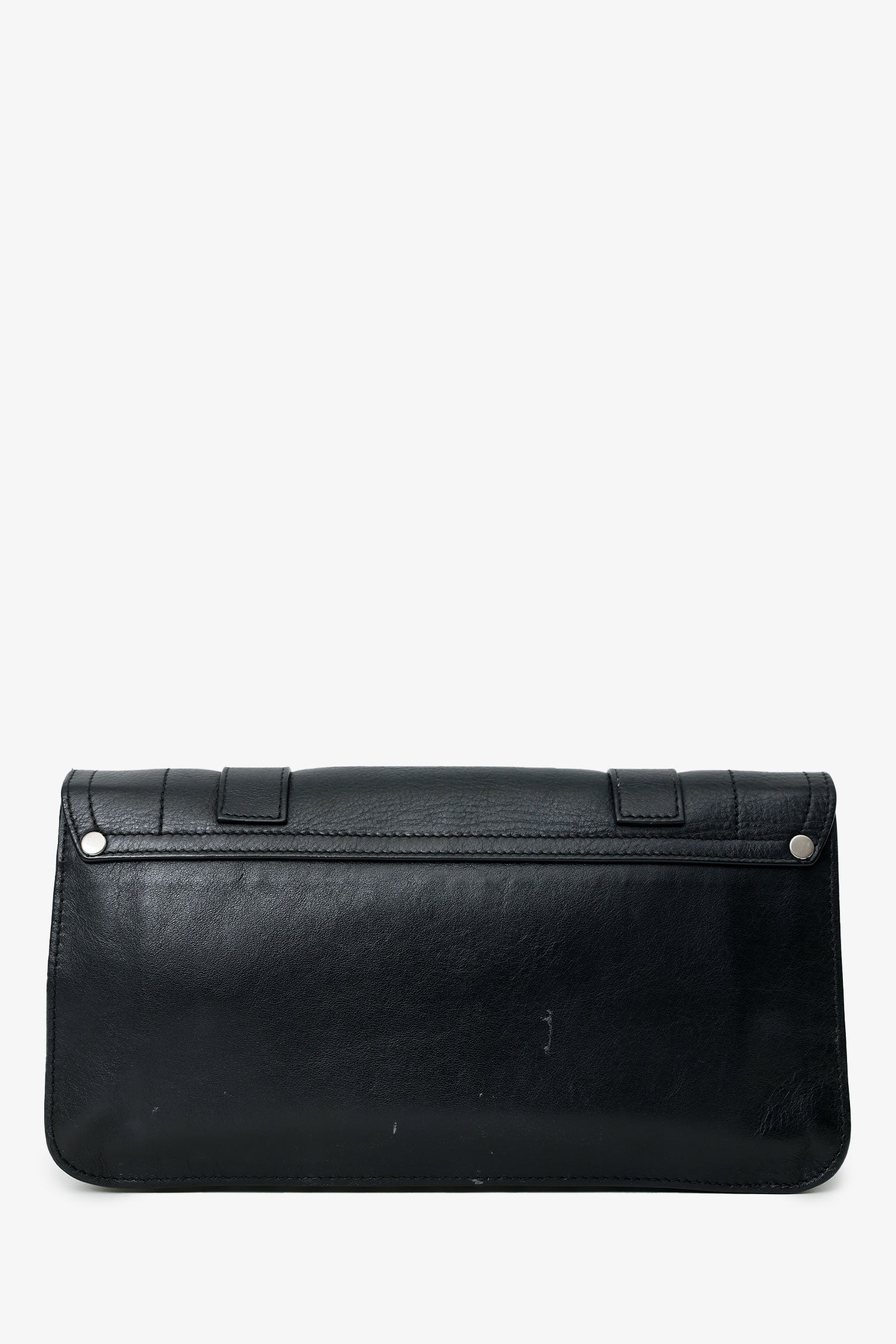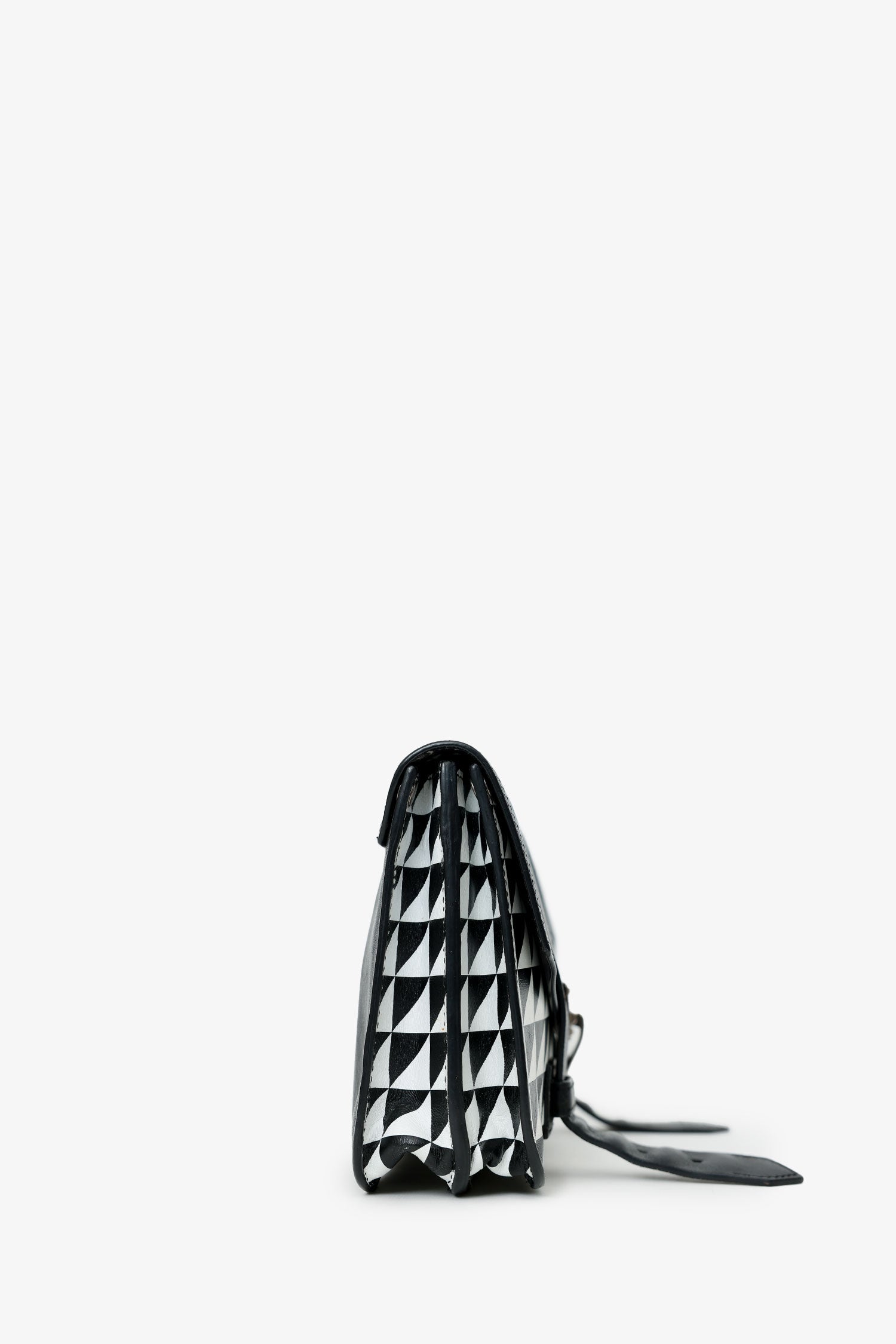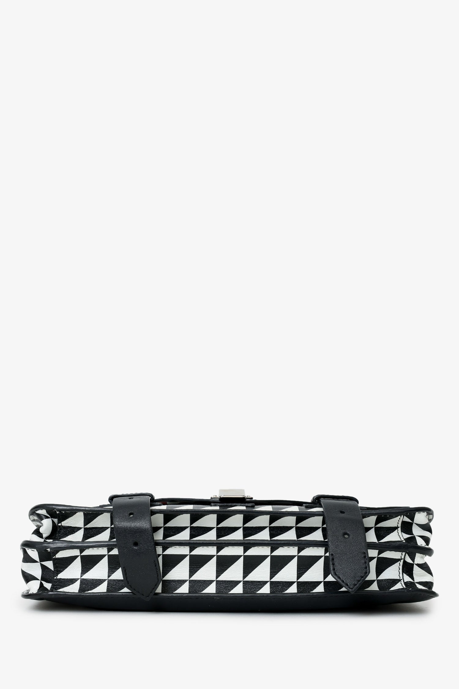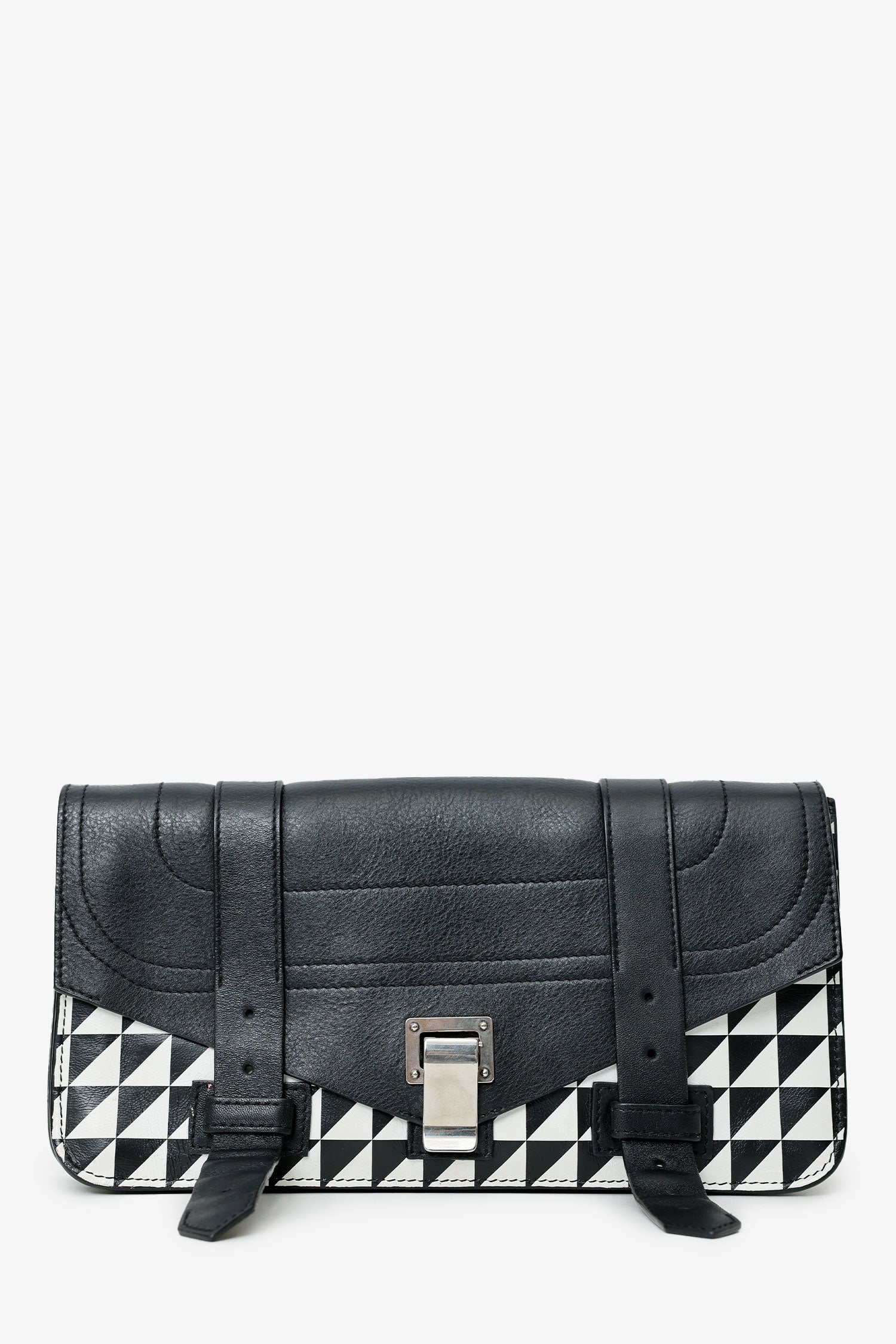 Proenza Schouler Black/White Leather Geometric Print Clutch. Front fold-over flap with clasp closure. Lined interior. 2 interior compartments; front compartment is 1 large open pocket. Back compartment with one rear wall pocket with zip closure. Silver-tone hardware. Tonal stitching.