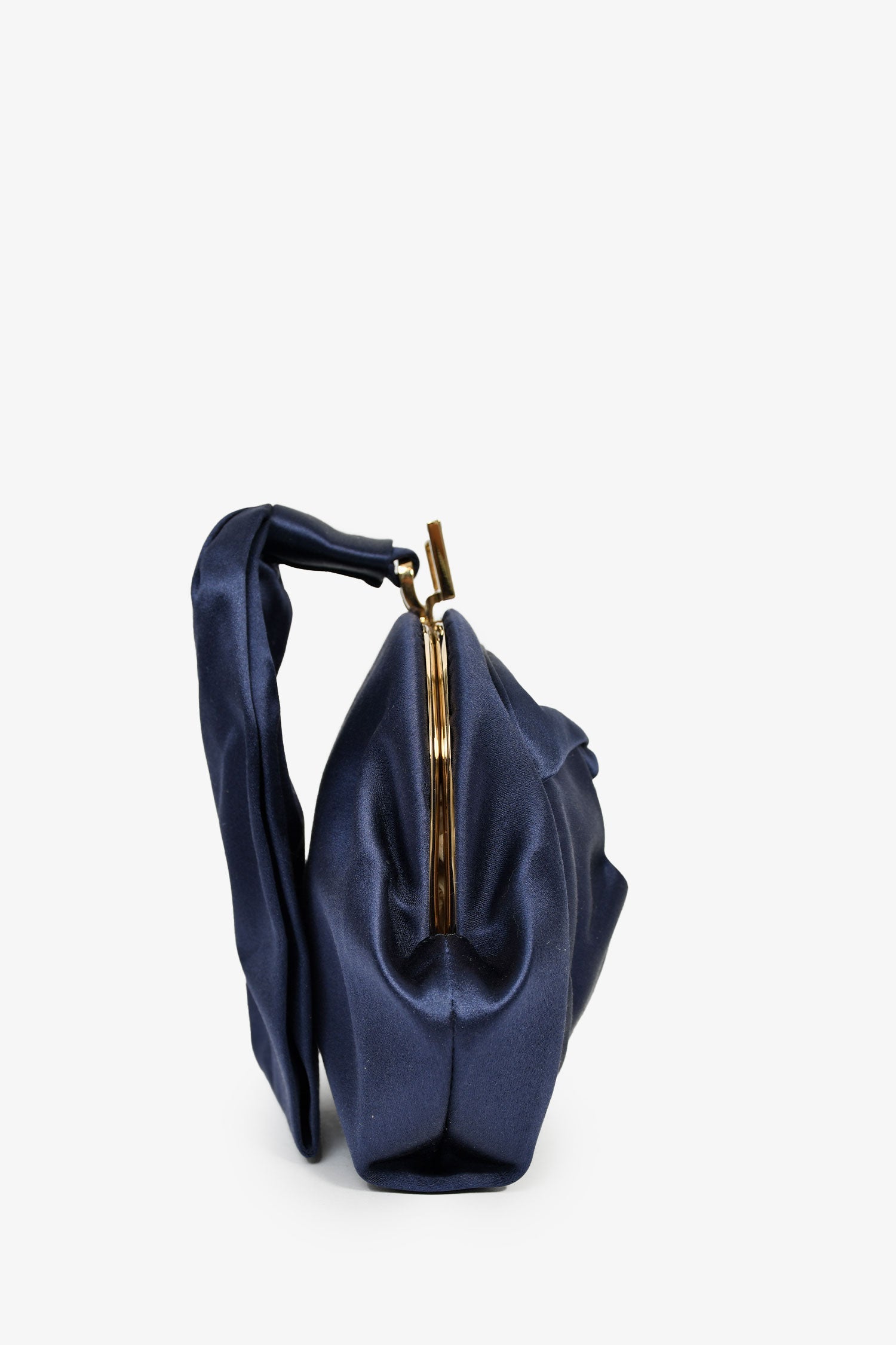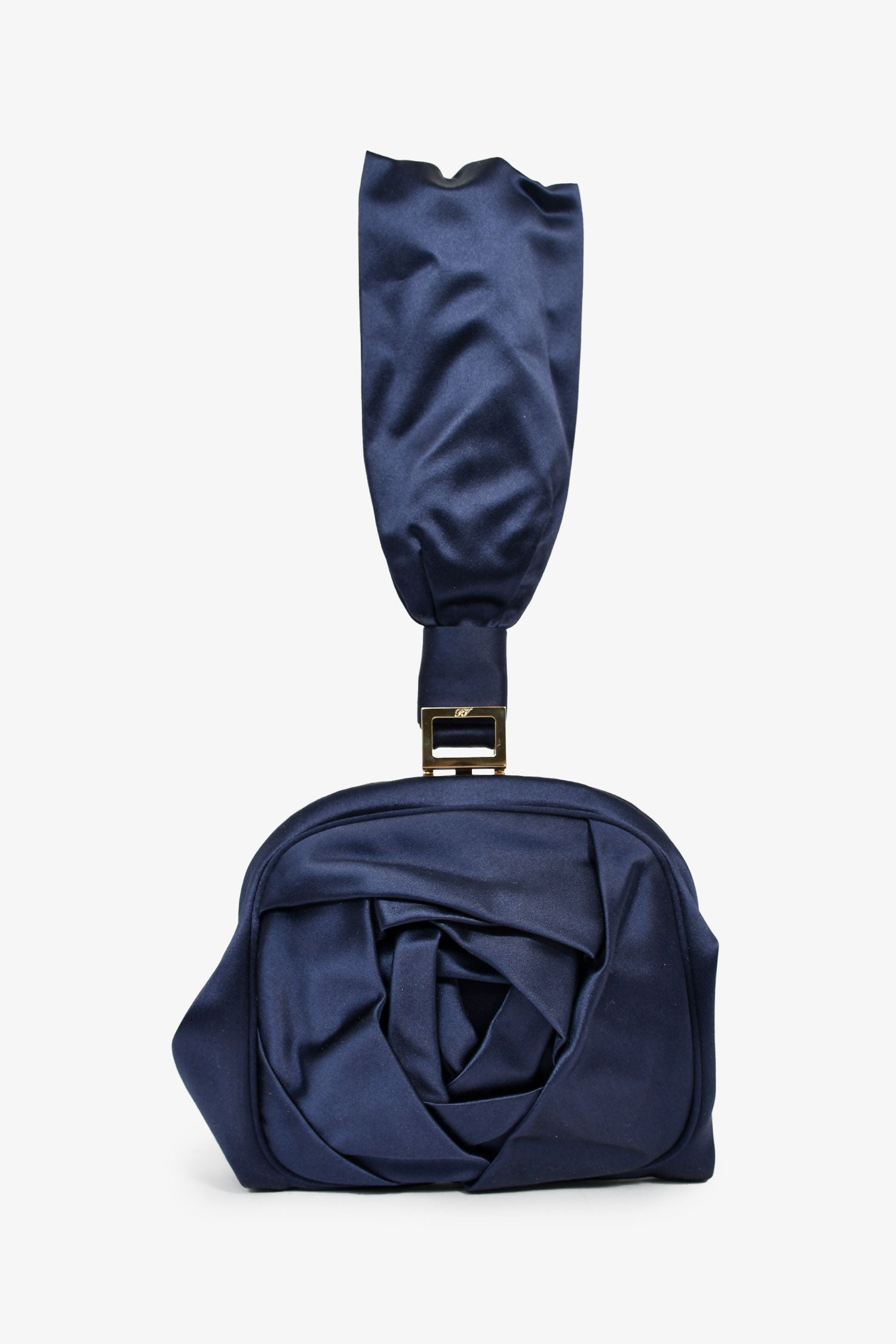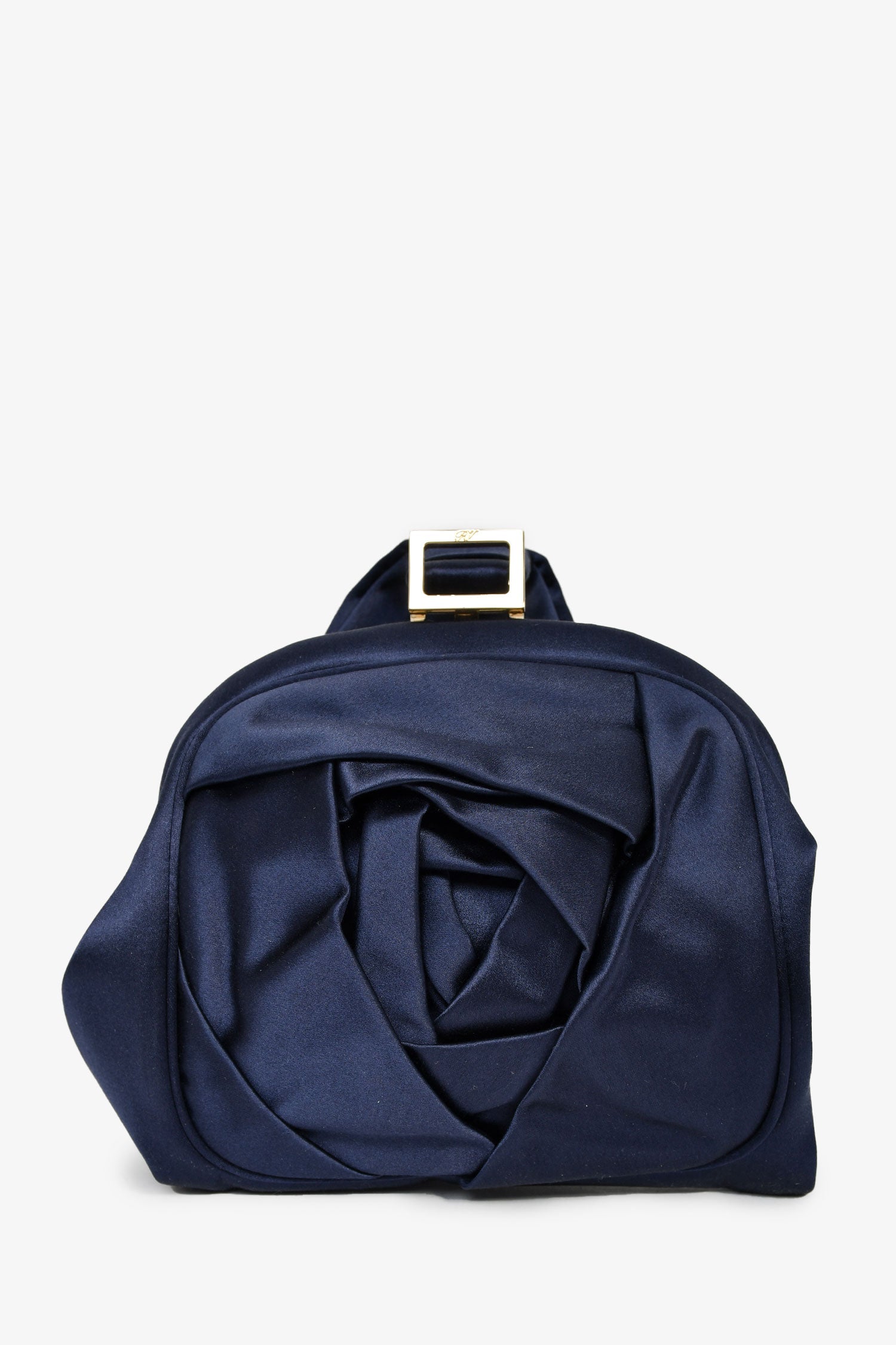 Roger Vivier Navy Blue Satin Top Handle Bag. Top kiss-lock closure. Textile-lined interior. Single interior wall slip pocket. Gold-tone hardware. Tonal stitching.