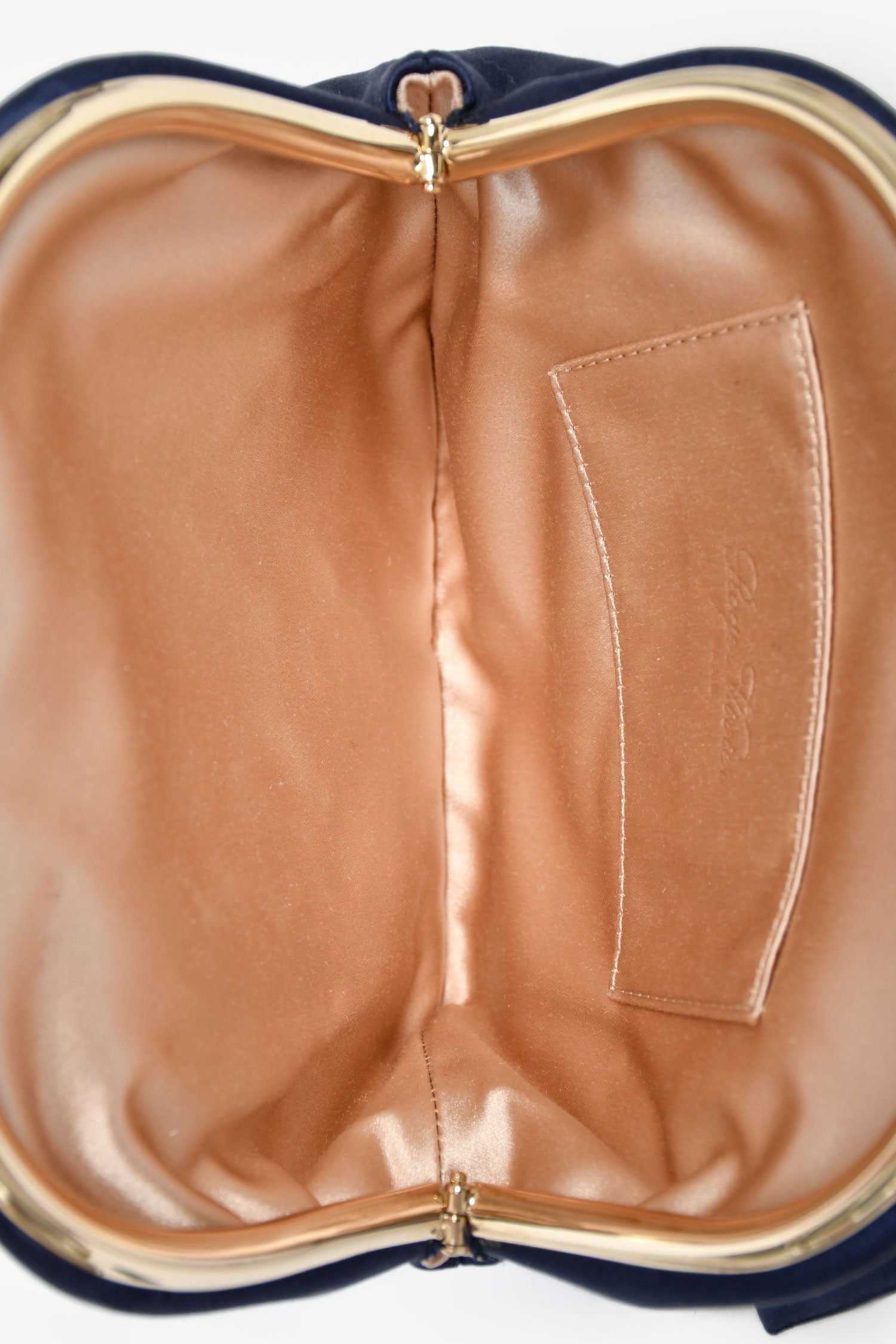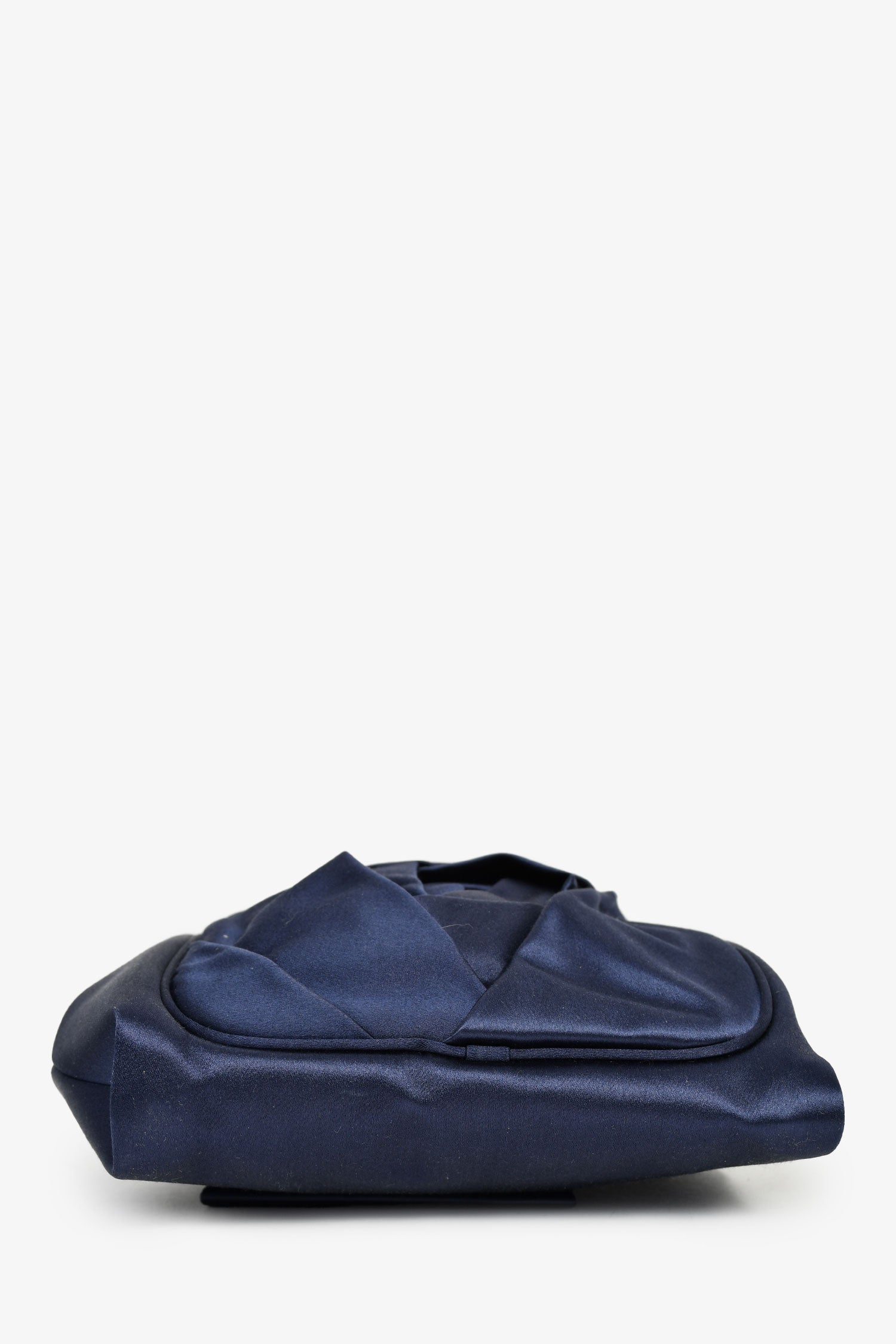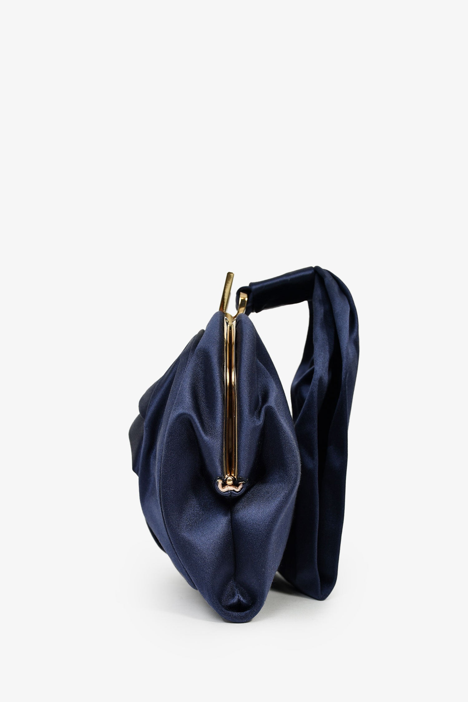 Roger Vivier Navy Blue Satin Top Handle Bag. Top kiss-lock closure. Textile-lined interior. Single interior wall slip pocket. Gold-tone hardware. Tonal stitching.