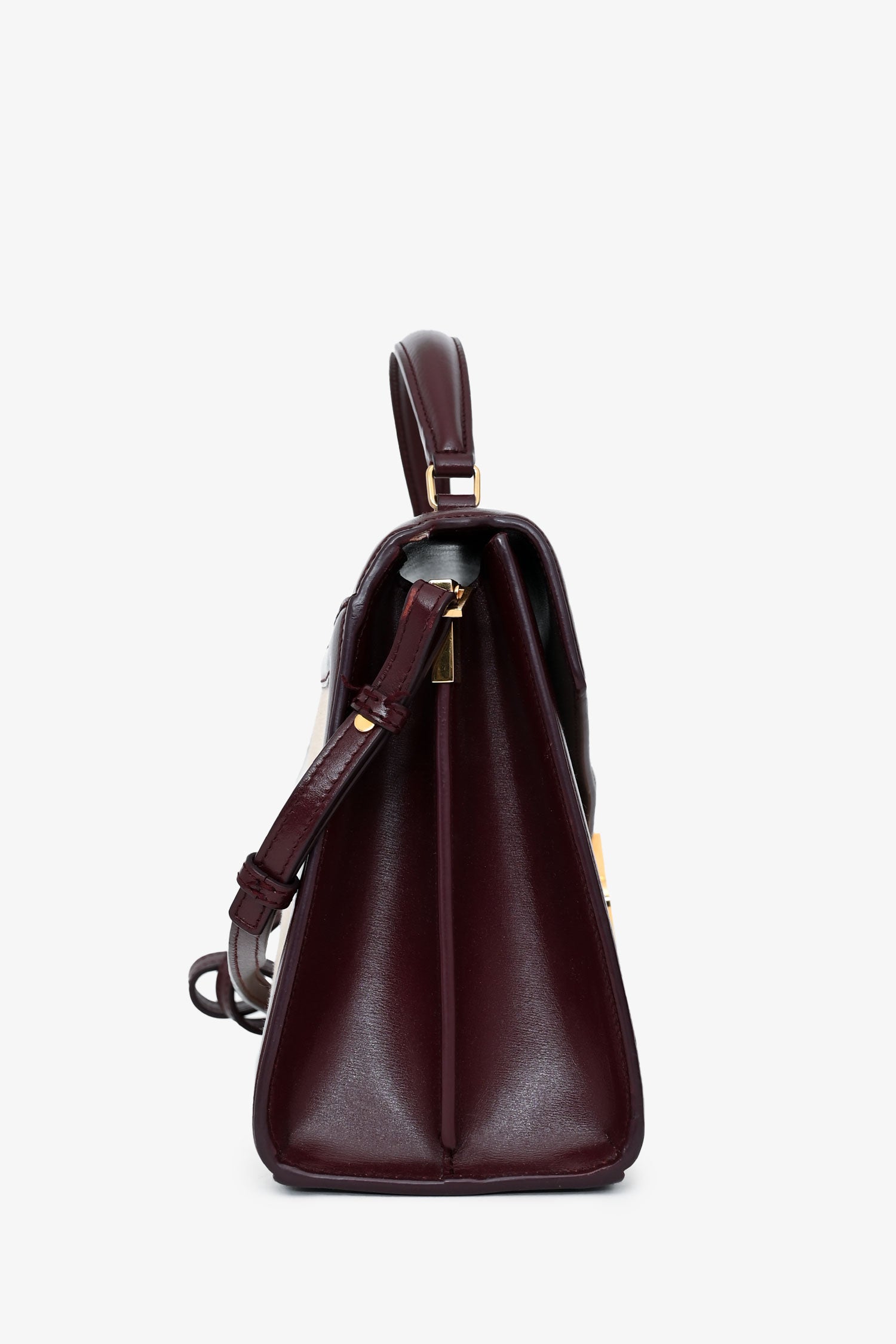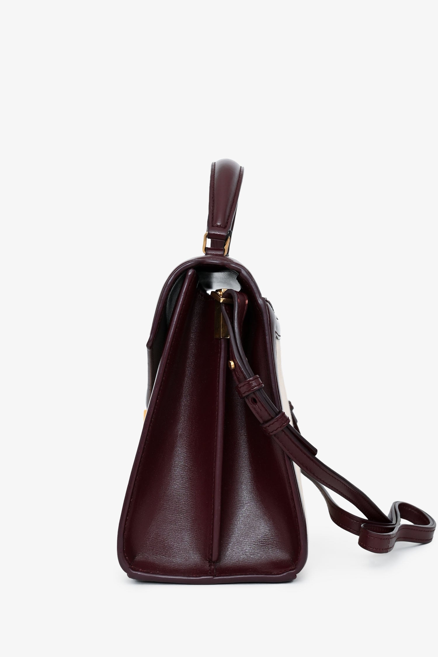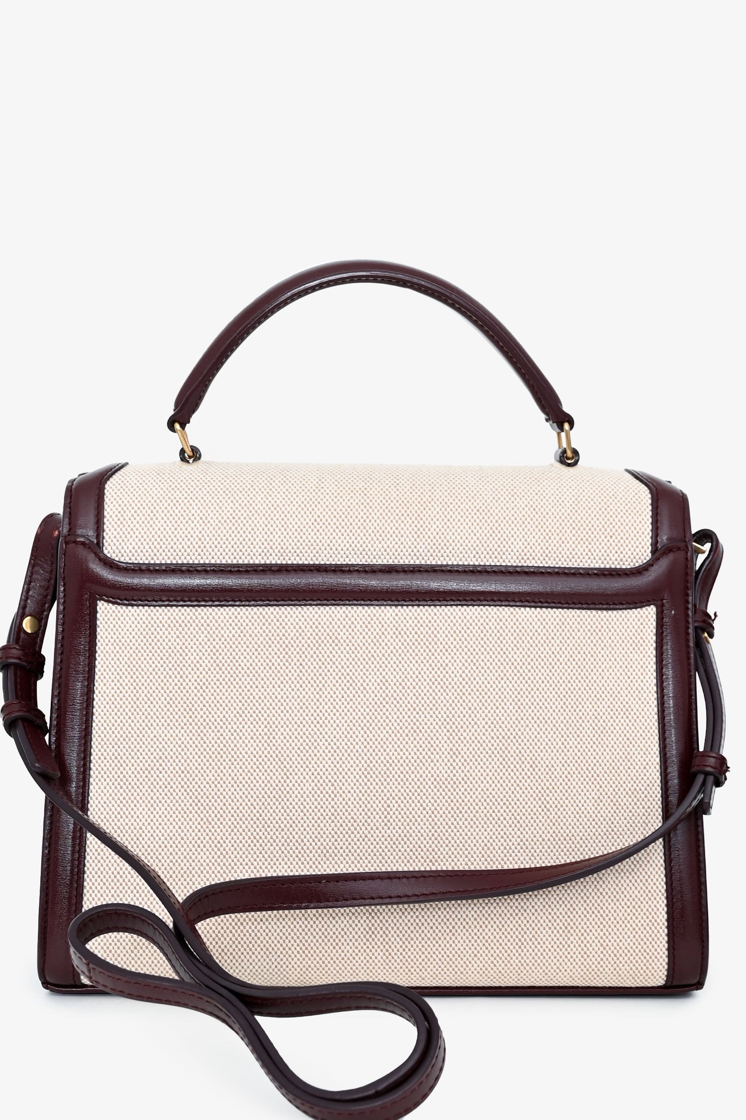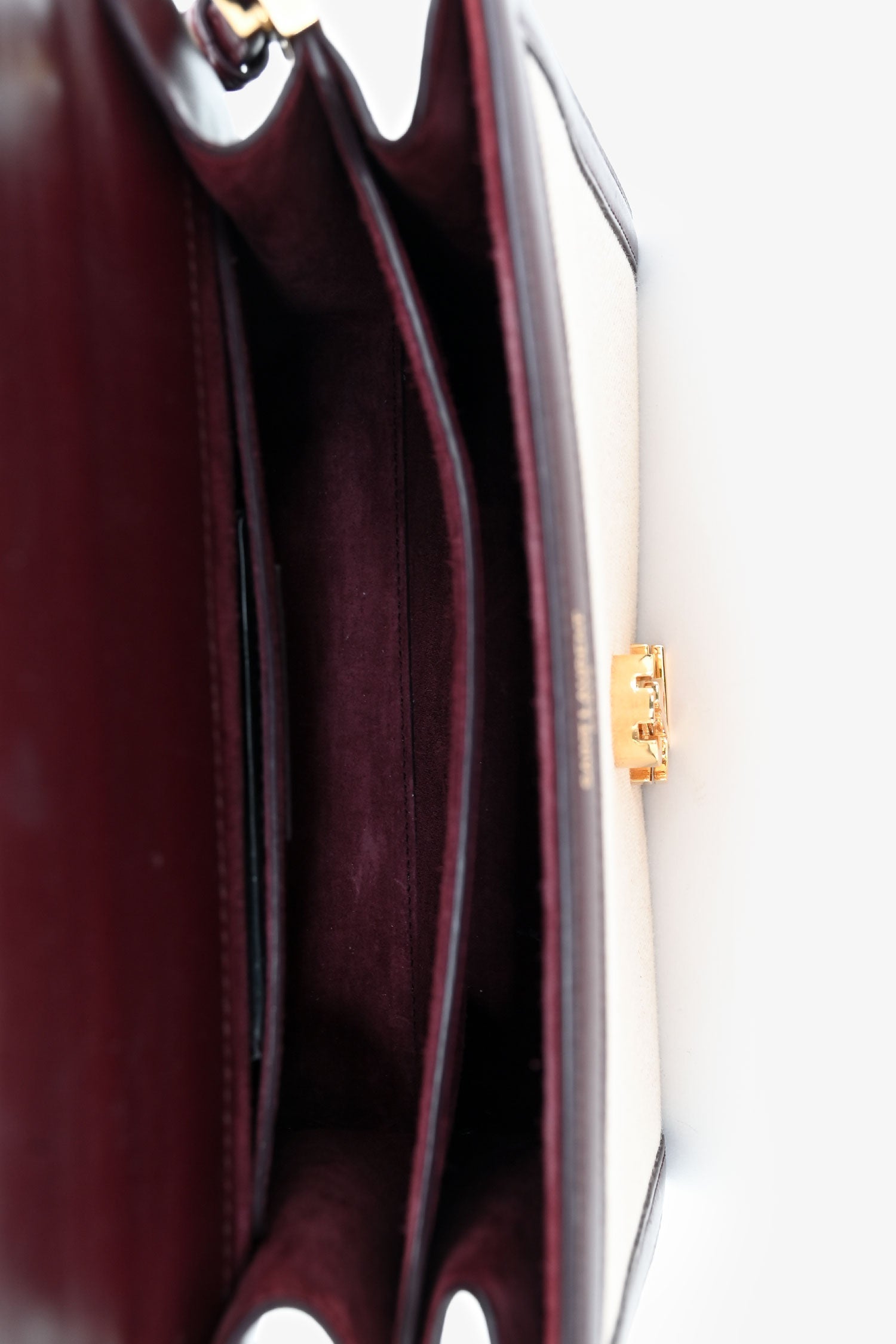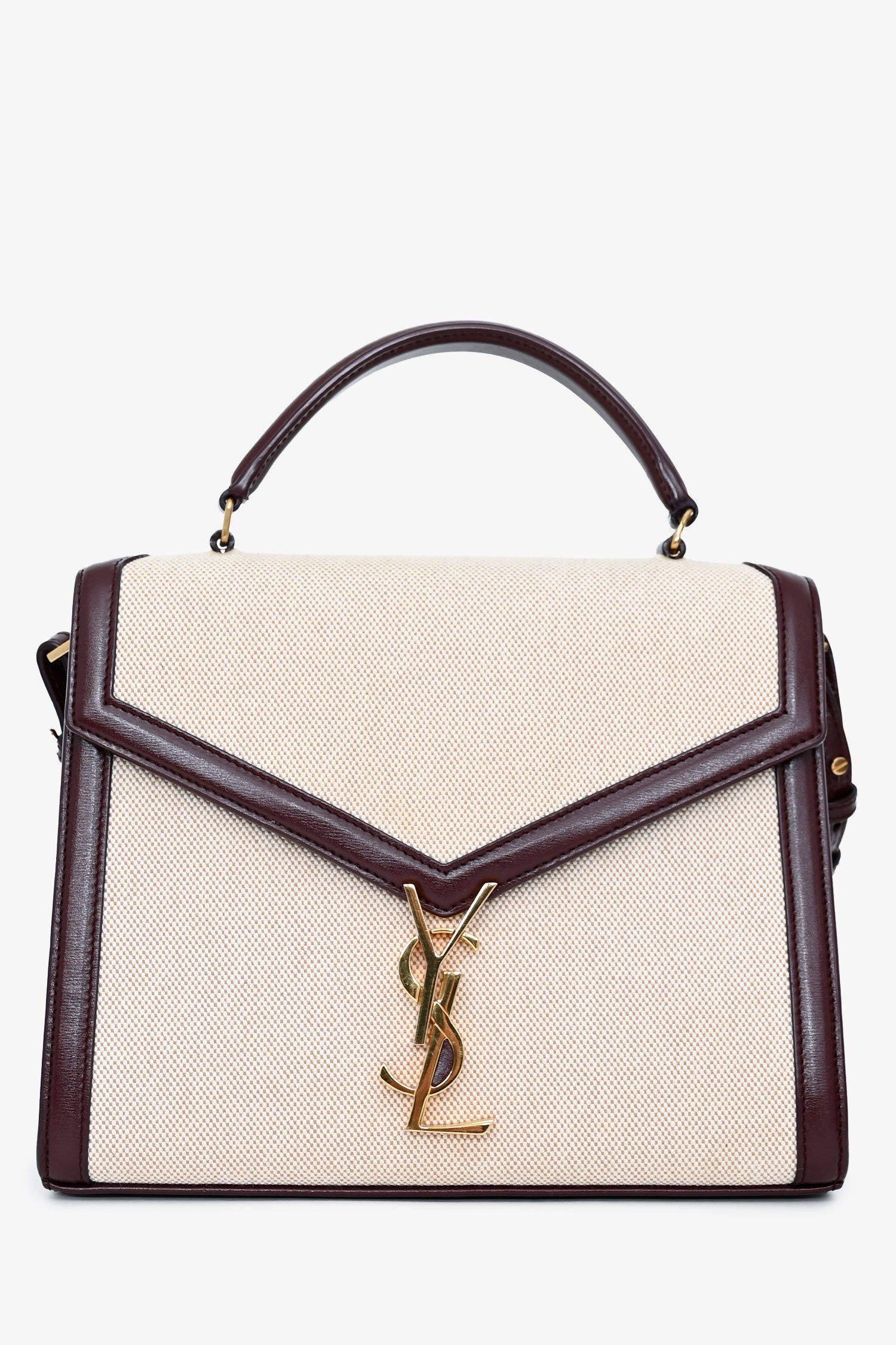 Saint Laurent 2020 Cream/Burgundy Canvas Leather-Trimmed Medium Cassandra Top Handle. Flap closure with YSL monogram twist-lock fastening. Single top handle and detachable, adjustable shoulder strap. 1 exterior back slip pocket; 2 interior compartments; 1 interior slip pocket. Gold-tone hardware. Tonal stitching.