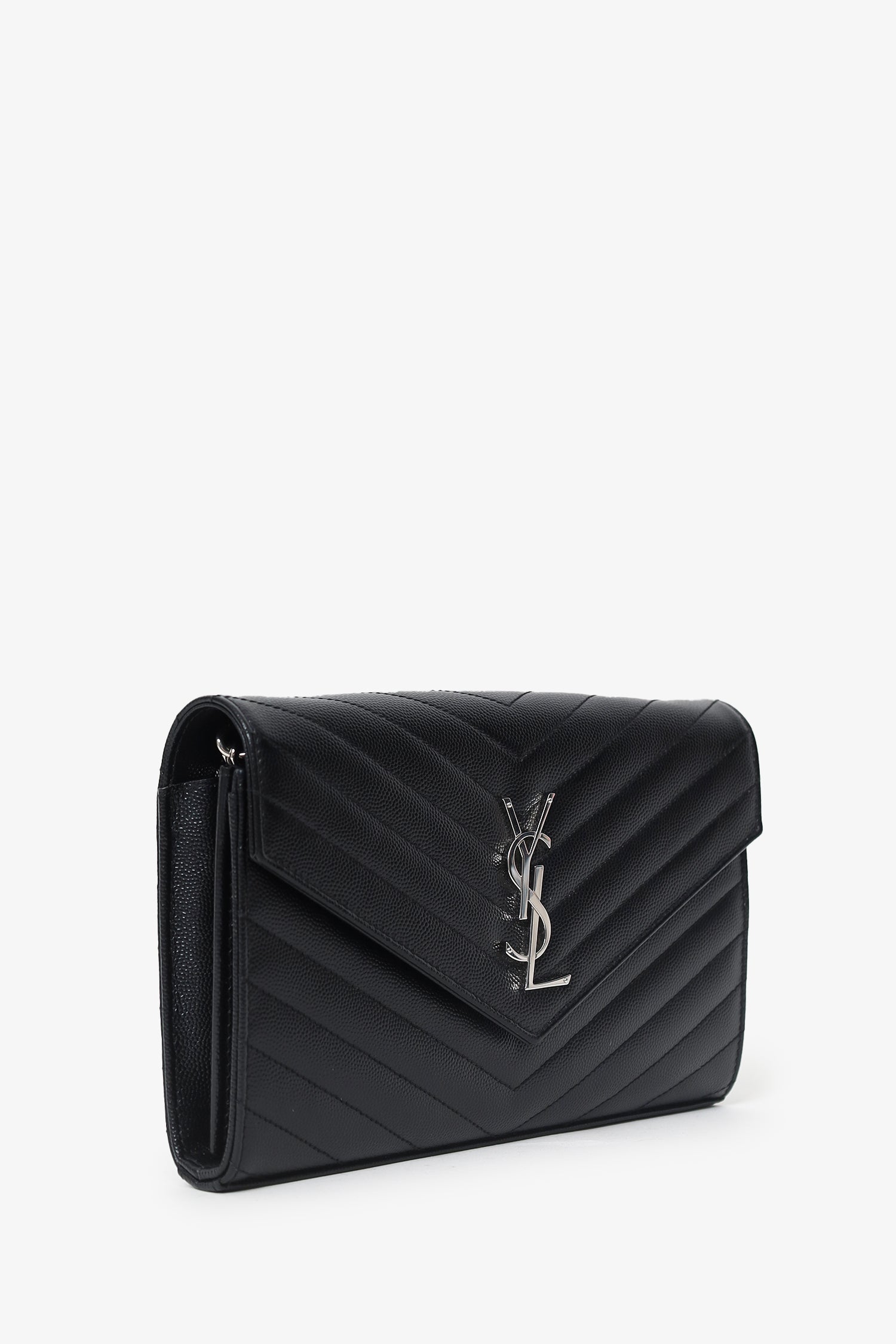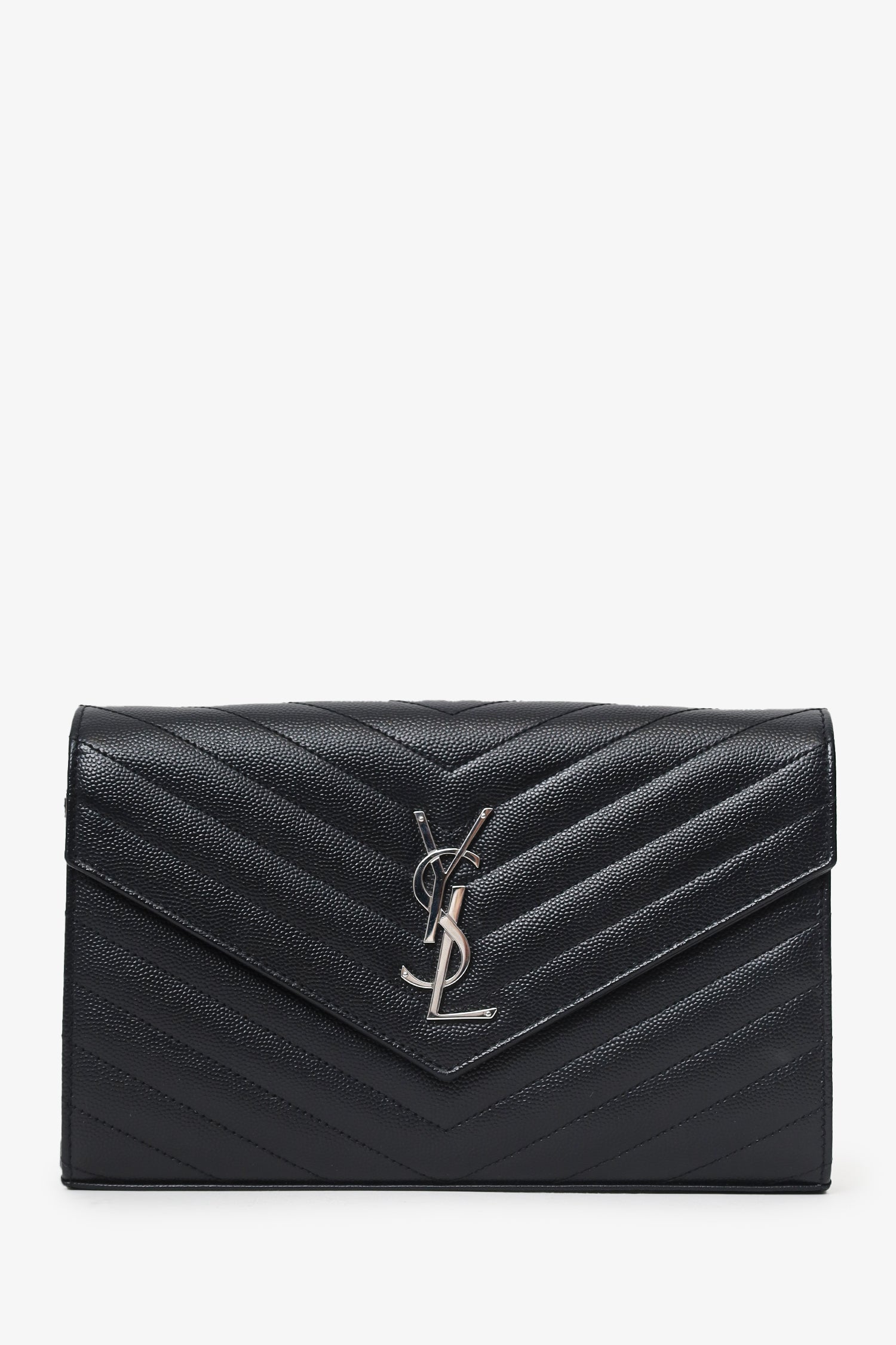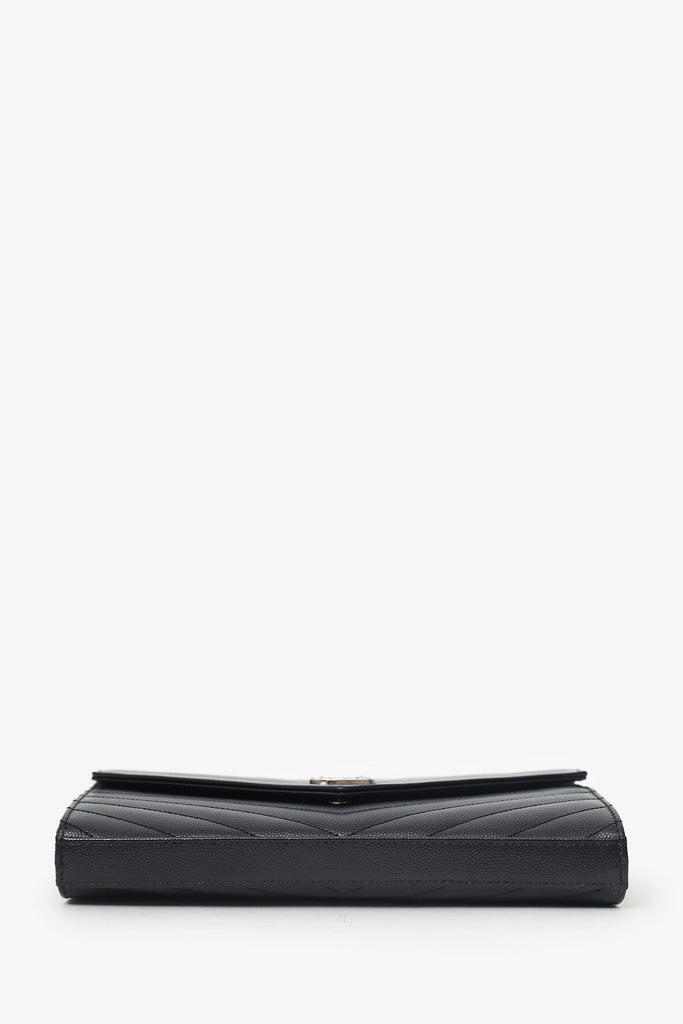 Saint Laurent Black Chevron Leather Envelope Wallet On Chain. Front fold-over flap with snap-button closure. Removable chainlink shoulder strap. Leather lined interior with 14 pockets; 10 card slots, 1 bill slot, 2 slip, and 1 zip. Silver-tone hardware. Tonal stitching.