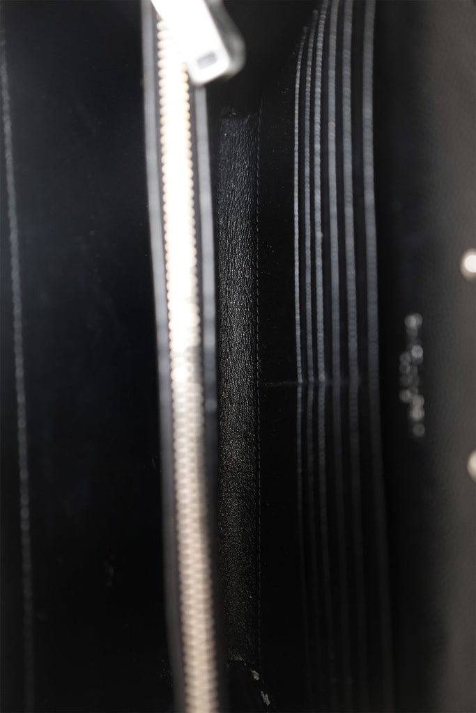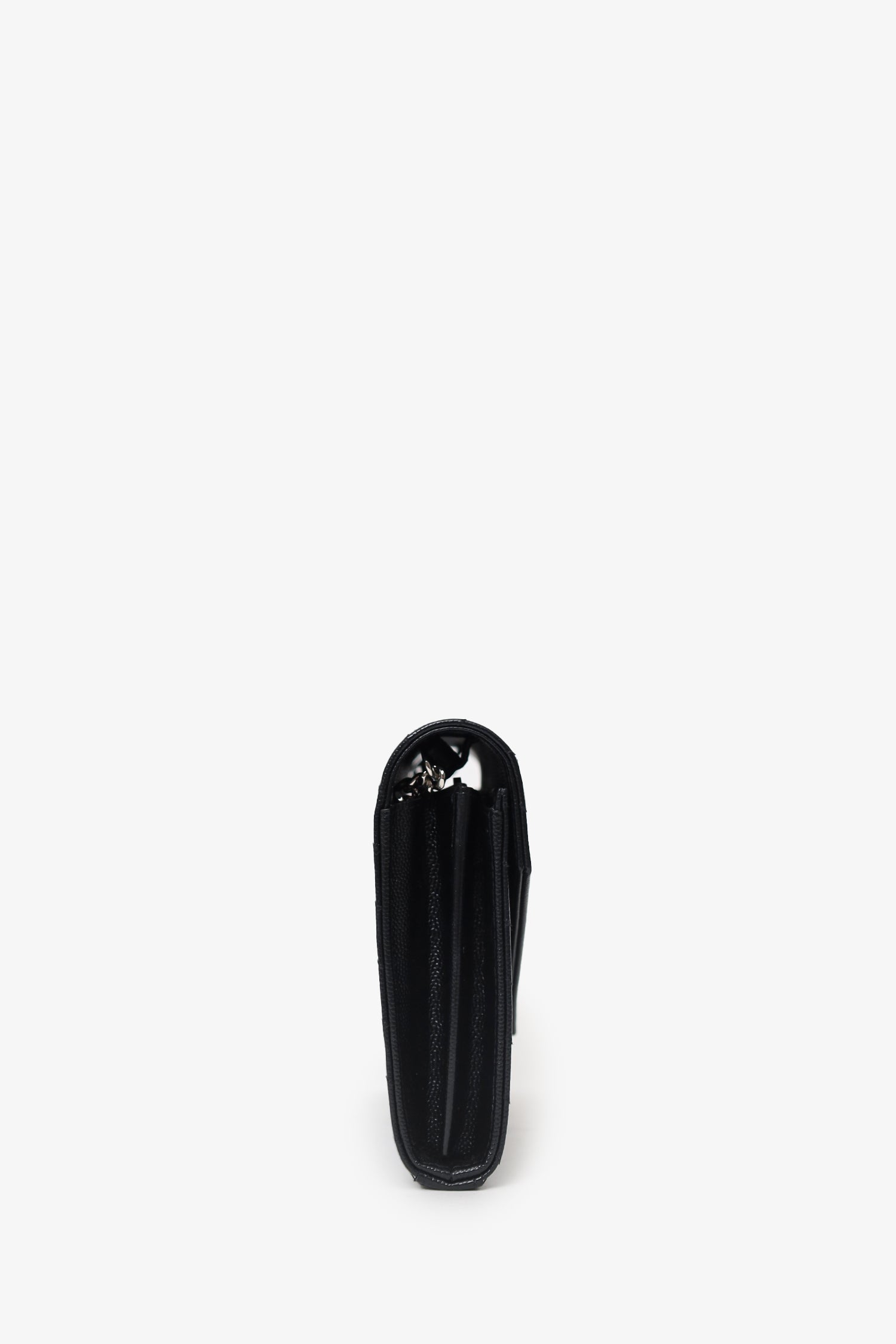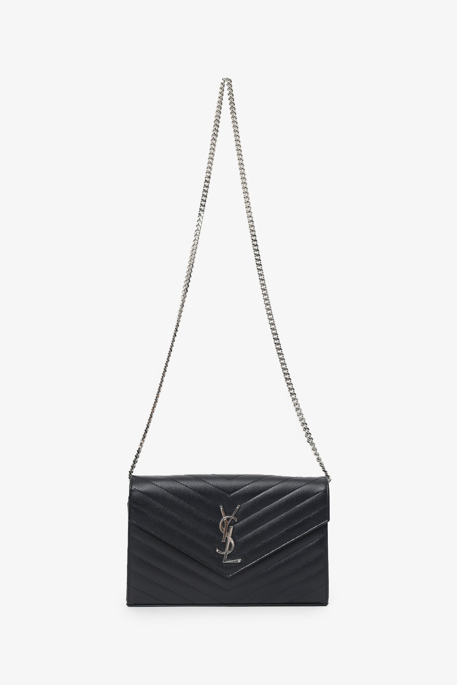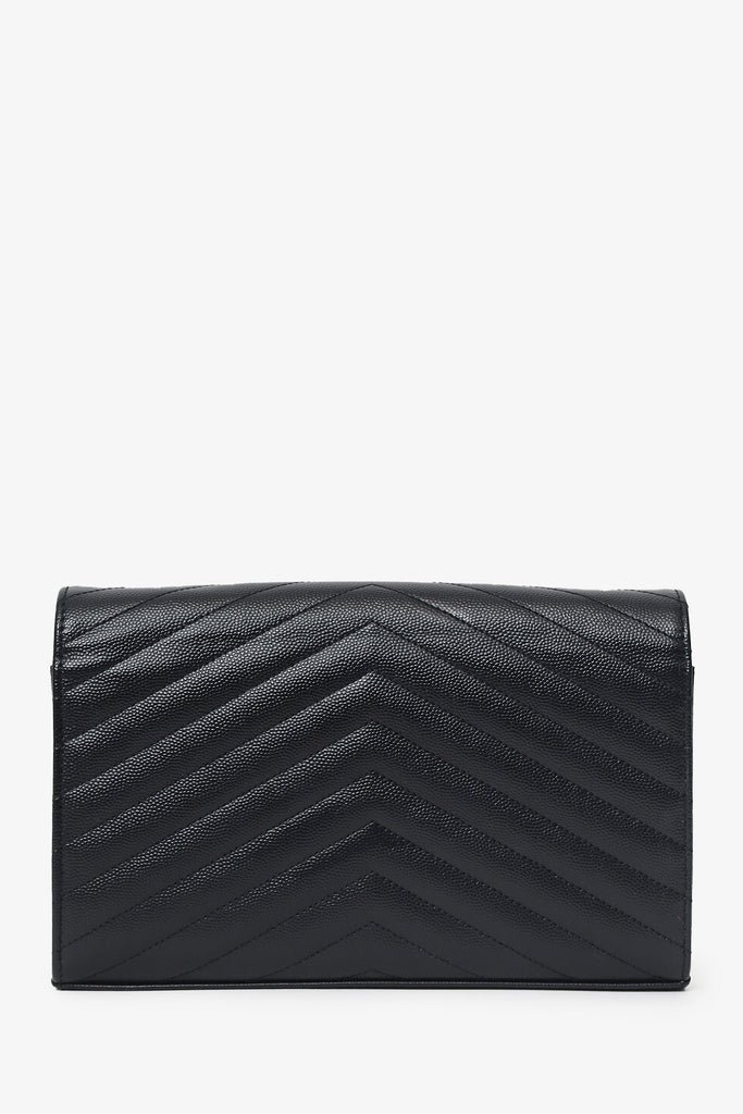 Saint Laurent Black Chevron Leather Envelope Wallet On Chain. Front fold-over flap with snap-button closure. Removable chainlink shoulder strap. Leather lined interior with 14 pockets; 10 card slots, 1 bill slot, 2 slip, and 1 zip. Silver-tone hardware. Tonal stitching.