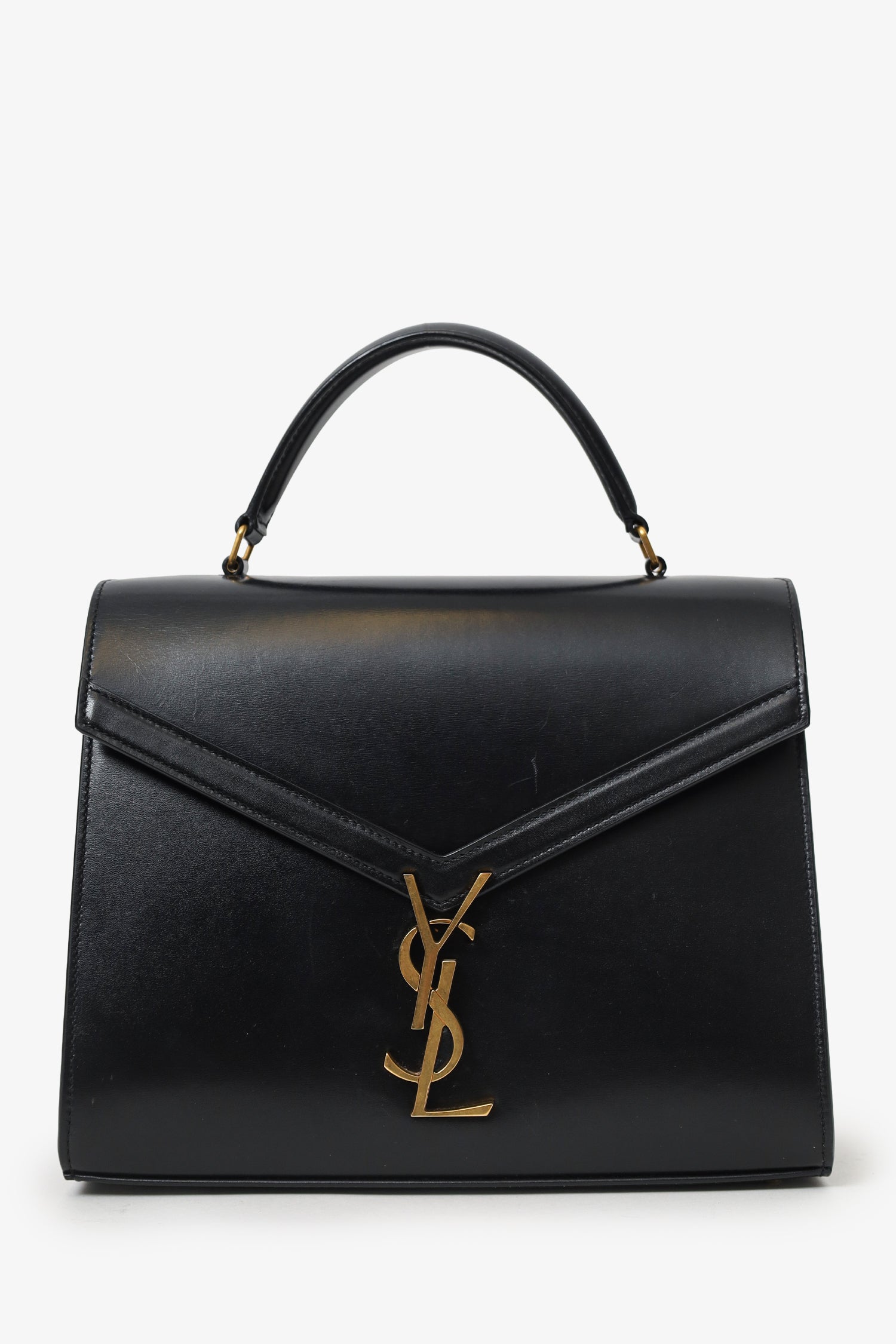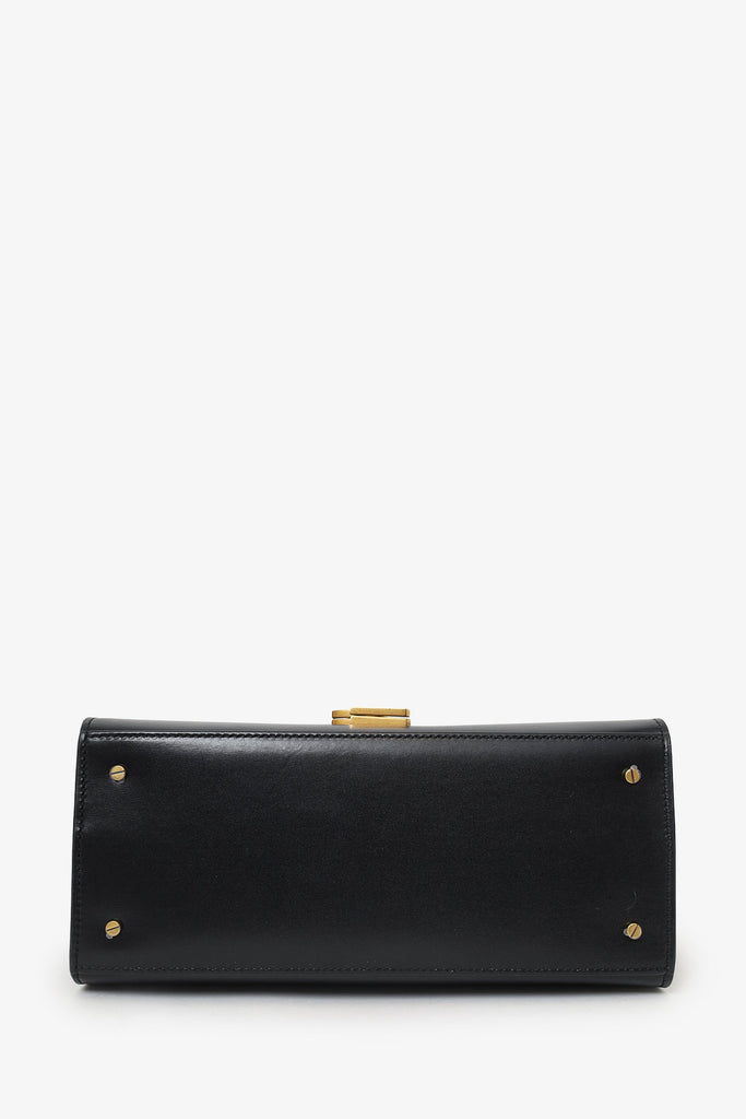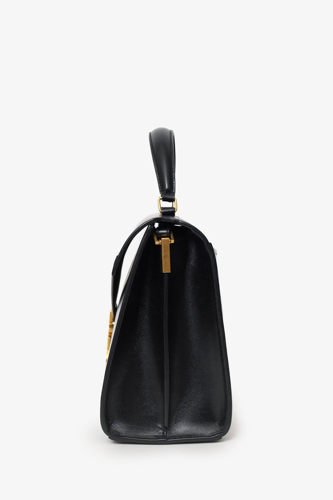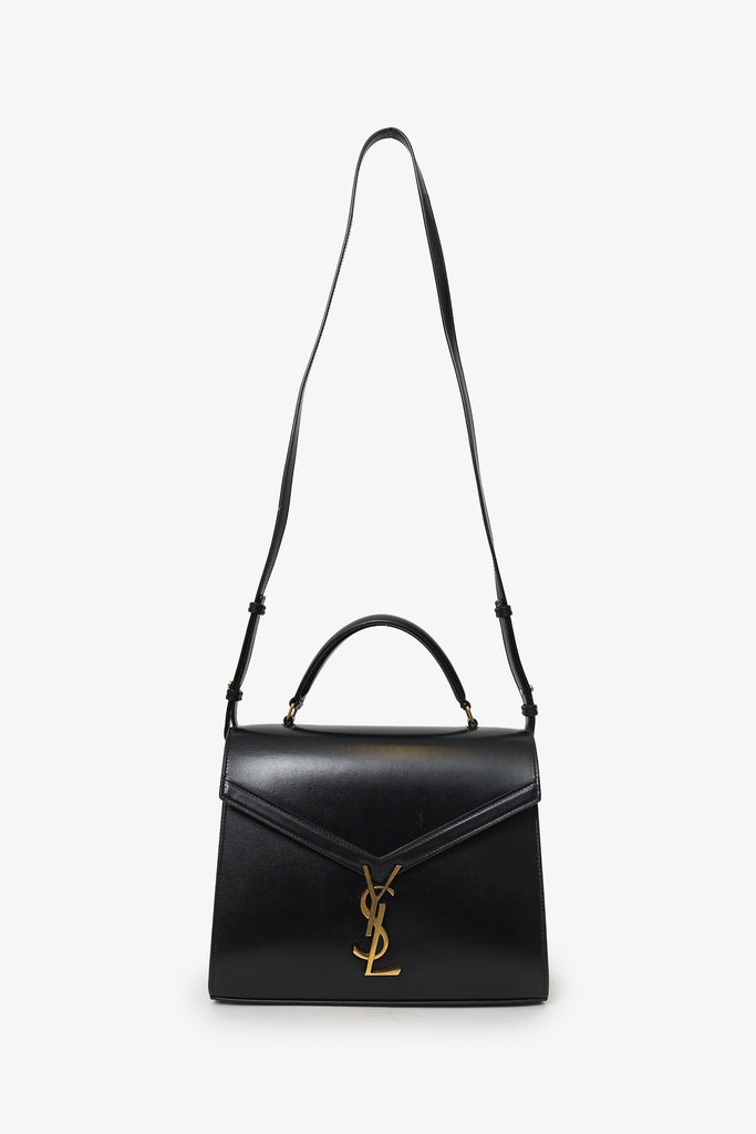 Saint Laurent Black Leather Cassandra Medium Top Handle with Strap. Front fold-over flap with flip-lock closure. Single top handle. Adjustable crossbody strap with push-pin closure. Rear exterior slip pocket. Protective base studs. 3 interior slip pockets. Gold-tone hardware. Tonal stitching.