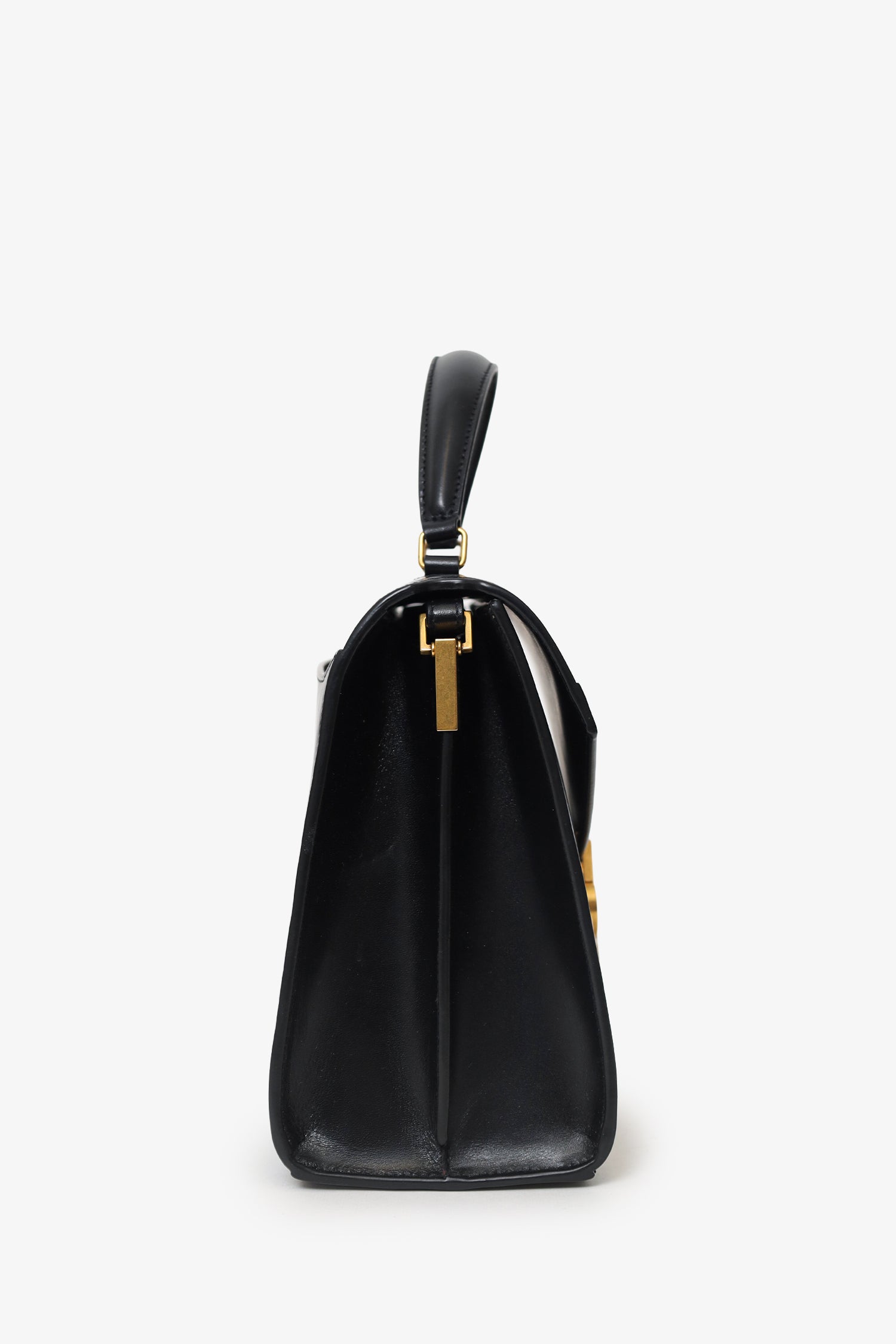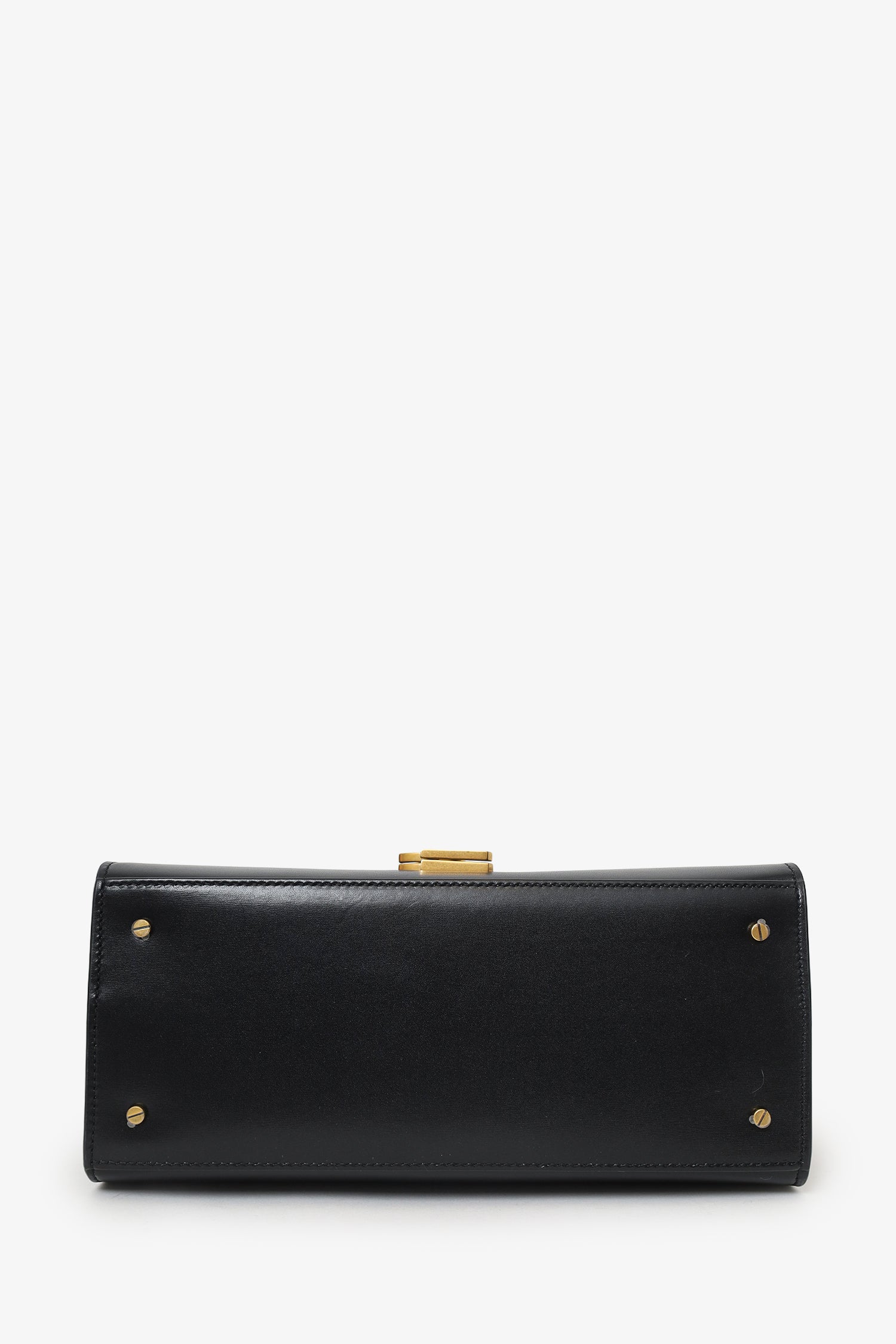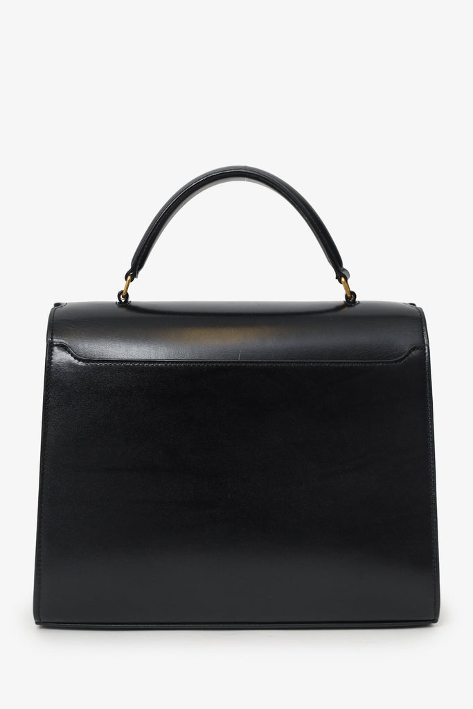 Saint Laurent Black Leather Cassandra Medium Top Handle with Strap. Front fold-over flap with flip-lock closure. Single top handle. Adjustable crossbody strap with push-pin closure. Rear exterior slip pocket. Protective base studs. 3 interior slip pockets. Gold-tone hardware. Tonal stitching.