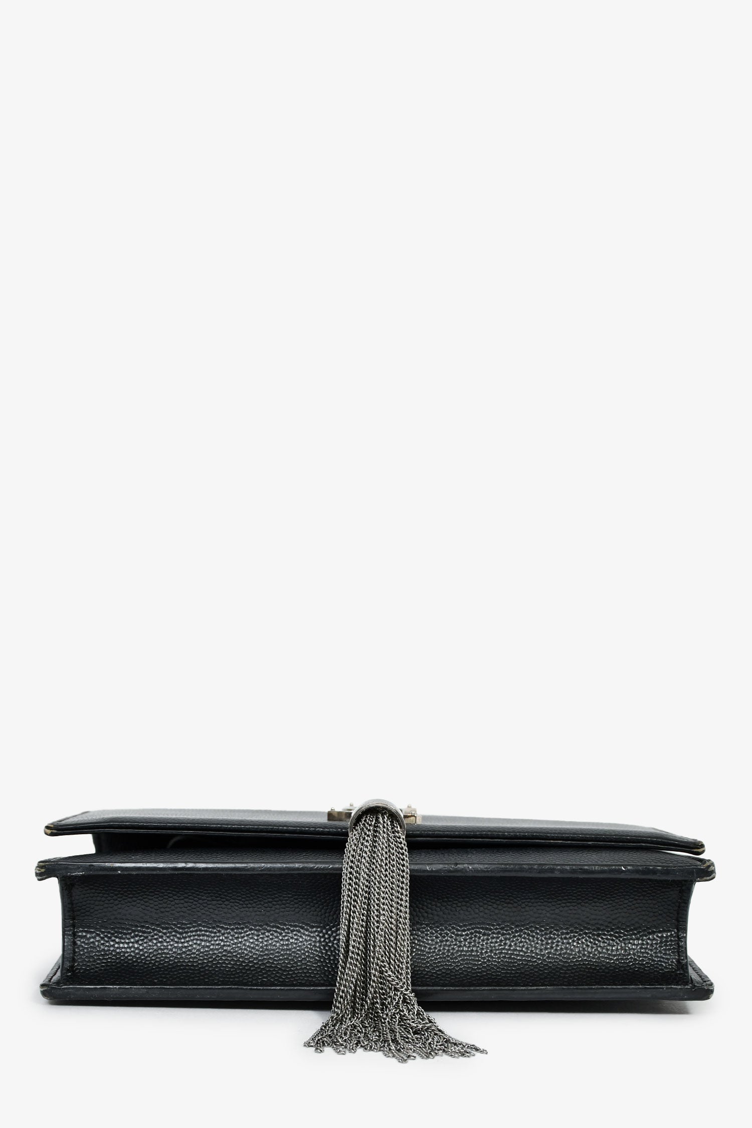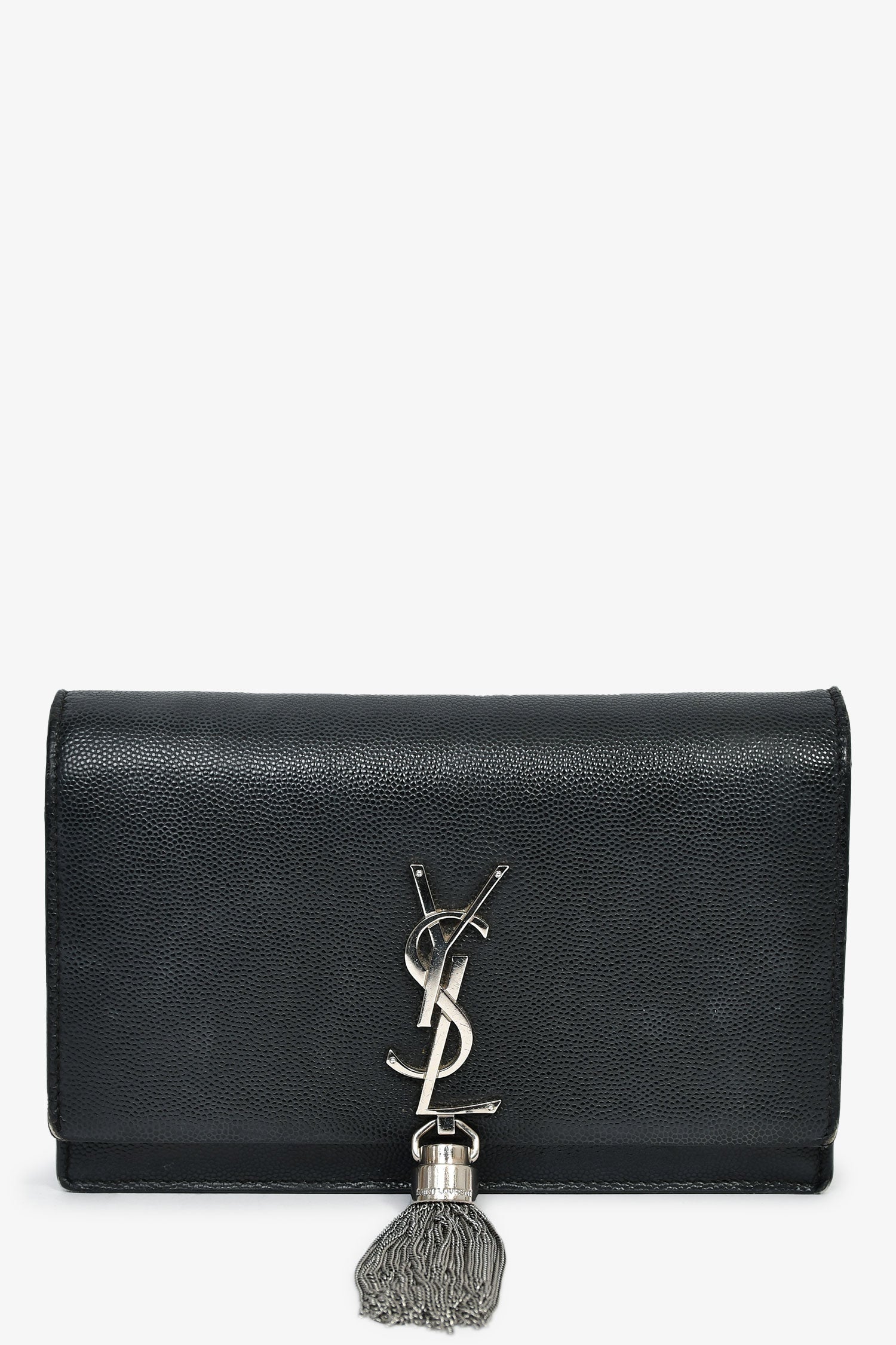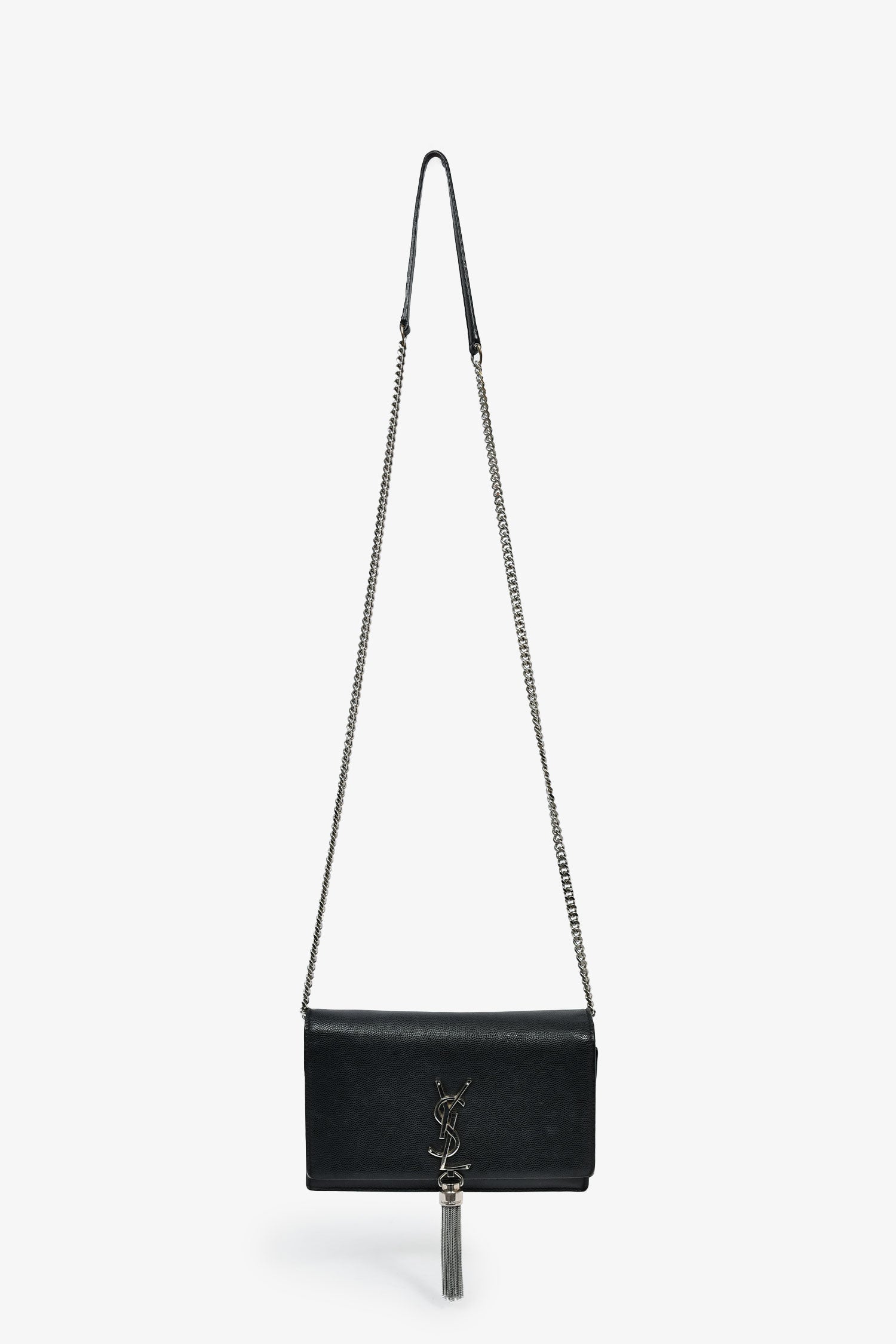 Saint Laurent Black Leather Kate Tassel Small Crossbody. Fold-over flap with a snap closure. Chain-link crossbody strap. 1 bill and 1 zip compartment. 6 card slots. Silver-tone hardware. Tonal stitching.