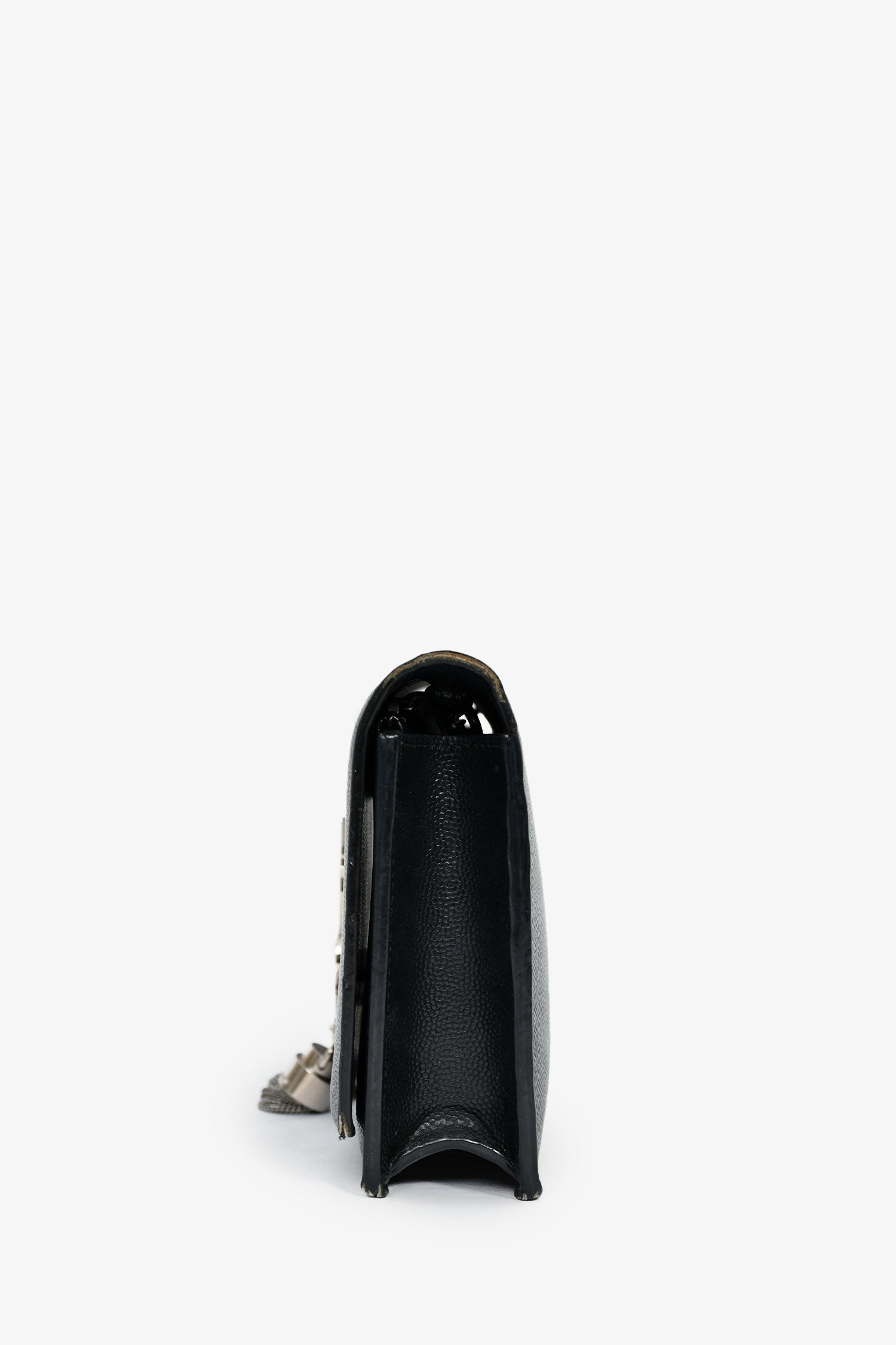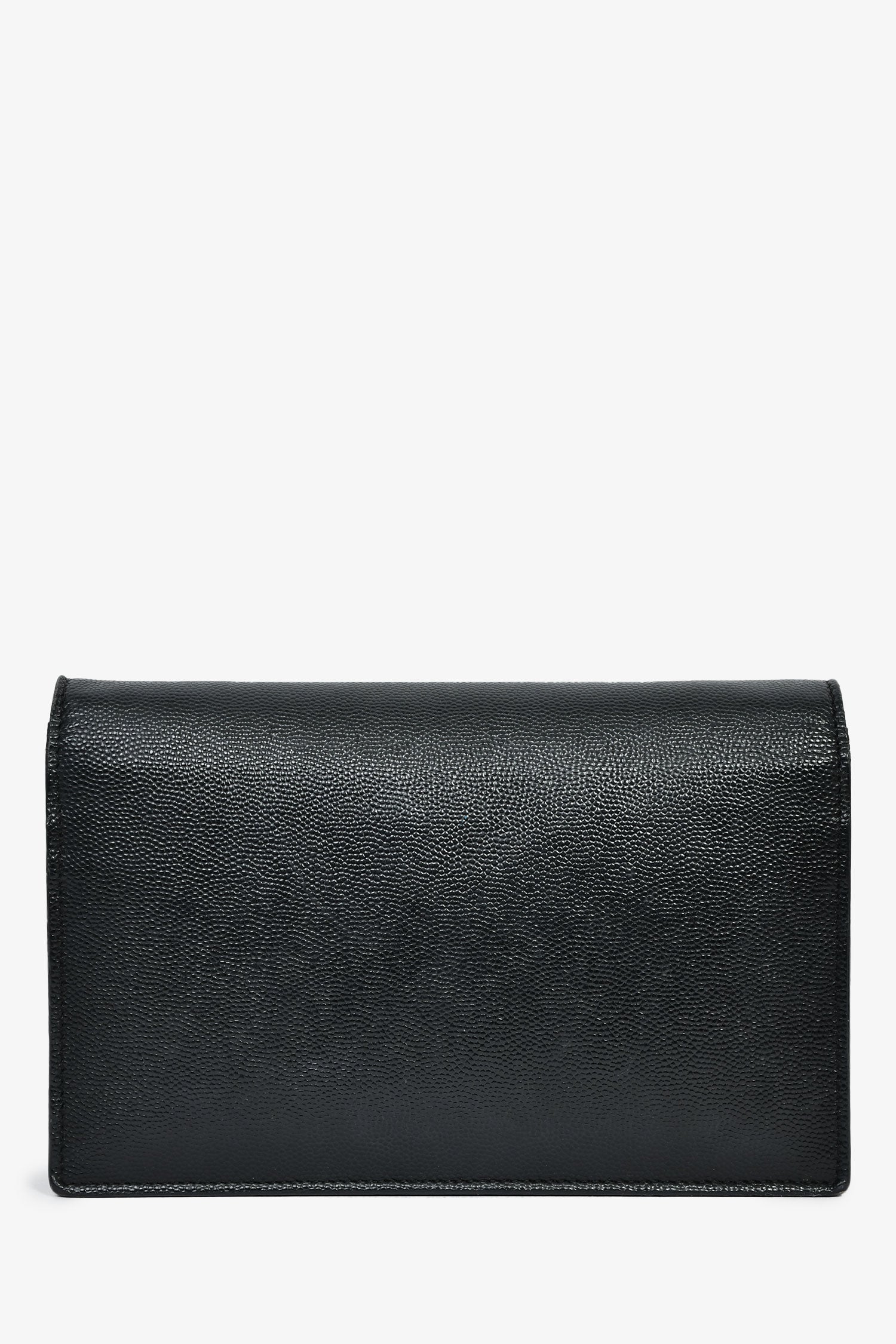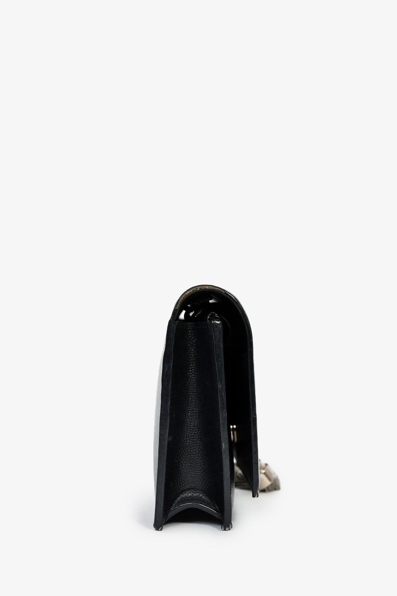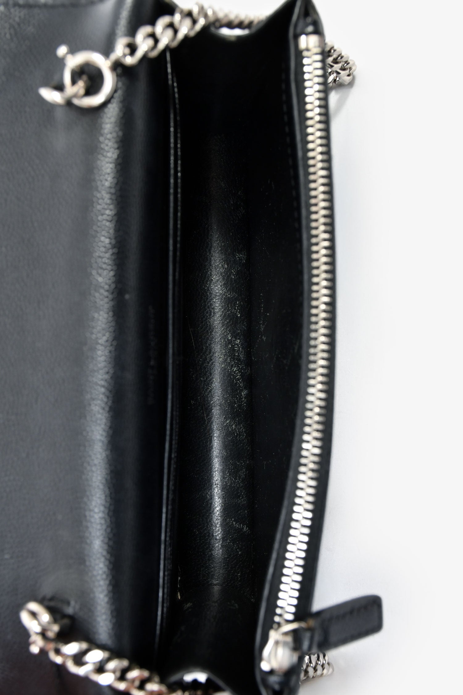Saint Laurent Black Leather Kate Tassel Small Crossbody. Fold-over flap with a snap closure. Chain-link crossbody strap. 1 bill and 1 zip compartment. 6 card slots. Silver-tone hardware. Tonal stitching.