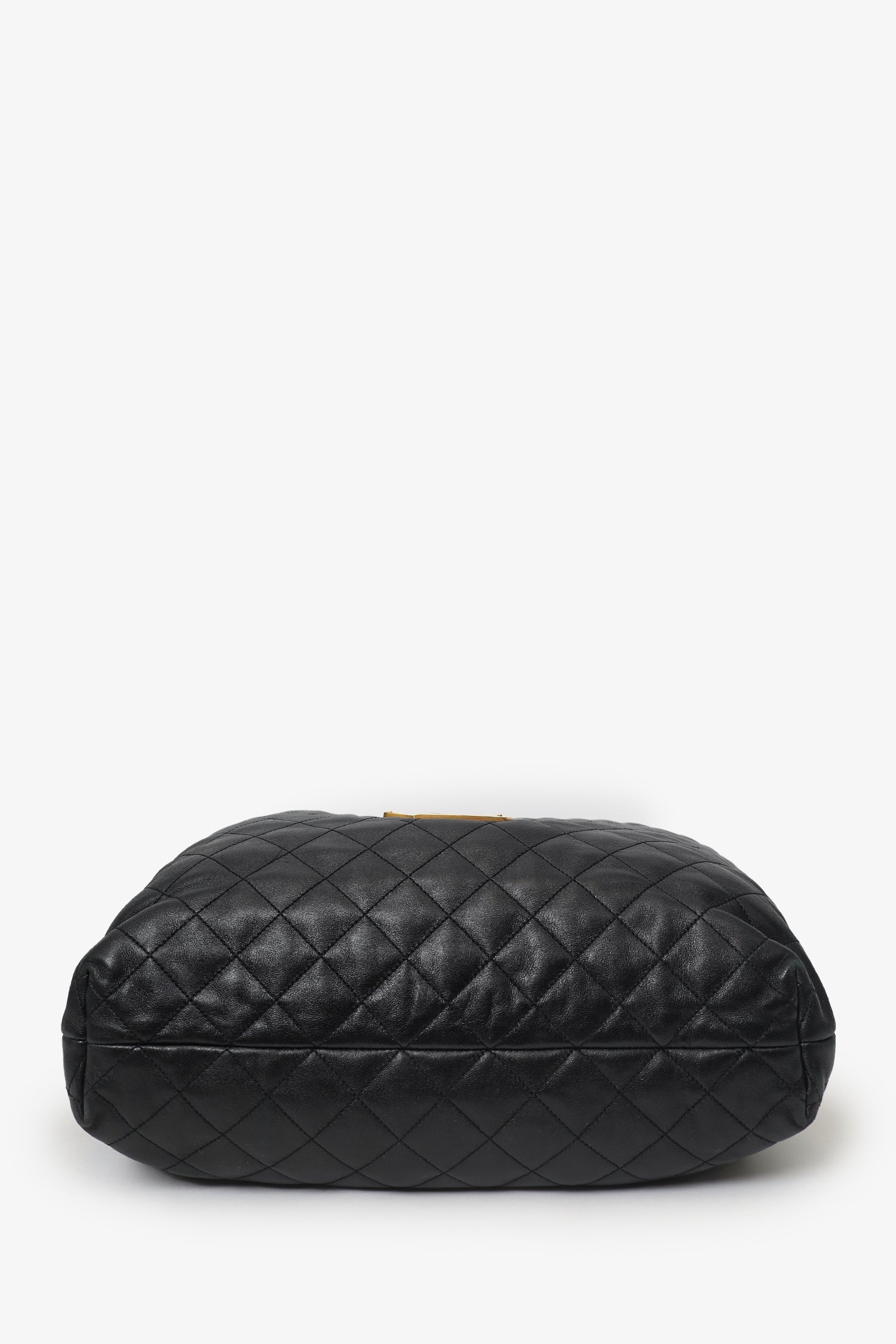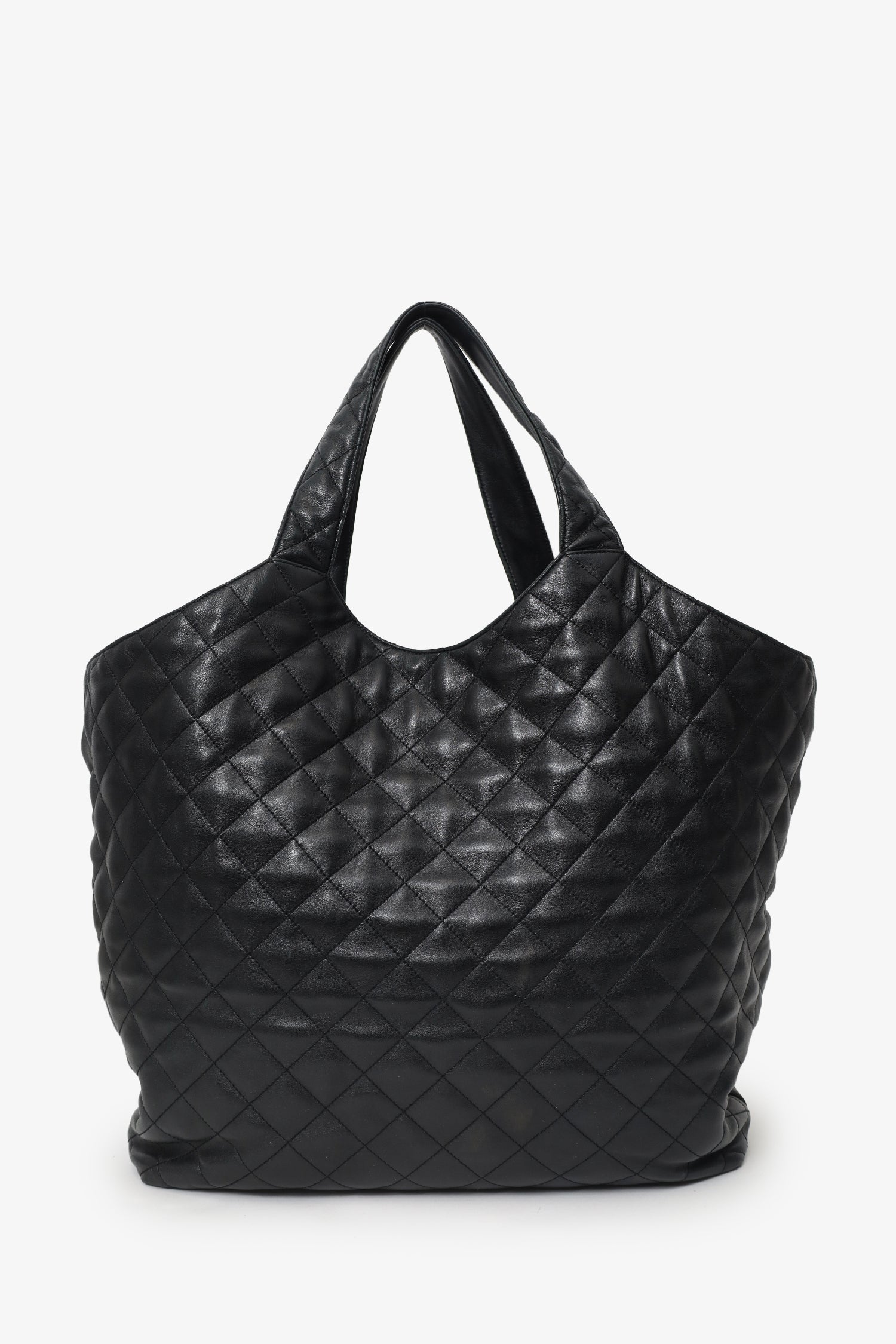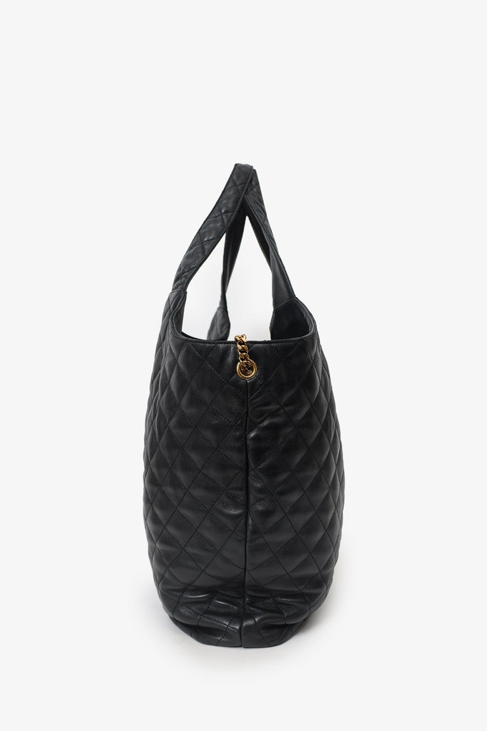 Saint Laurent Black Leather Quilted 'ICARE' Oversized Bag with Pouch. Open top. Twin top handles. Lined interior with single zip pocket. Removable pouch with zip closure. Single interior slip pocket in pouch. Gold-tone hardware. Tonal stitching.