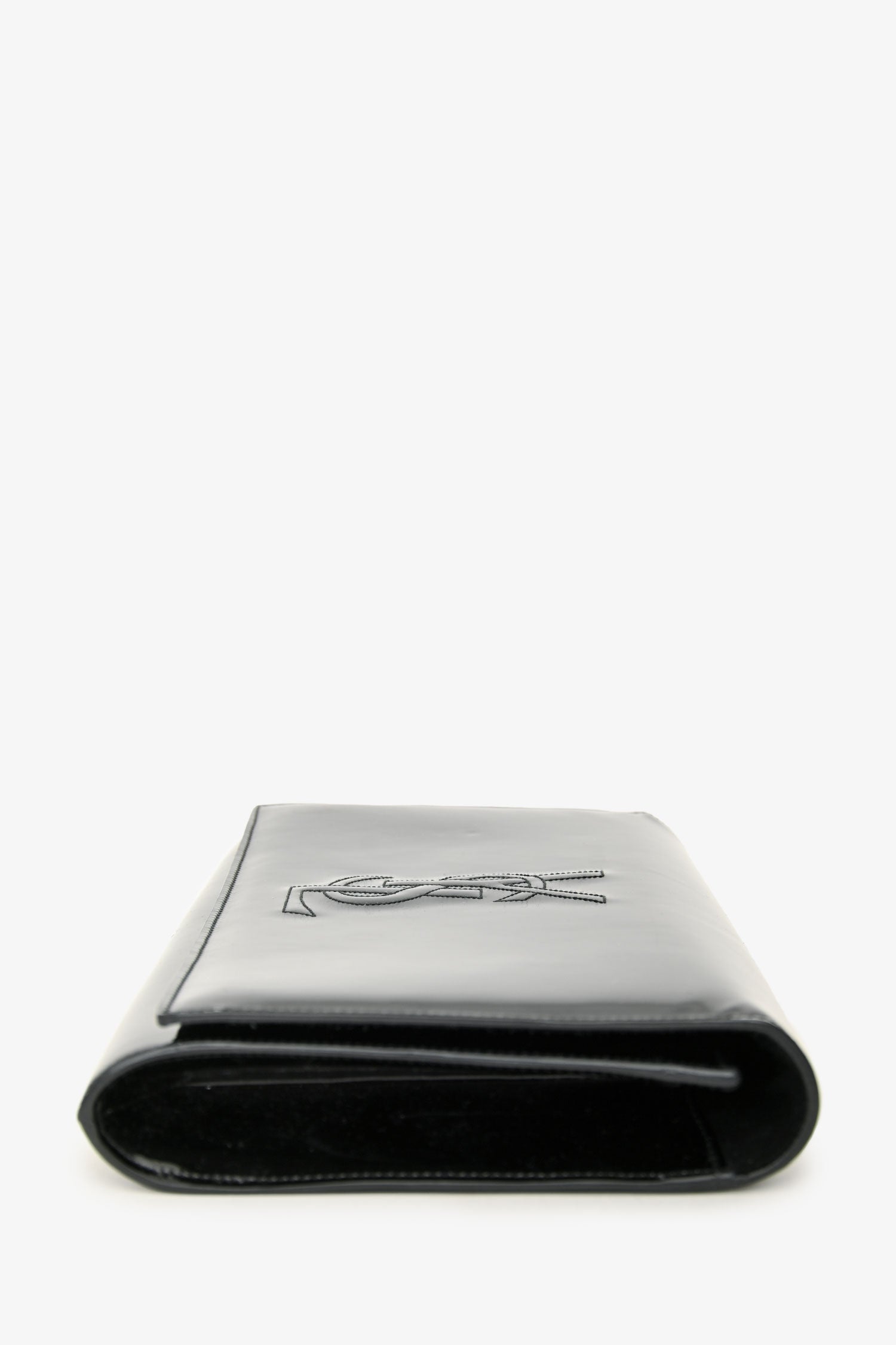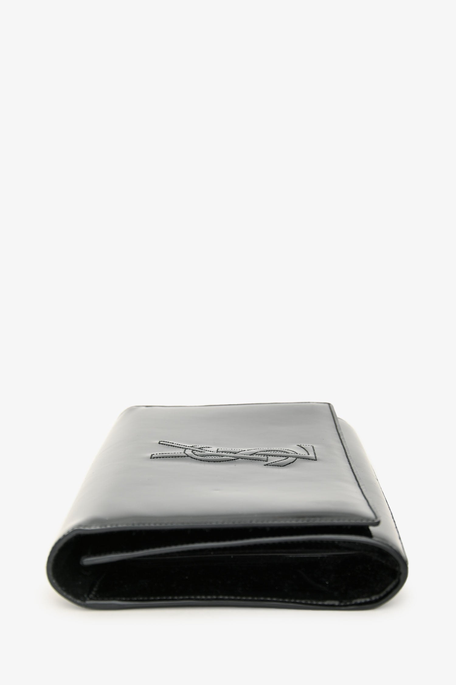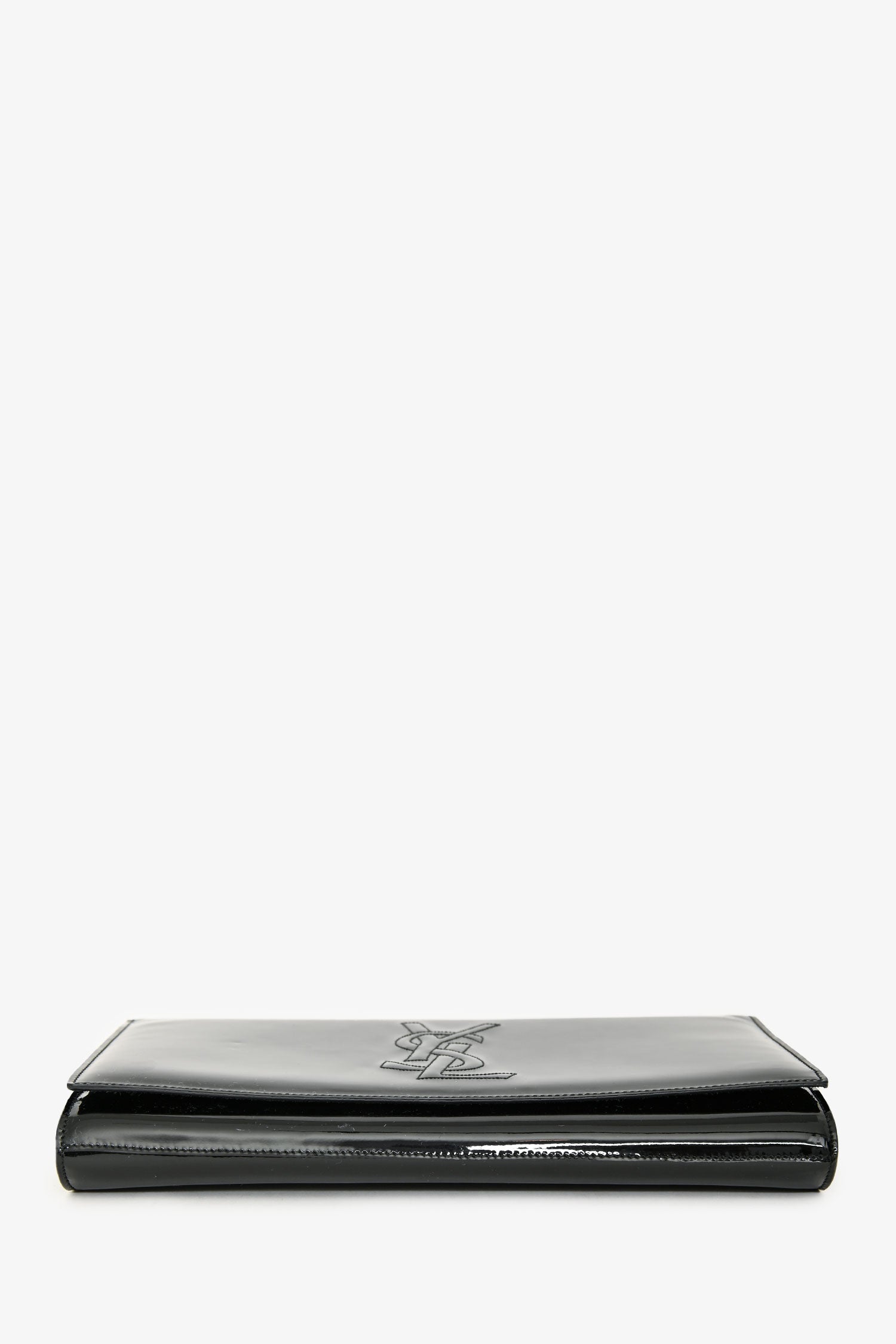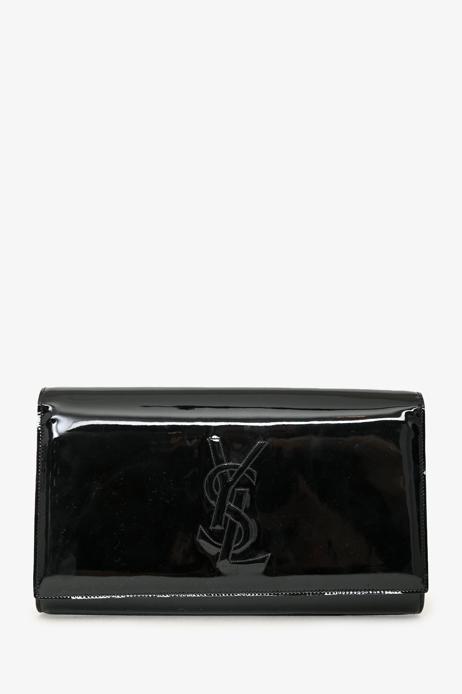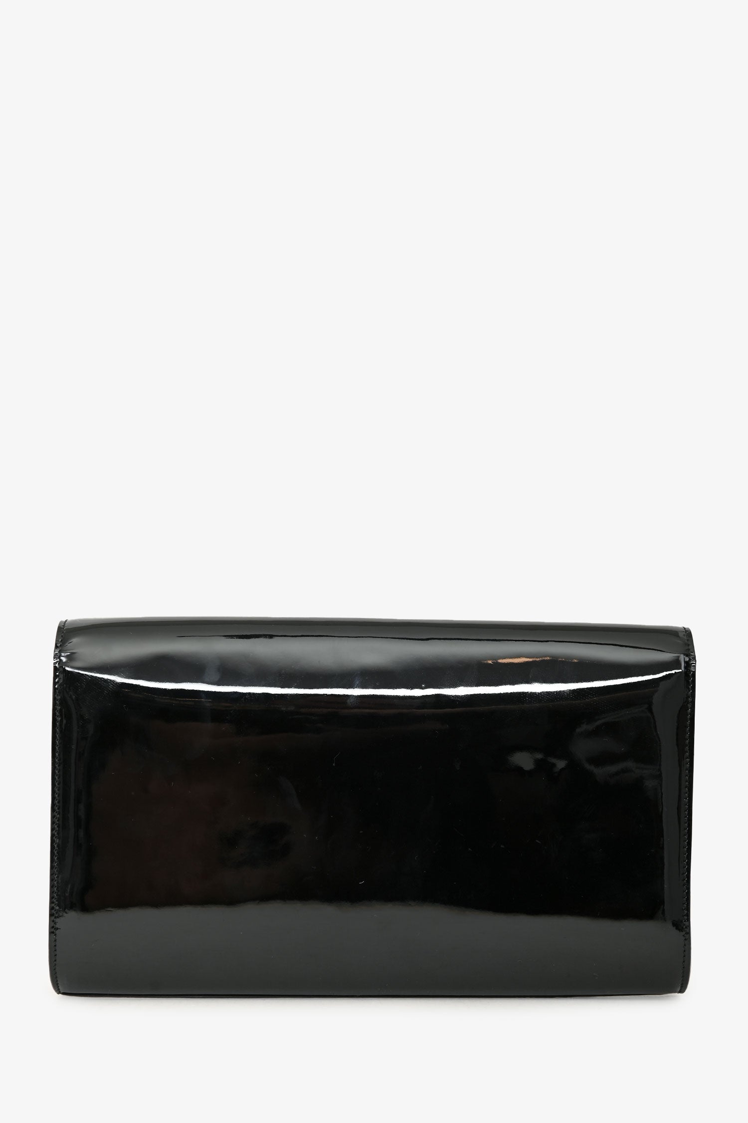 Saint Laurent Black Patent 'Belle de Jour' Clutch. Fold-over flap with a snap closure. Suede-lined interior with 2 compartments: 1 main and 1 card slot. Gold-tone hardware. Tonal stitching.