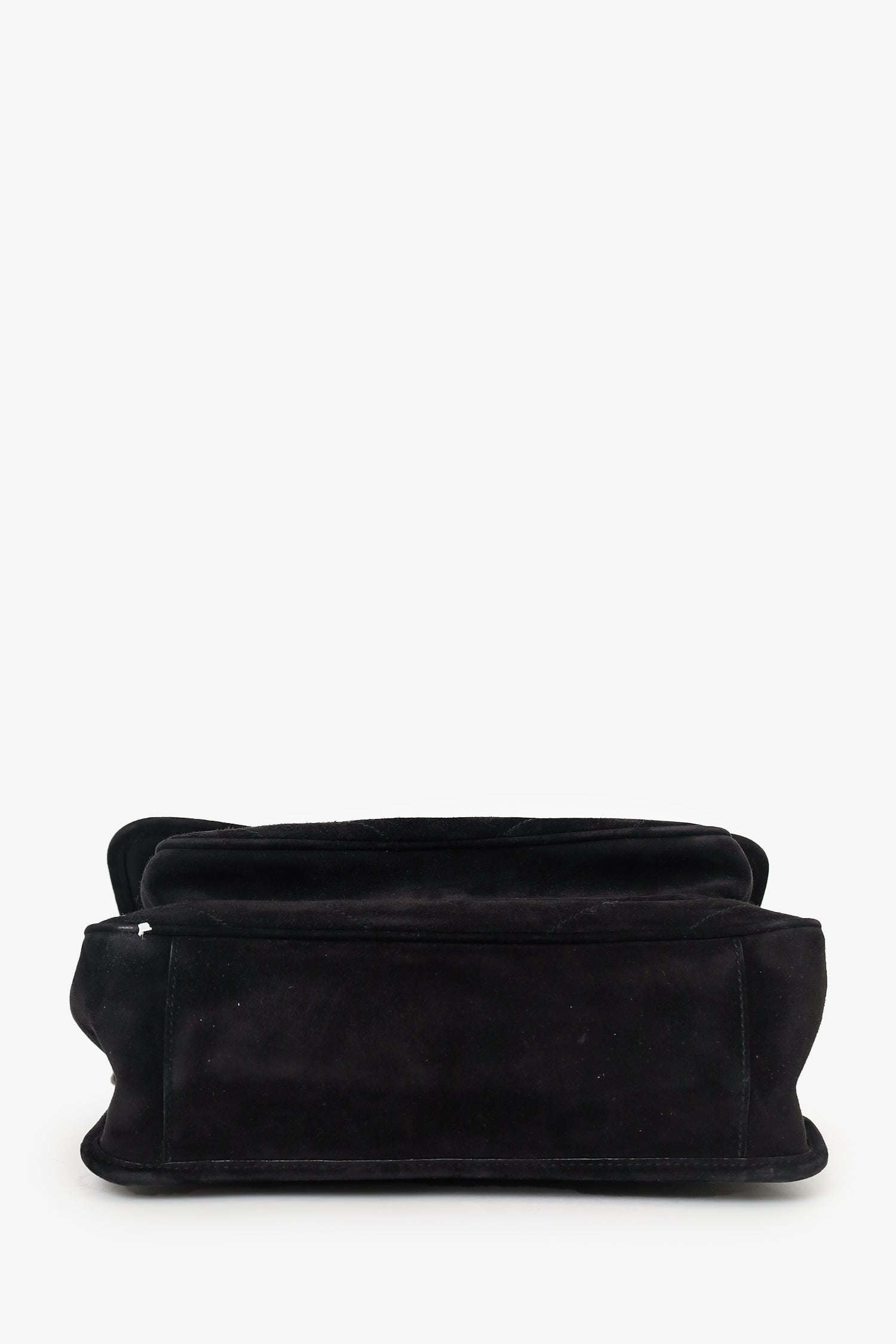 Saint Laurent Black Suede Medium Niki Shoulder Bag. Fold-over flap with magnetic snap-button closure. Twin chainlink strap that can be pulled into one longer strap. Single rear exterior pocket with magnetic closure. Two interior compartments; front open and main compartment with one slip and one zip pocket. Leather-lined interior. Tonal stitching.