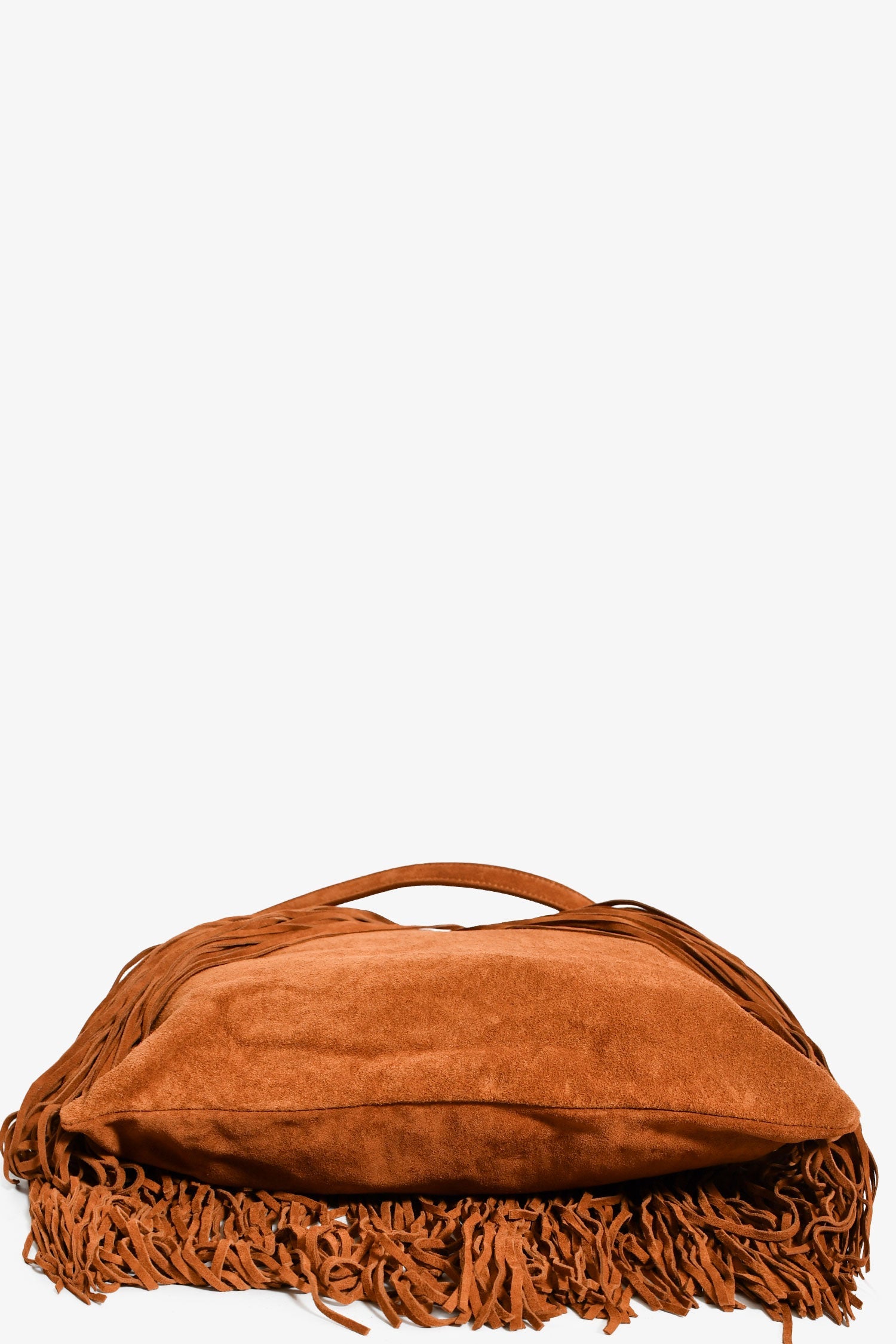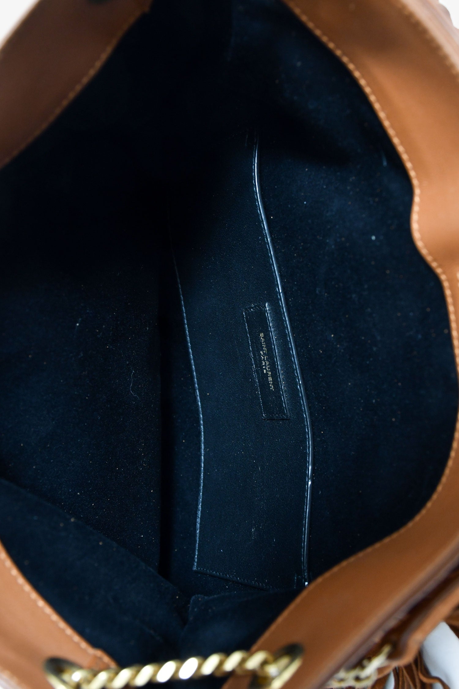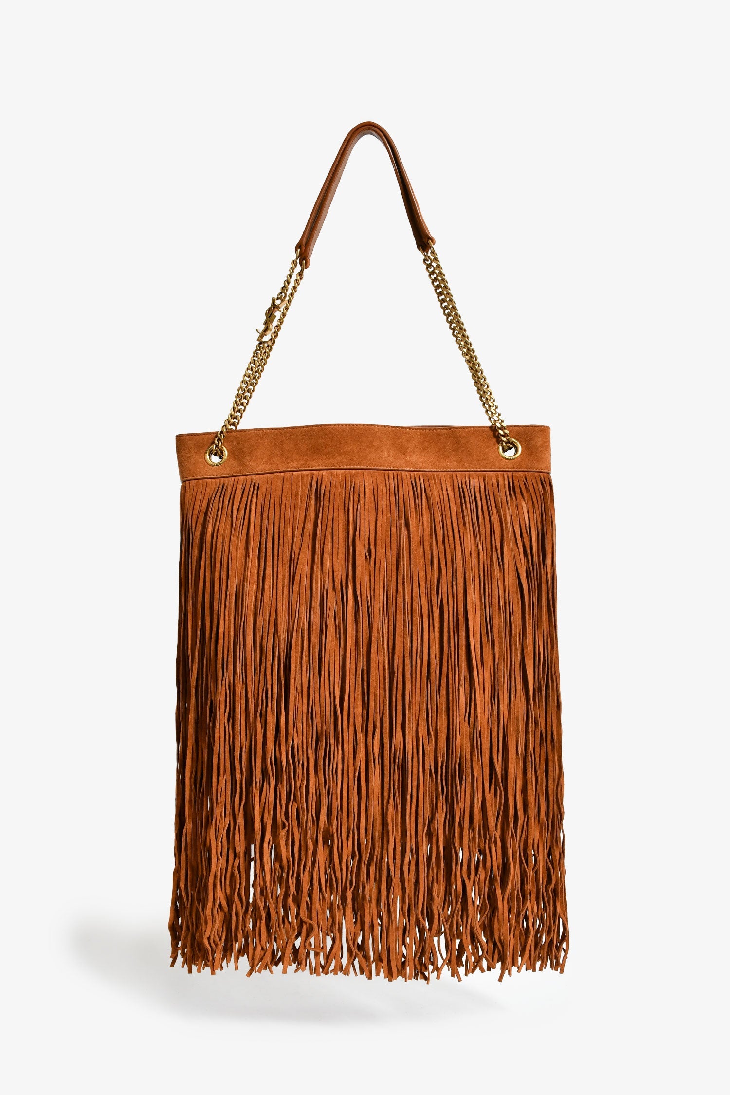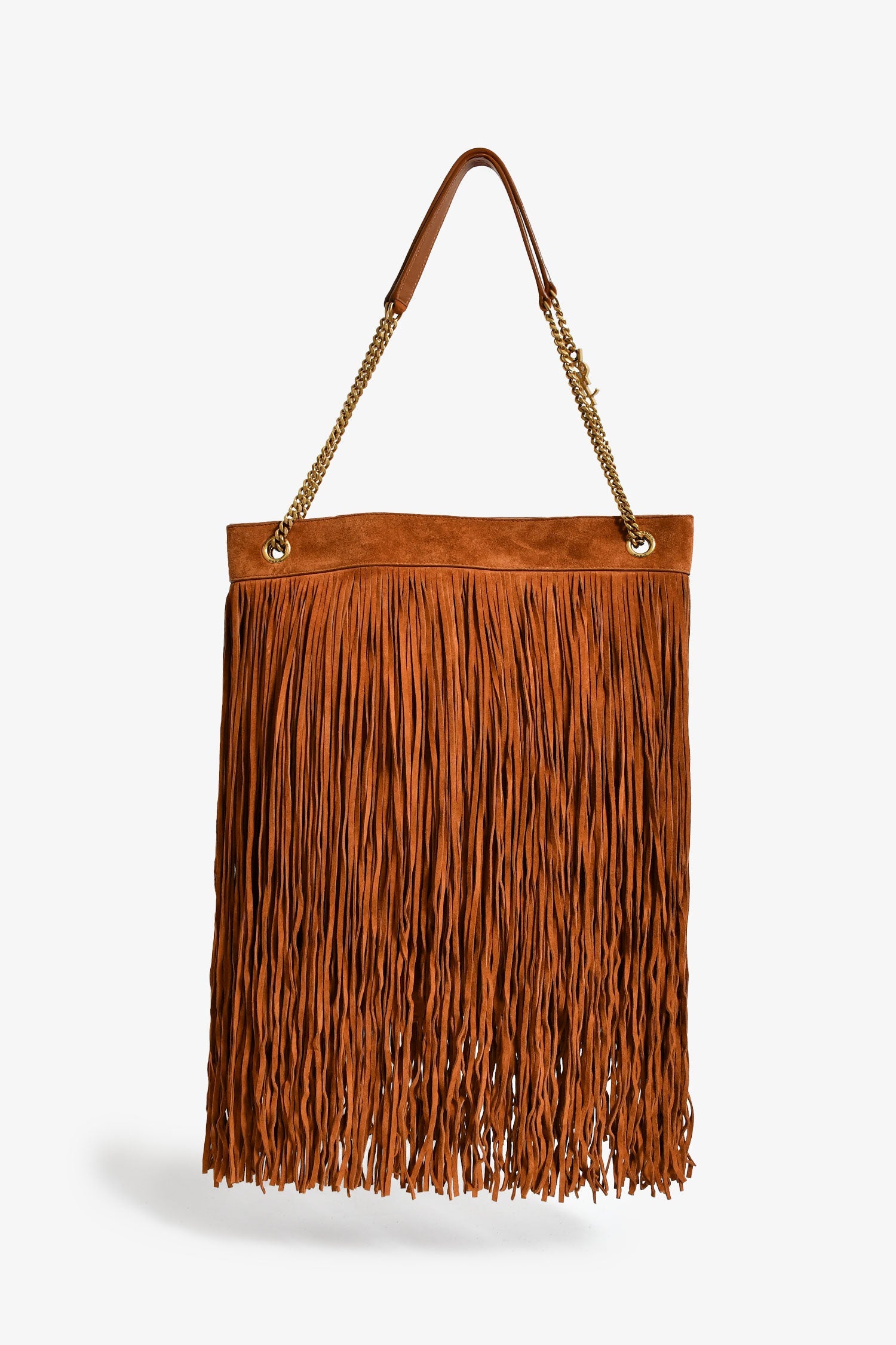 Saint Laurent Brown Suede 'Grace' Small Fringe Shoulder Bag. Concealed magnetic closure. Chain-link and leather shoulder strap. Lined interior with a card slot. Gold-tone hardware. Tonal stitching.