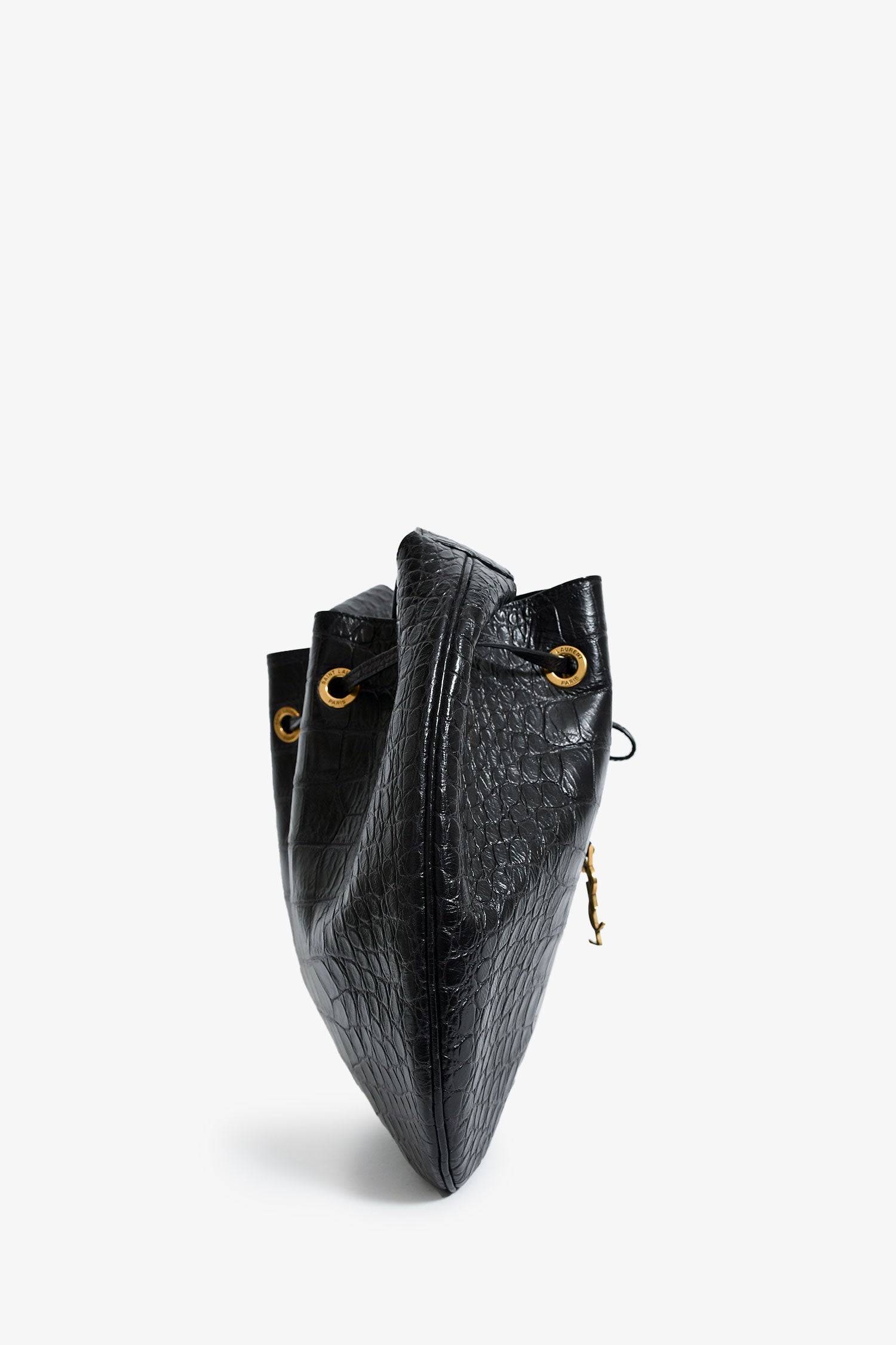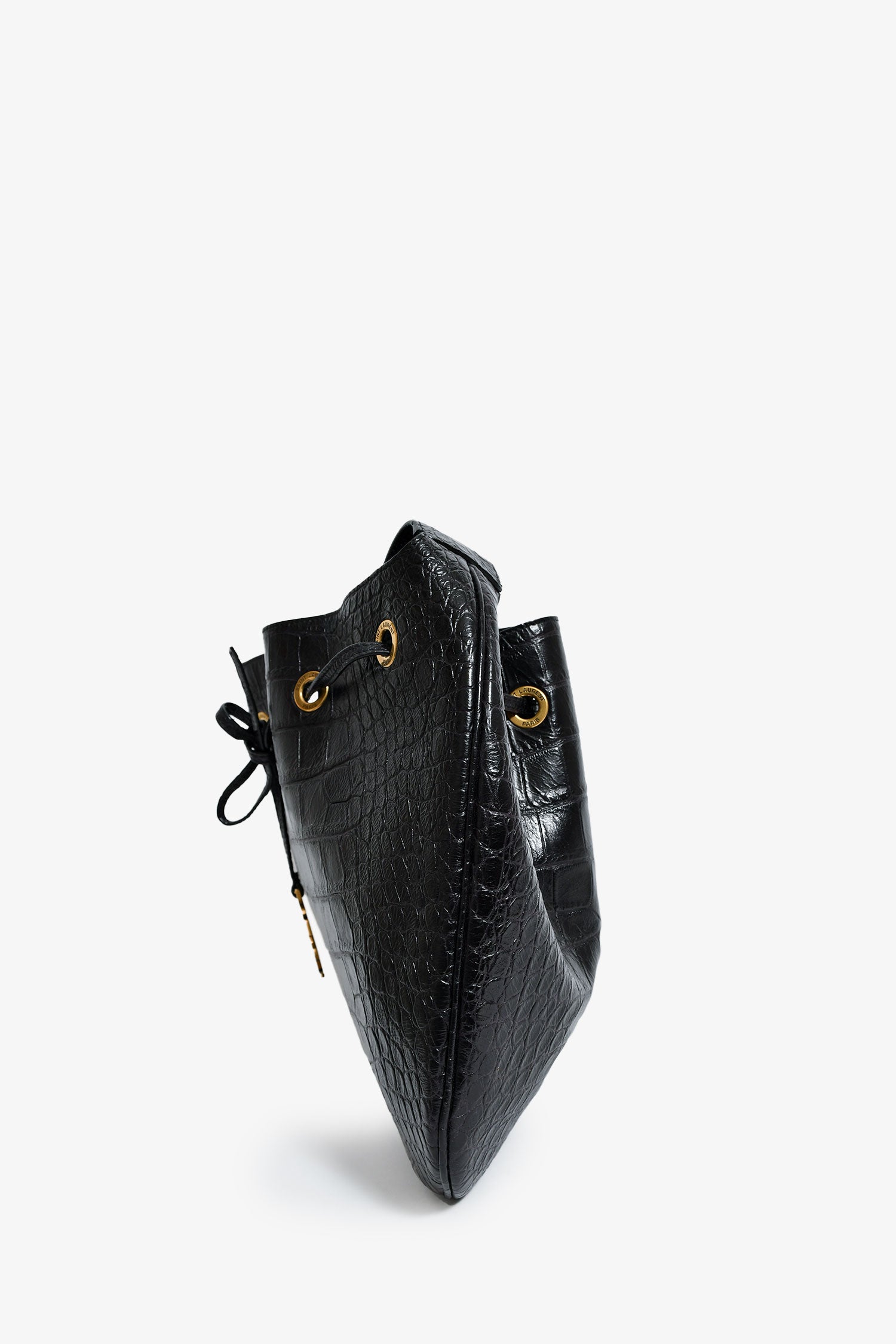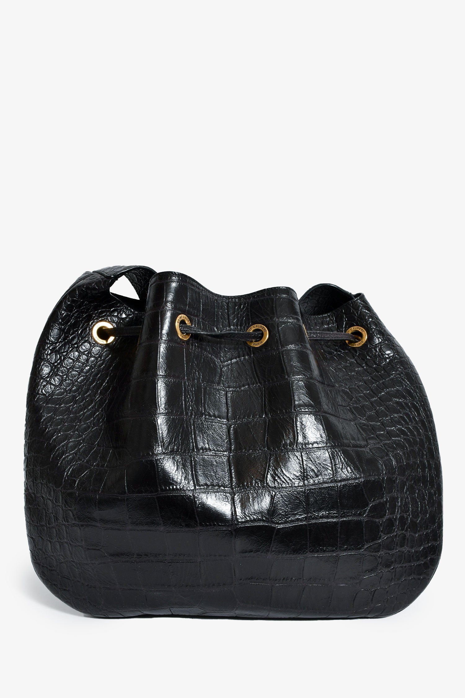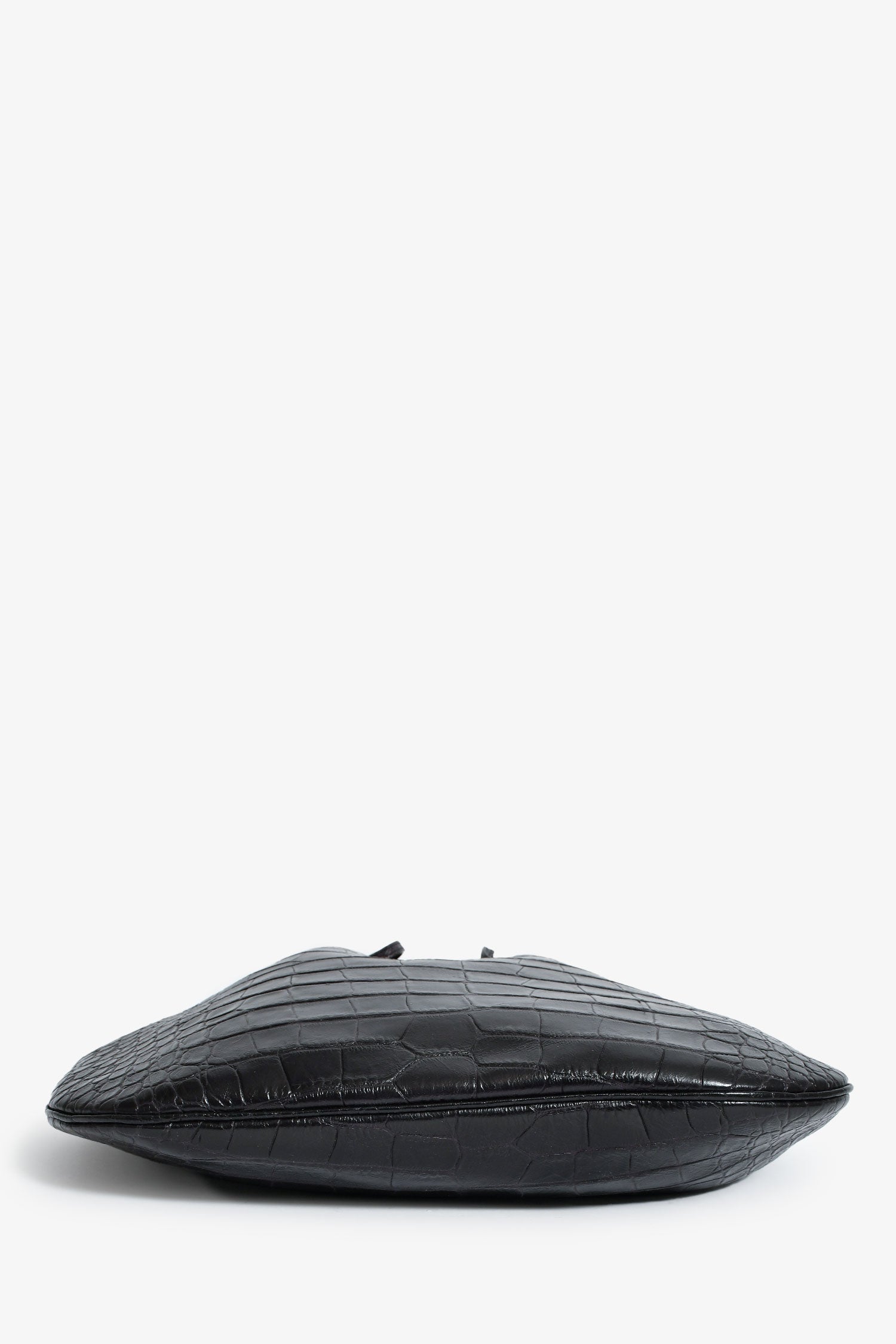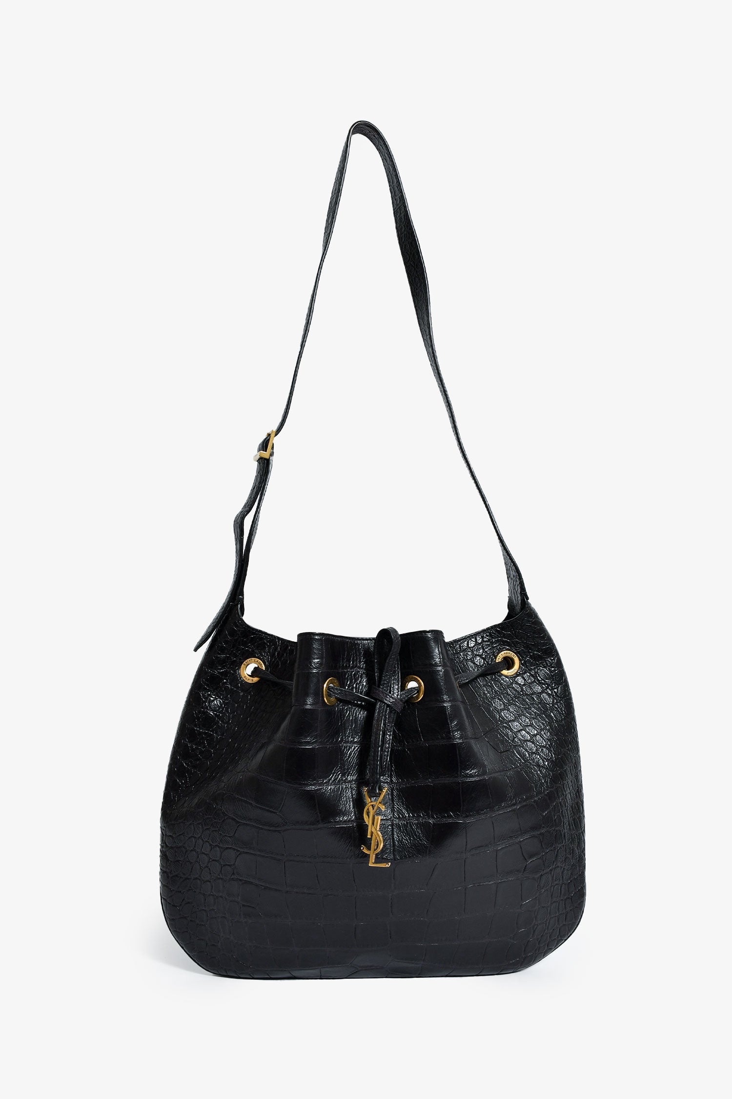 Saint Laurent Espresso Croc Embossed Leather 'Paris VII' Medium Hobo Bag. Front pull-tab. Single shoulder strap. Suede-lined interior. Attached pouch. Gold-tone hardware. Tonal stitching.