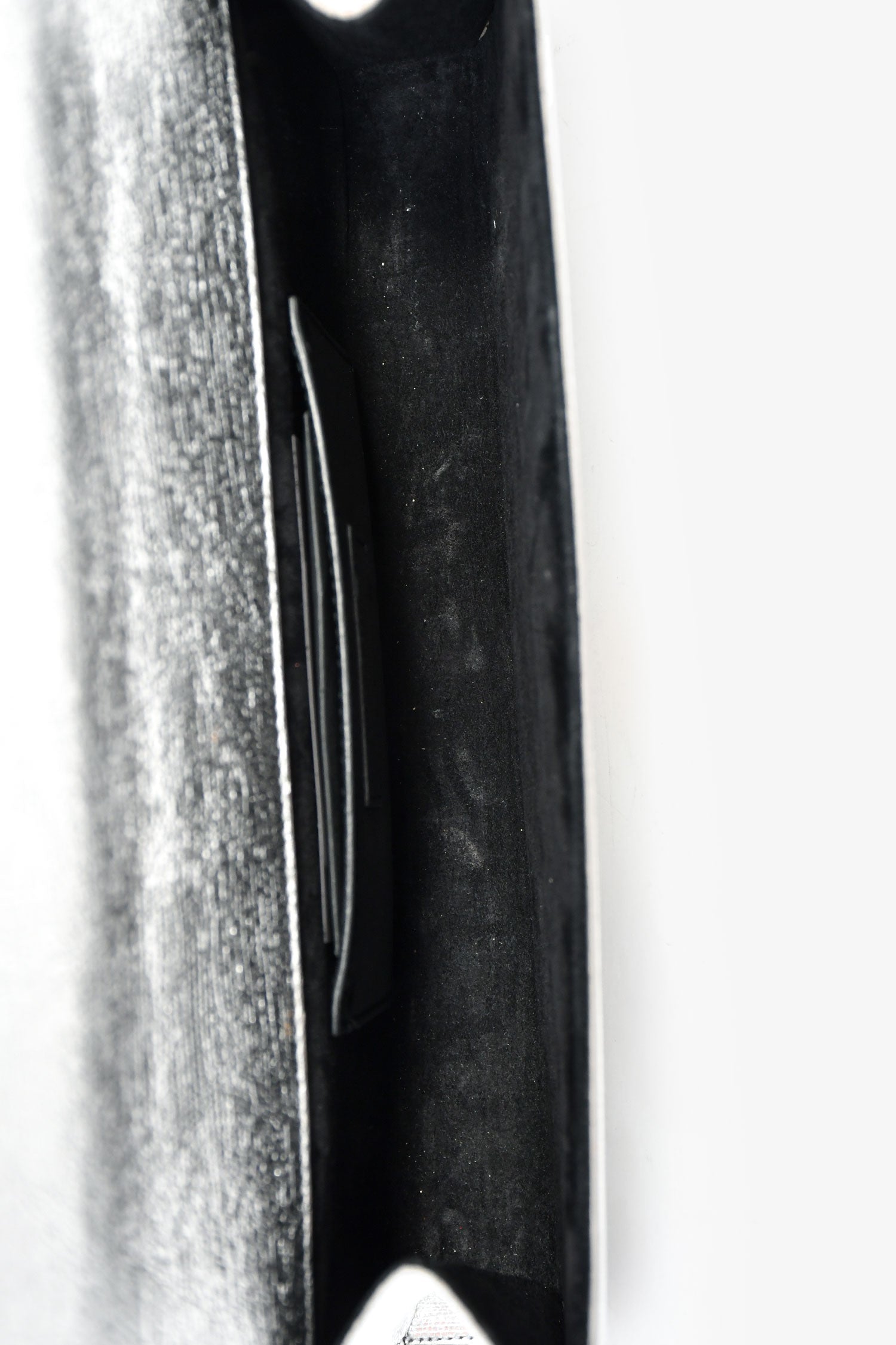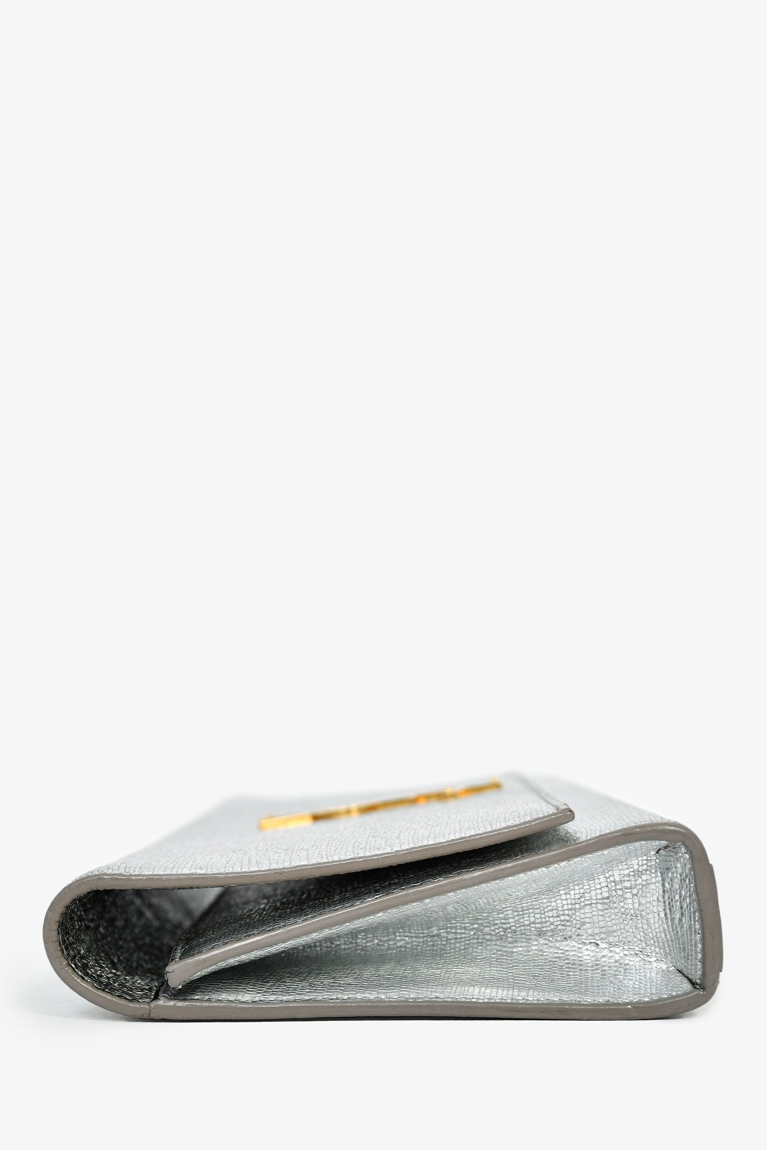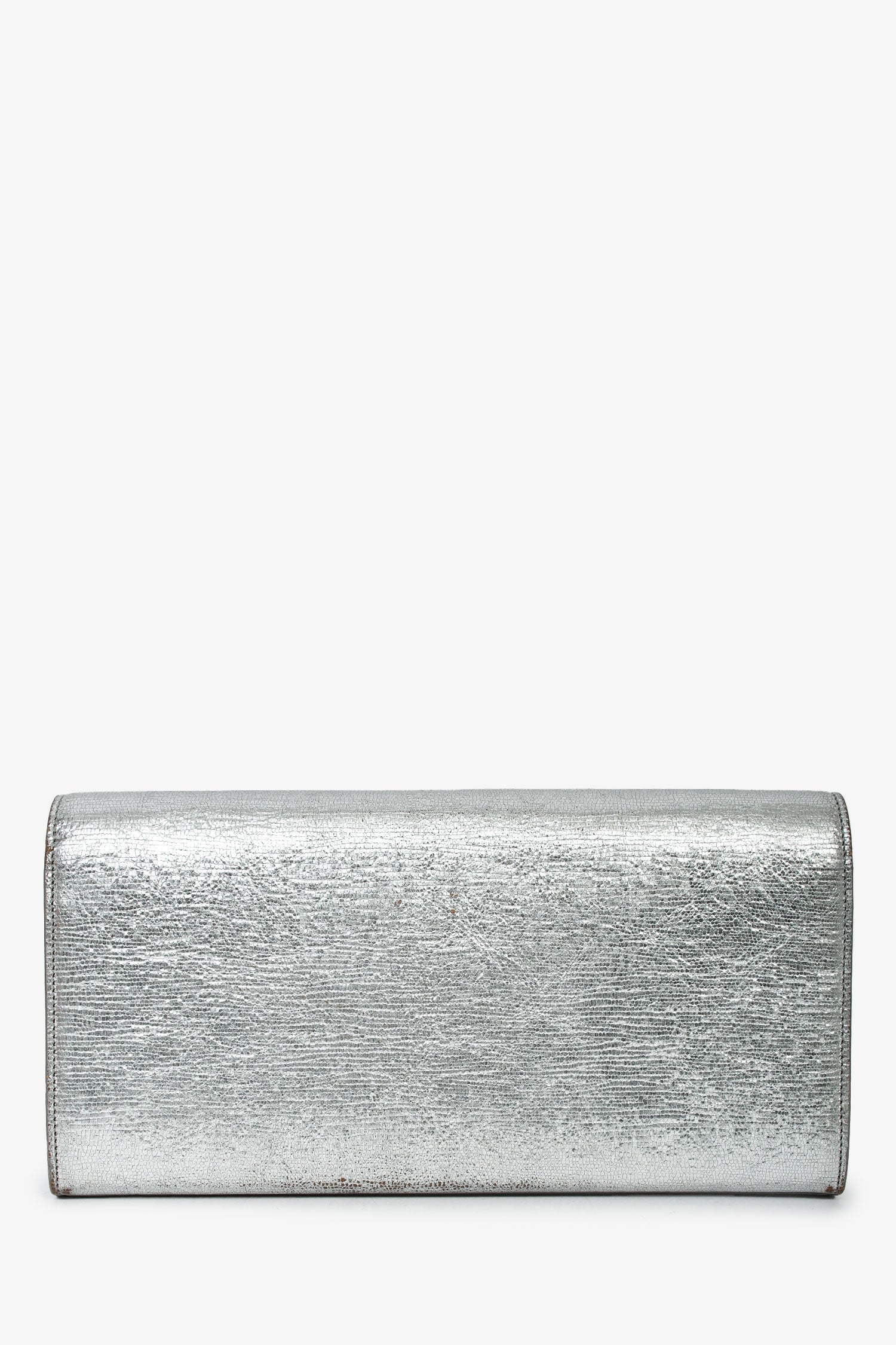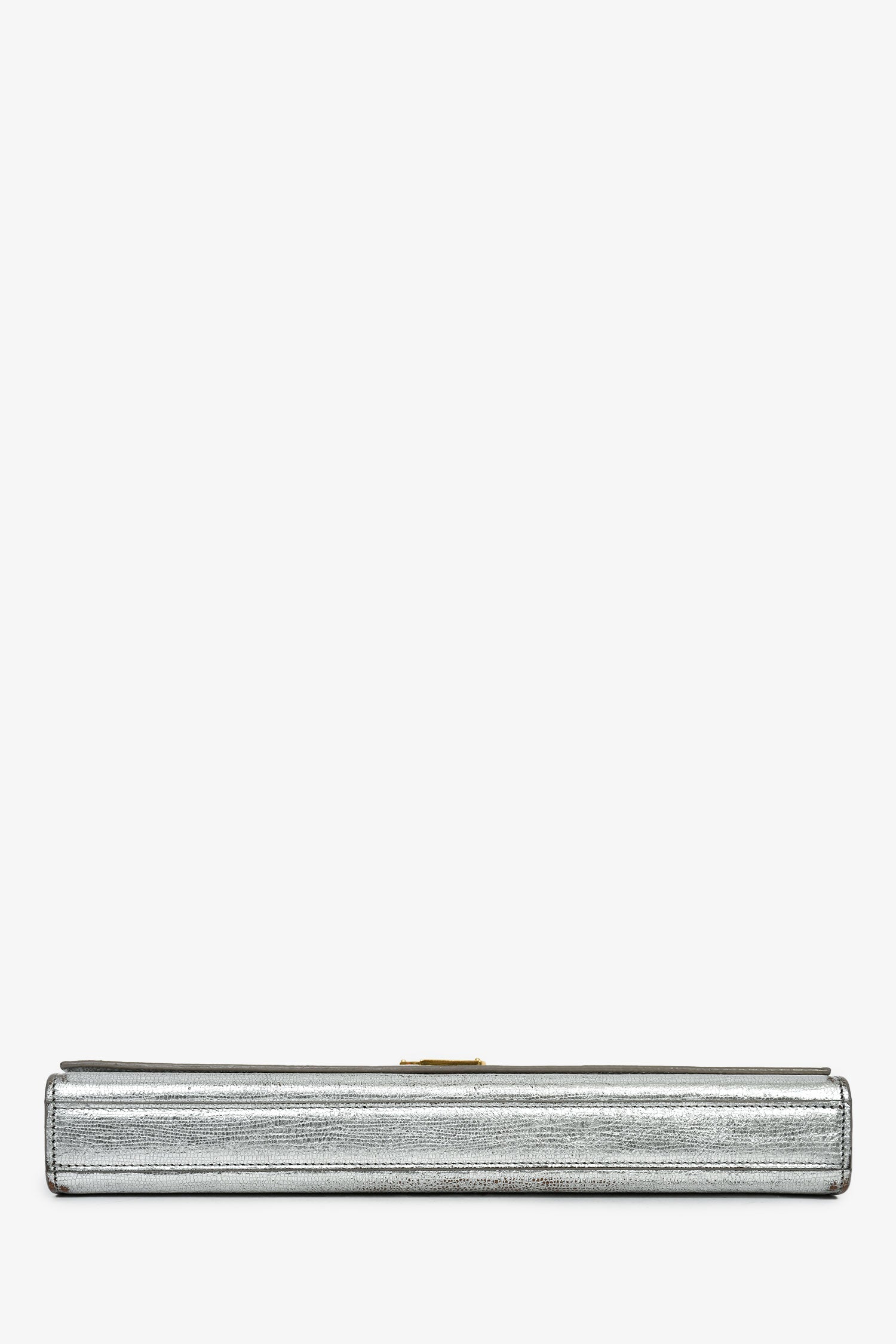 Saint Laurent Silver Metallic Leather Cassandre Clutch. Fold-over flap with a snap closure. Suede-lined interior with a card slot. Gold-tone hardware. Tonal stitching.
