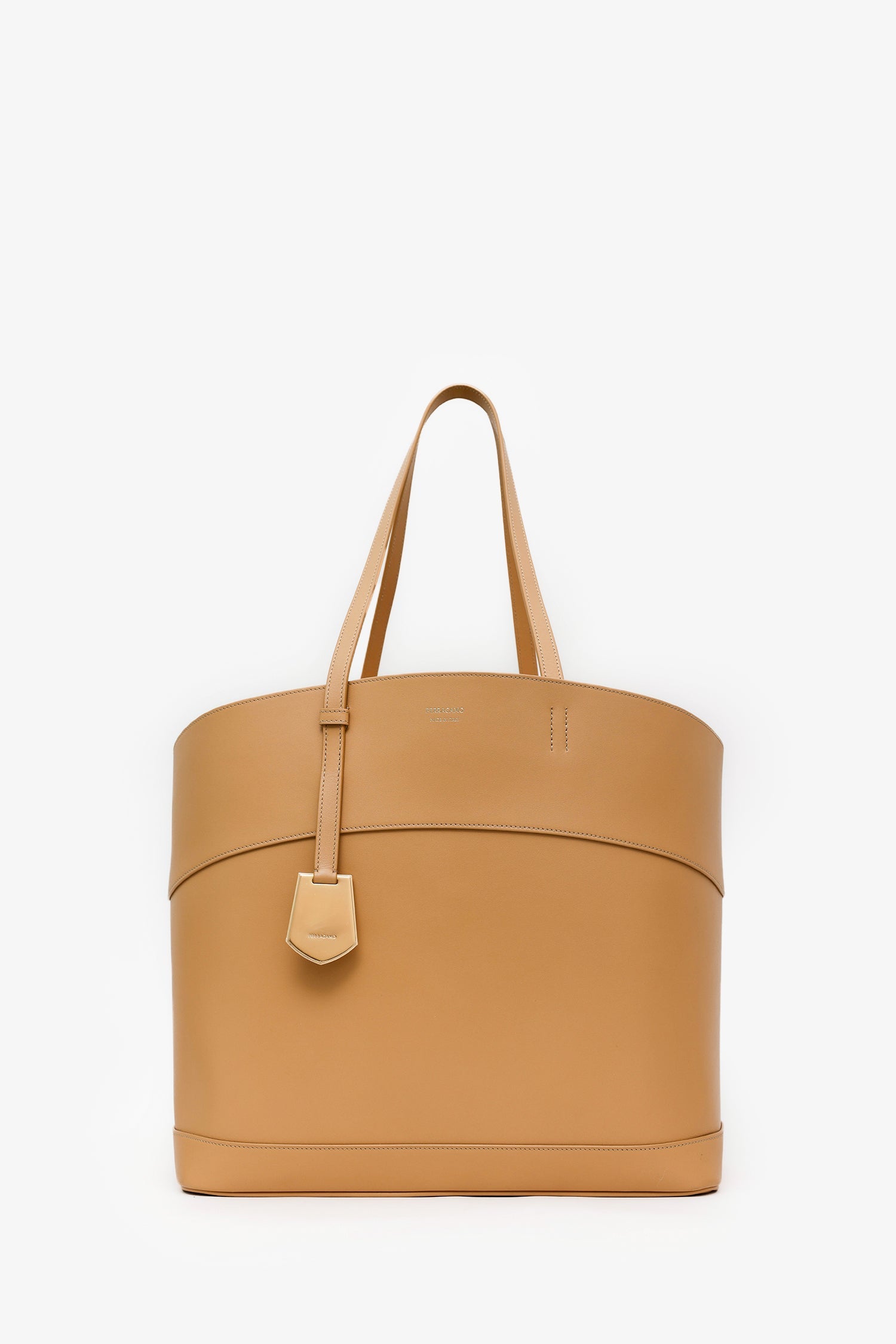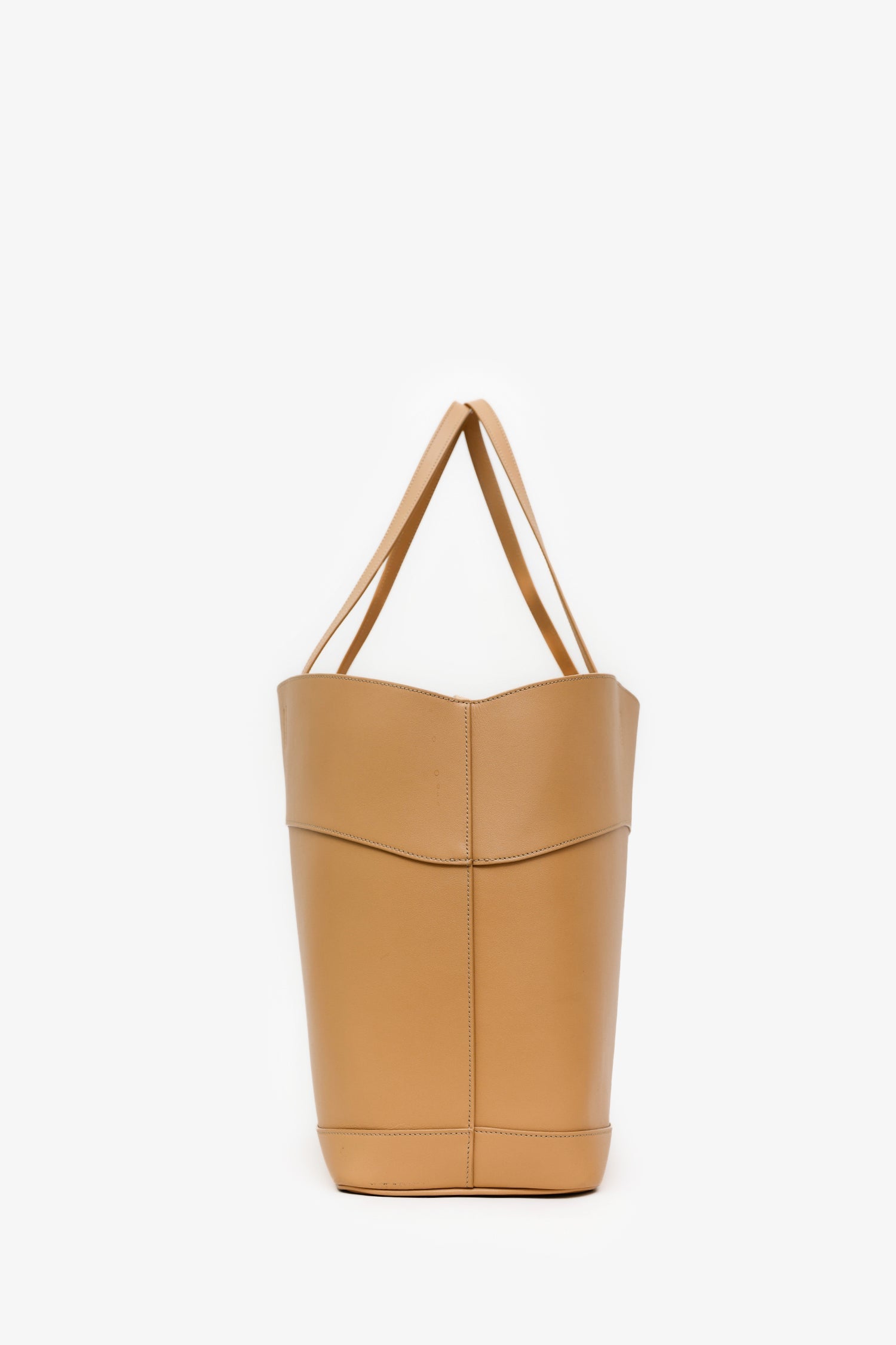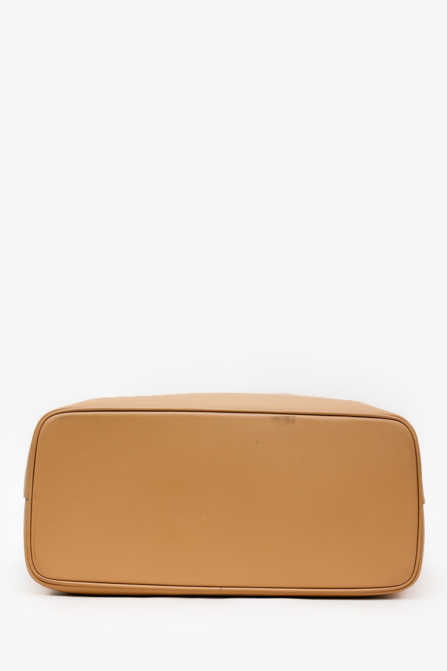 Salvatore Ferragamo Beige Medium 'Charming' Leather Tote Bag. Top open with interior pull-through push-pin closure. Twin shoulder straps. Open interior with additional zip pouch. Gold-tone hardware. Tonal stitching.