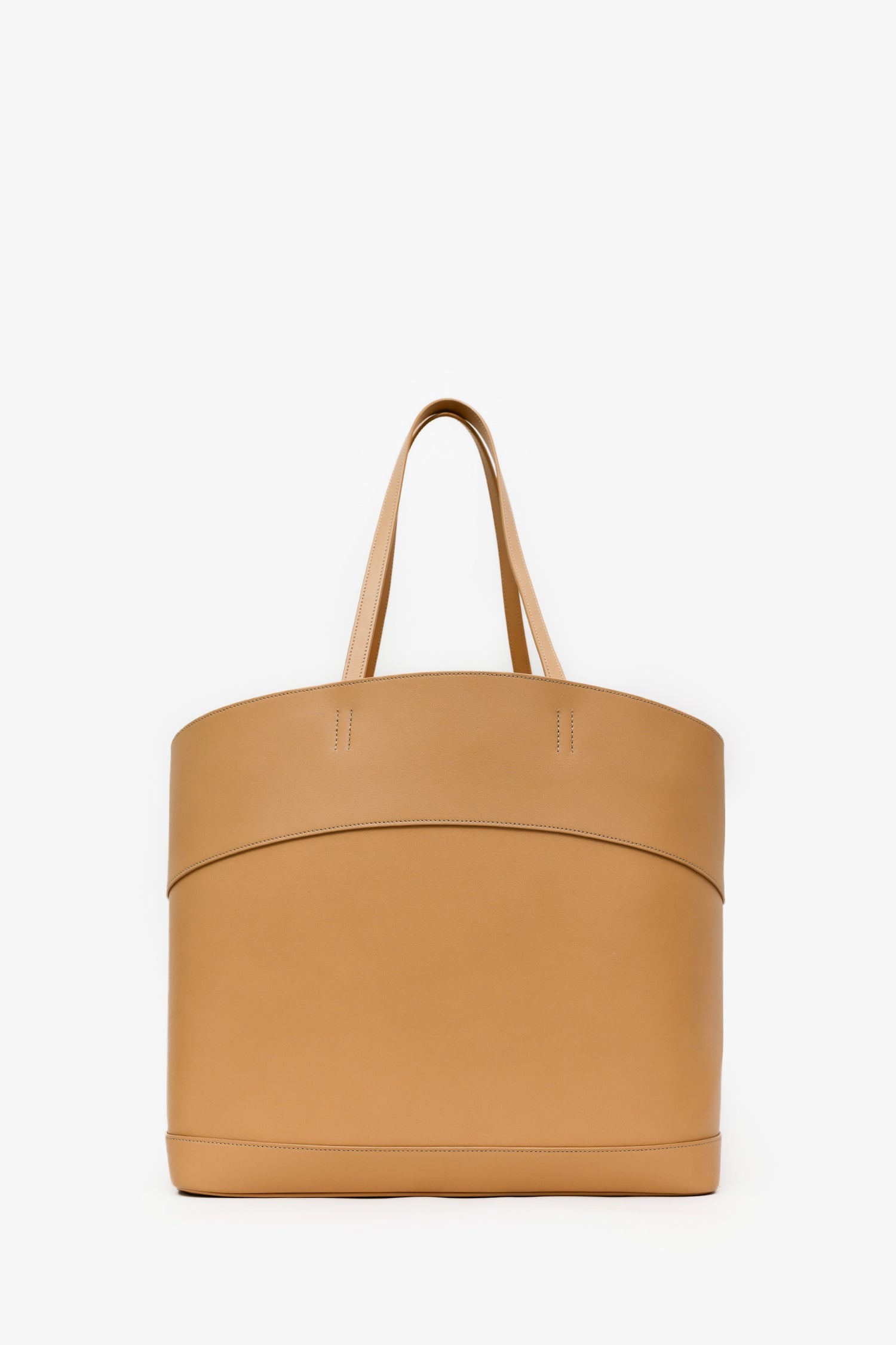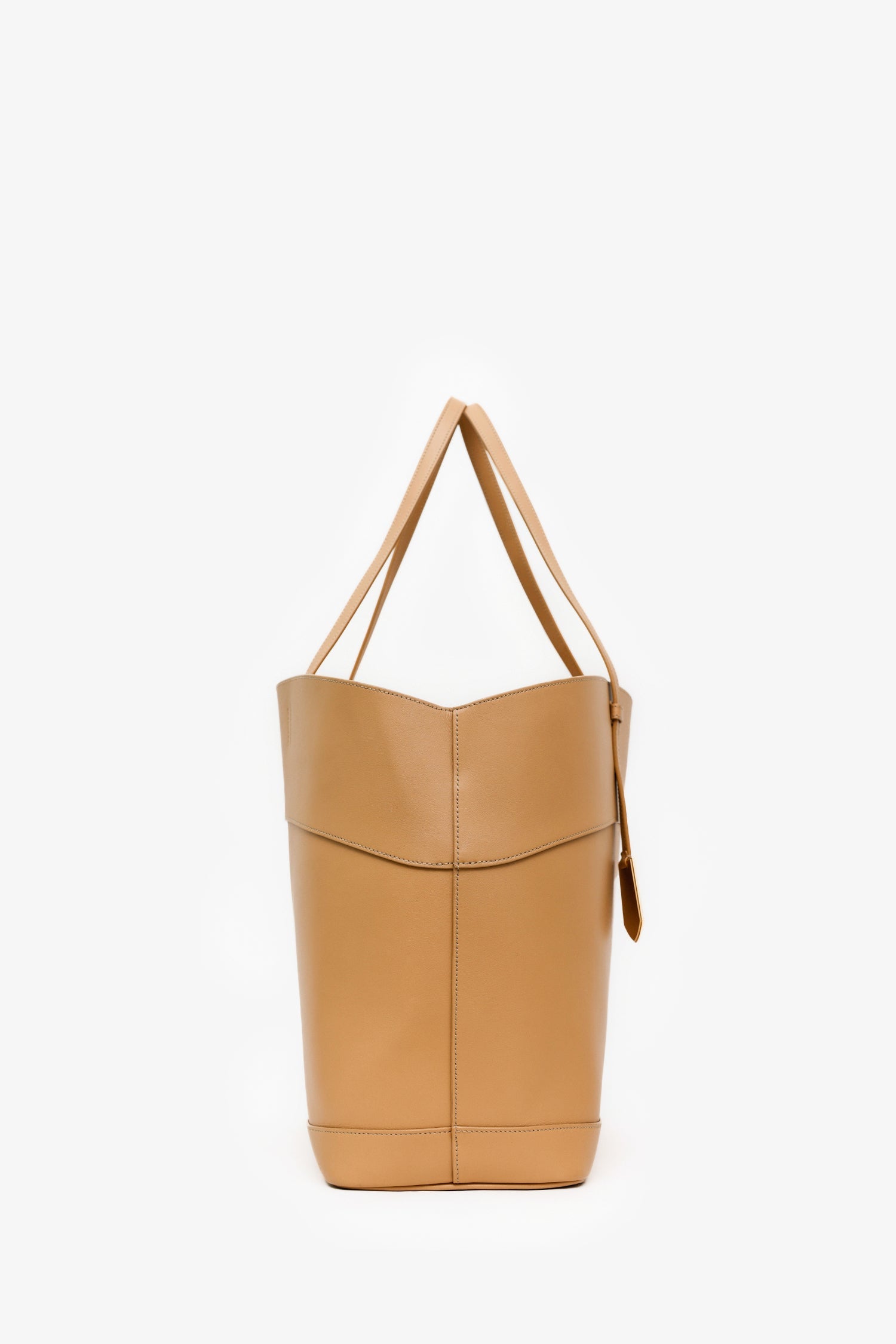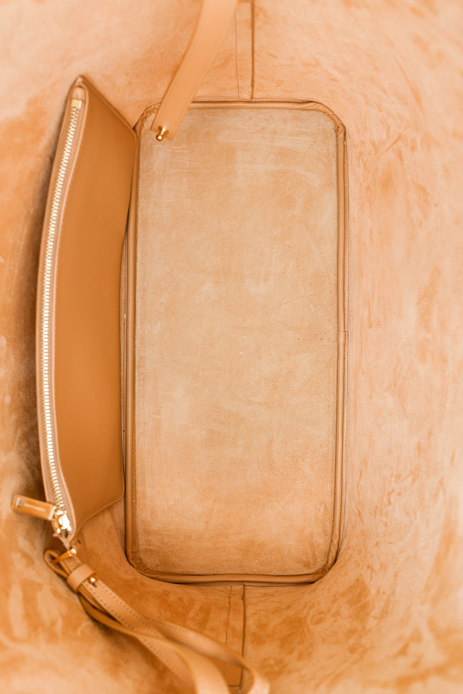 Salvatore Ferragamo Beige Medium 'Charming' Leather Tote Bag. Top open with interior pull-through push-pin closure. Twin shoulder straps. Open interior with additional zip pouch. Gold-tone hardware. Tonal stitching.