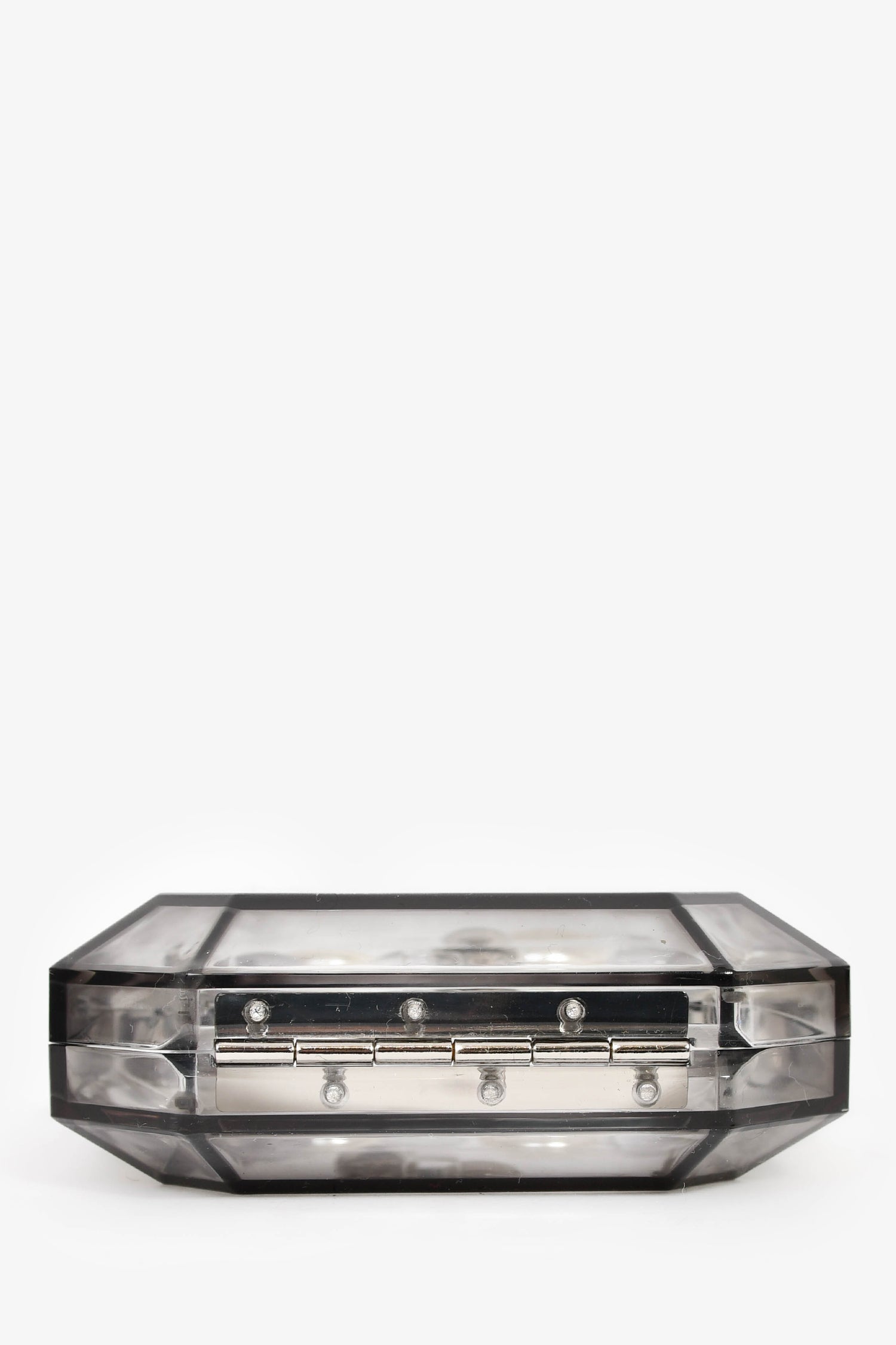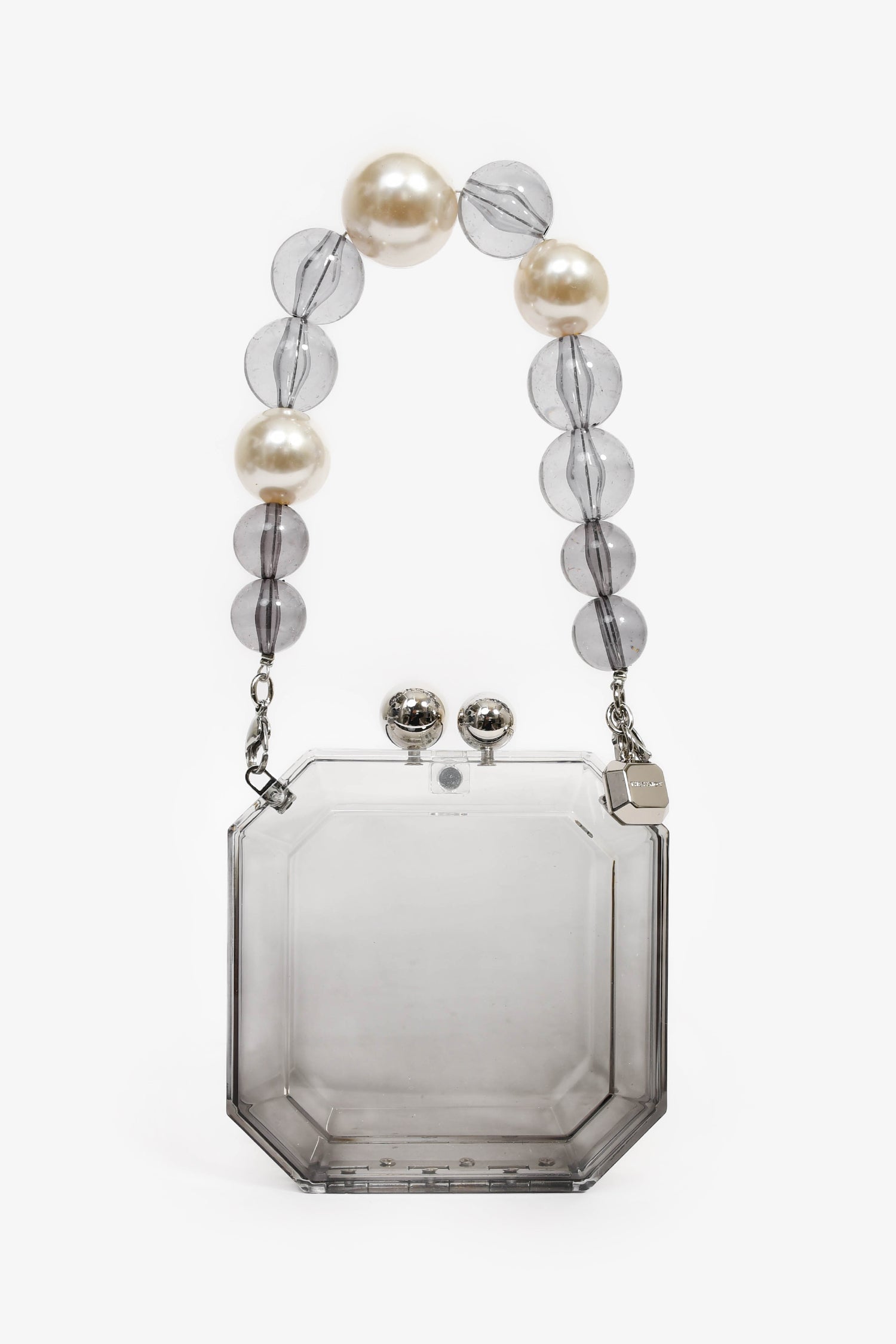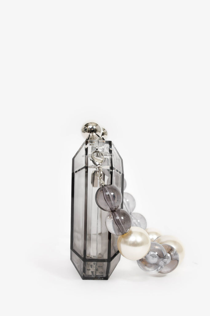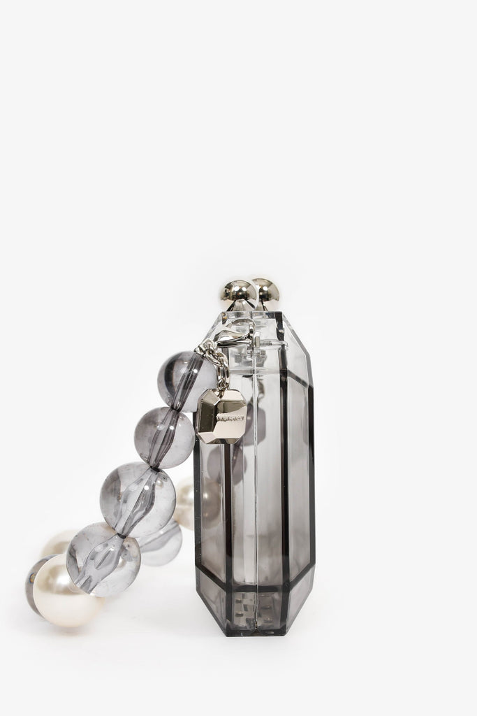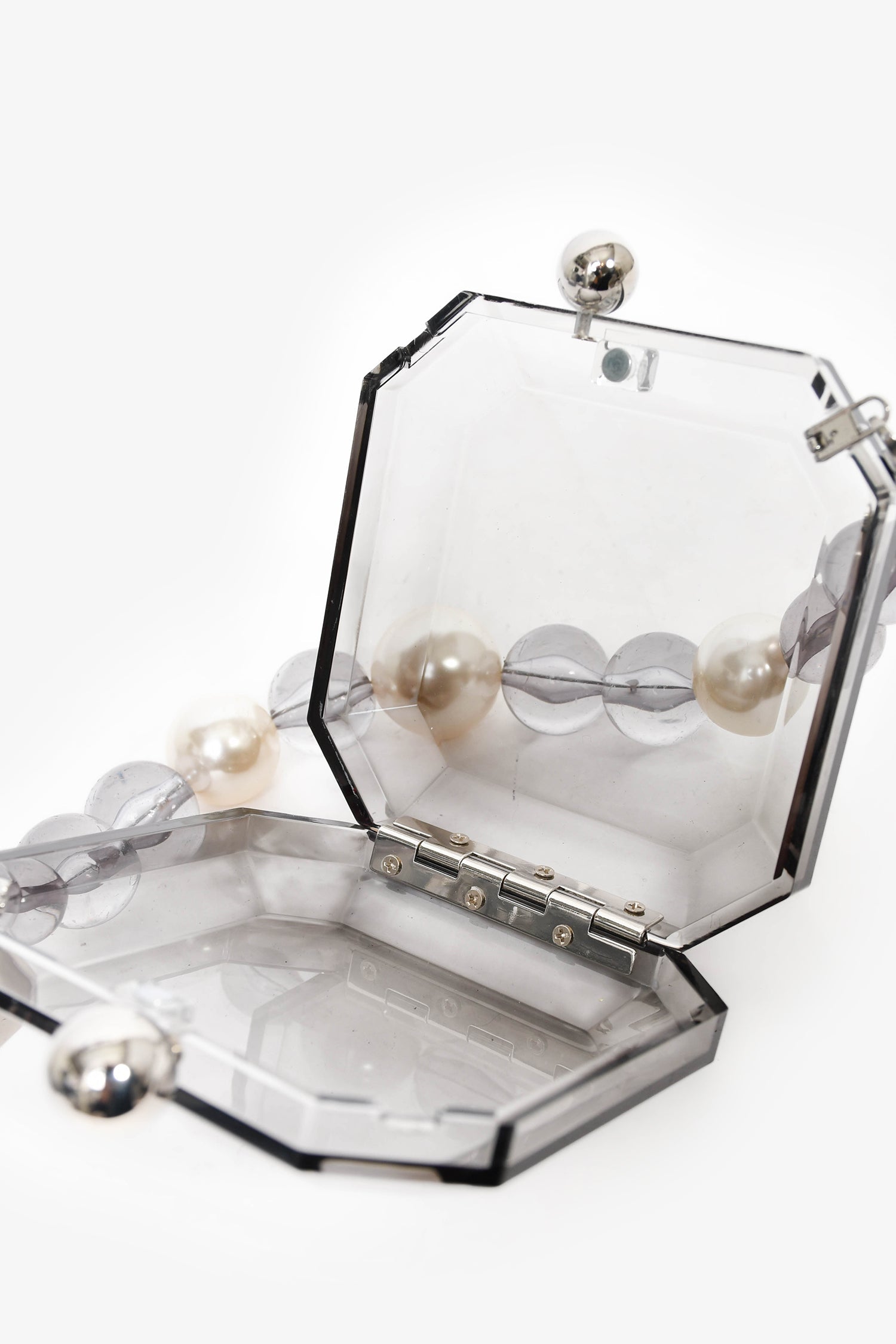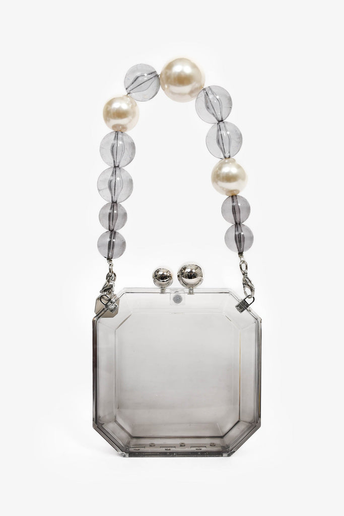 Theyknow Grey Acrylic Faux Pearl Mini Top Handle. Top magnetic closure. Single interior compartment. Detachable handle. Silver-tone hardware.