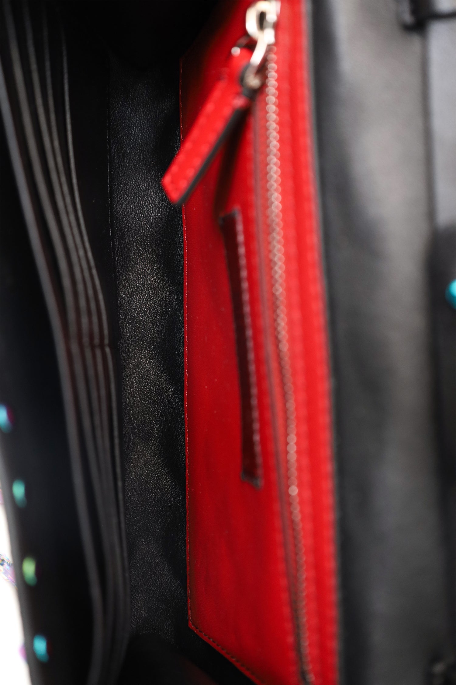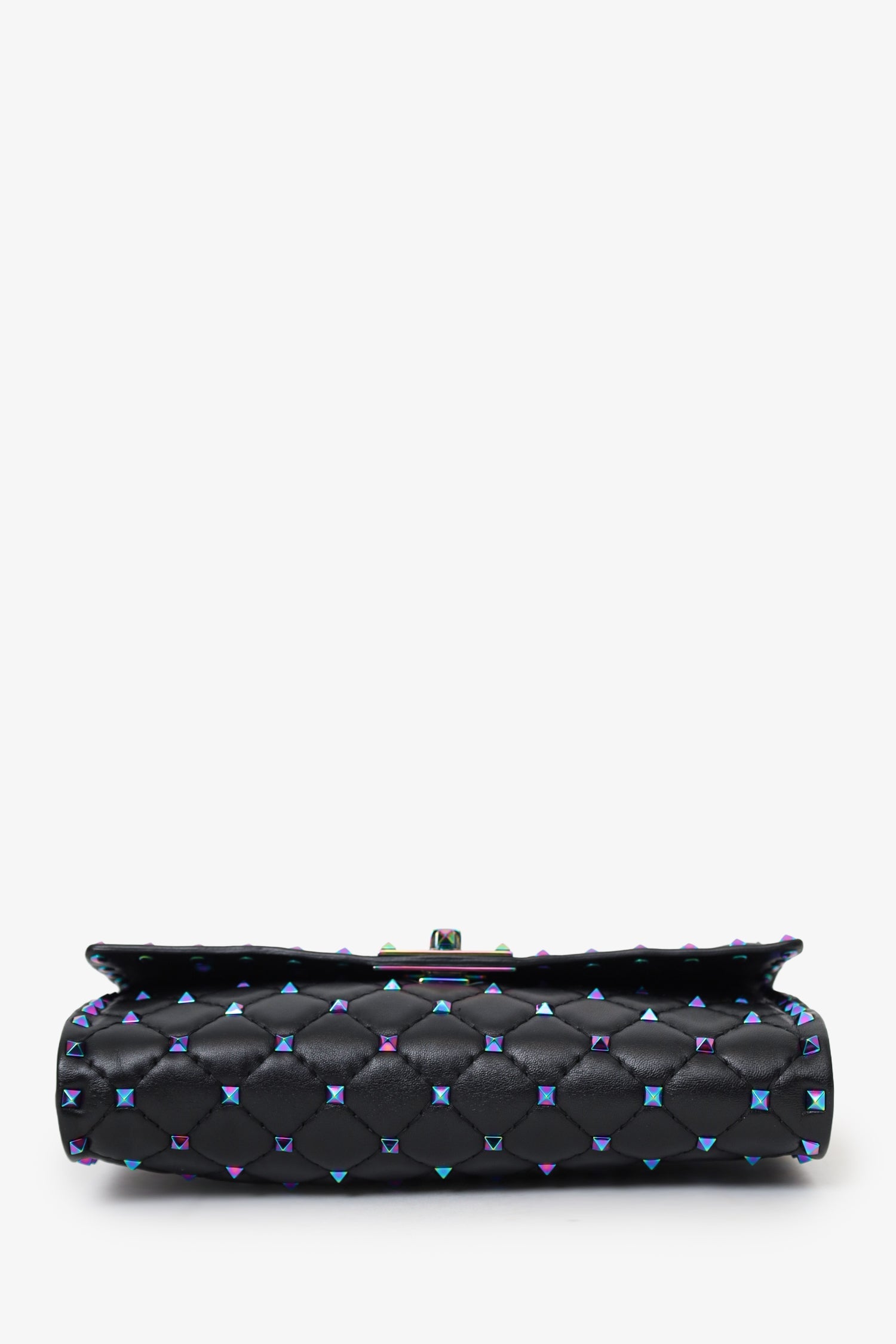 Valentino Black Lambskin Oil Slick Rockstud Spike Wallet on Chain. Front fold-over flap with turn-lock closure. Single crossbody chain link strap. Leather lined interior. 2 Interior compartments; front compartment with 1 large open pocket. Back compartment with 1 large open pocket, 8 card slots, and 1 zip pocket. Oil slick toned hardware. Tonal stitching.