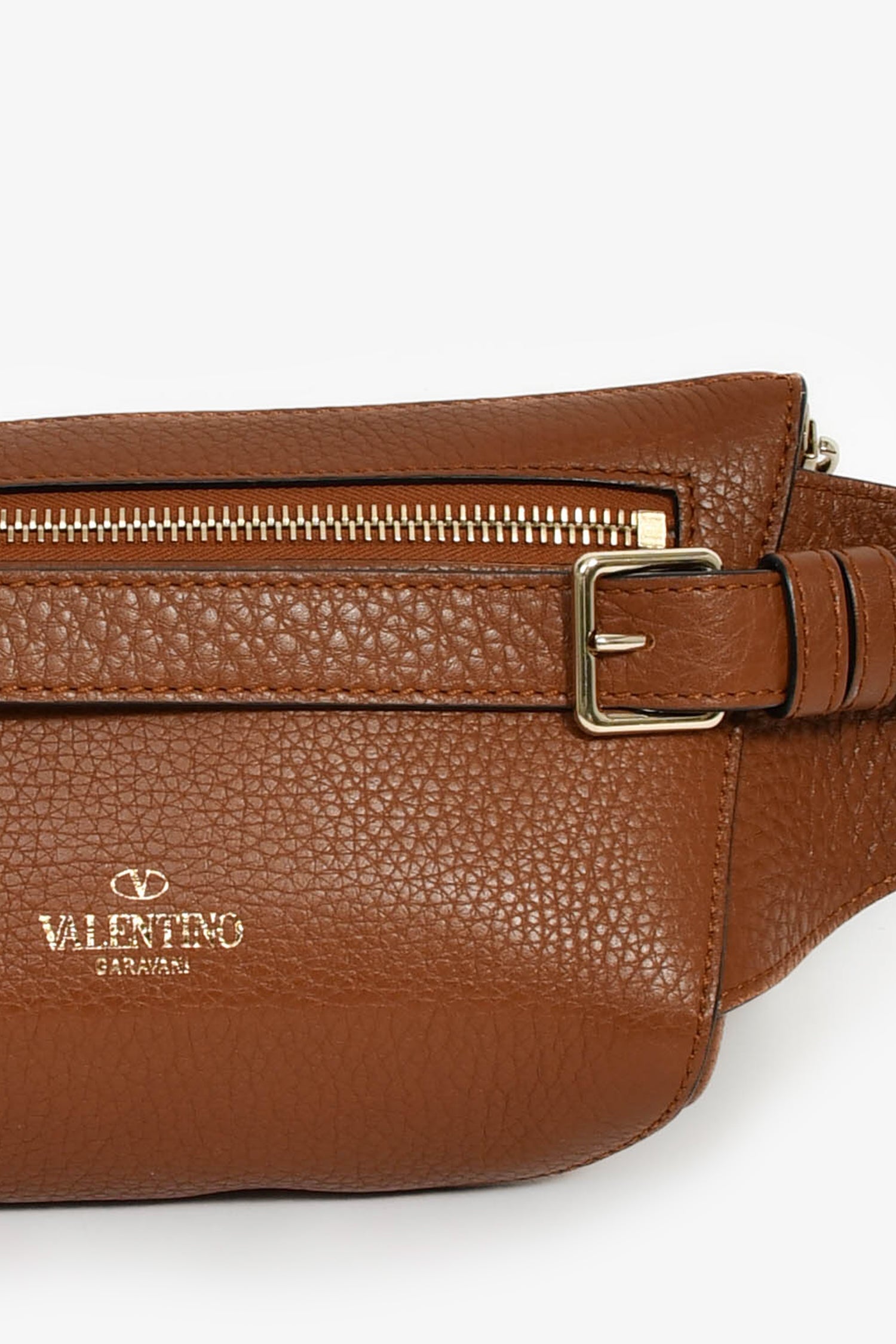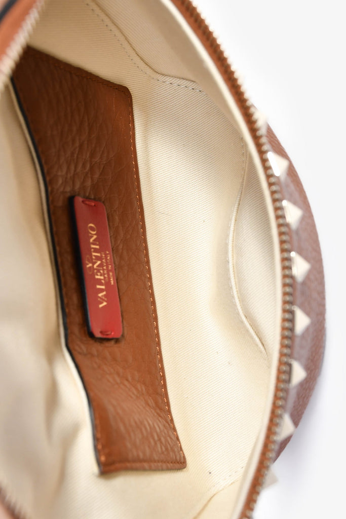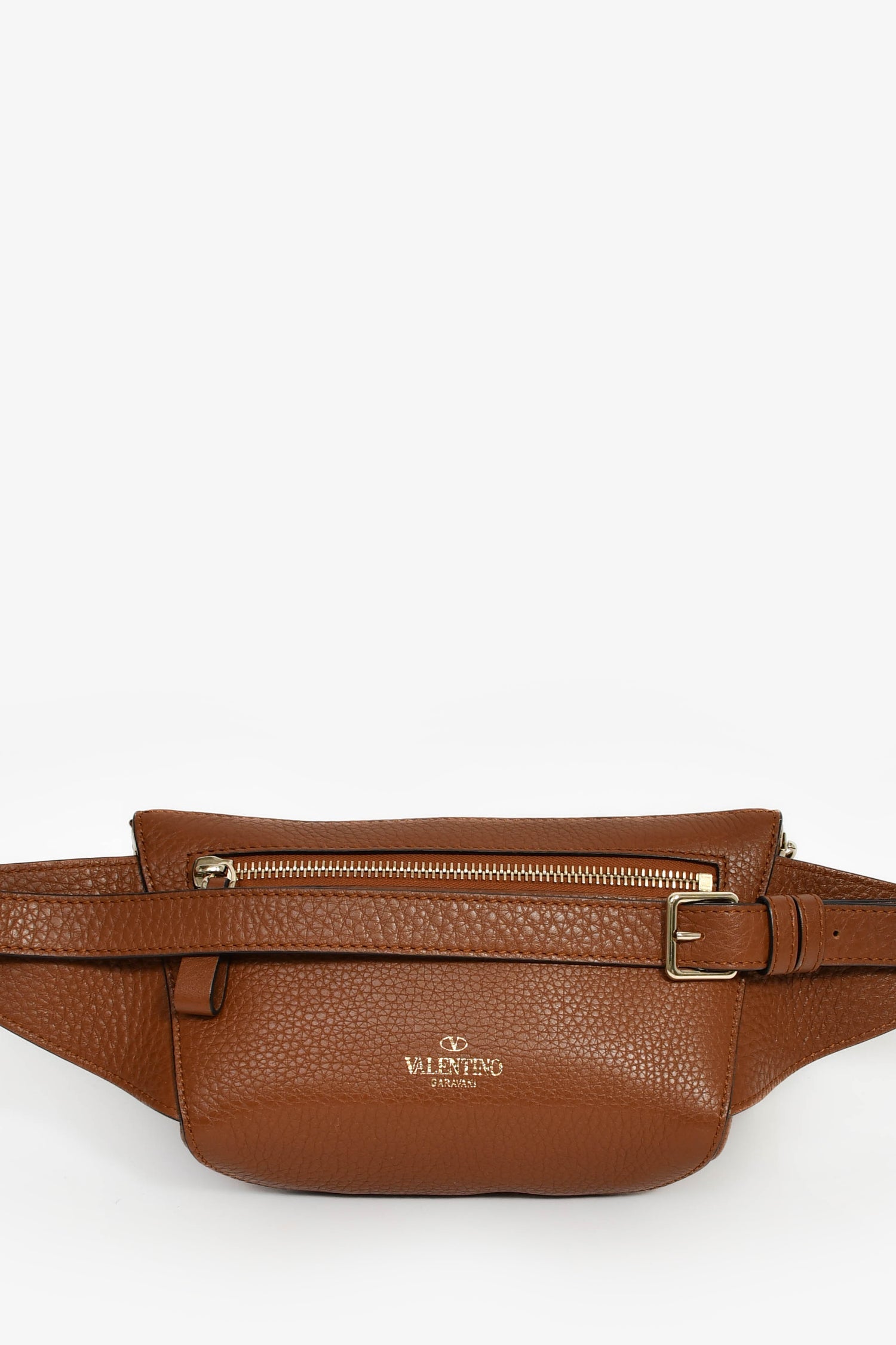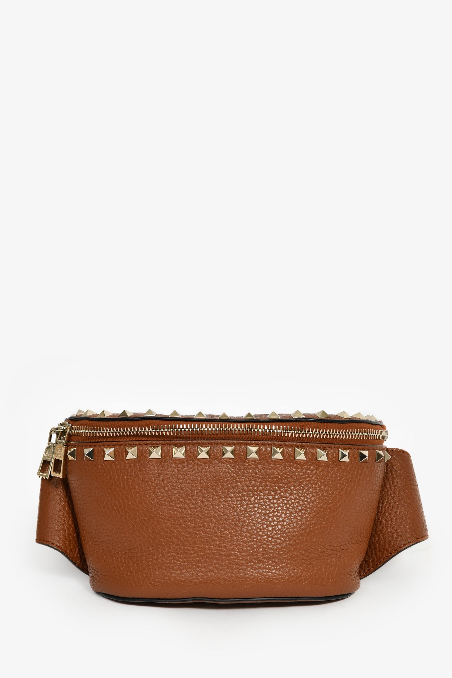 Valentino Cognac Rockstud Leather Pebble Belt Bag. Top zip closure. Attachable belt strap. Zipped exterior pocket. Canvas-lined interior with a single pocket. Gold-tone hardware. Tonal stitching.