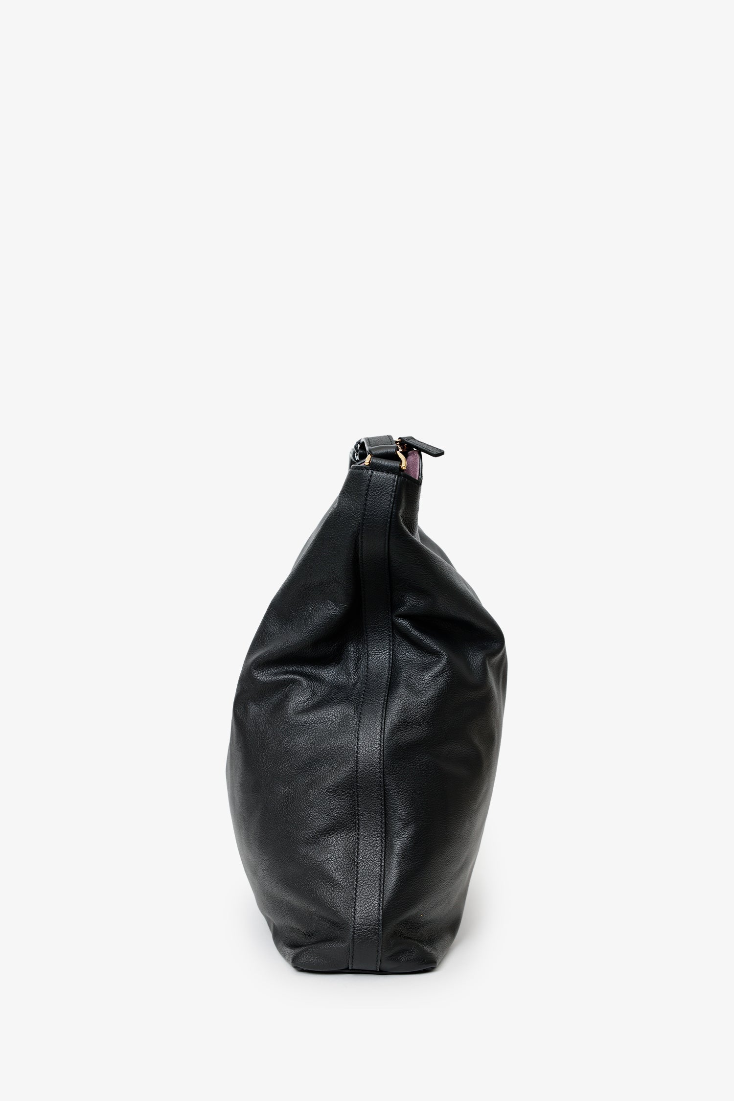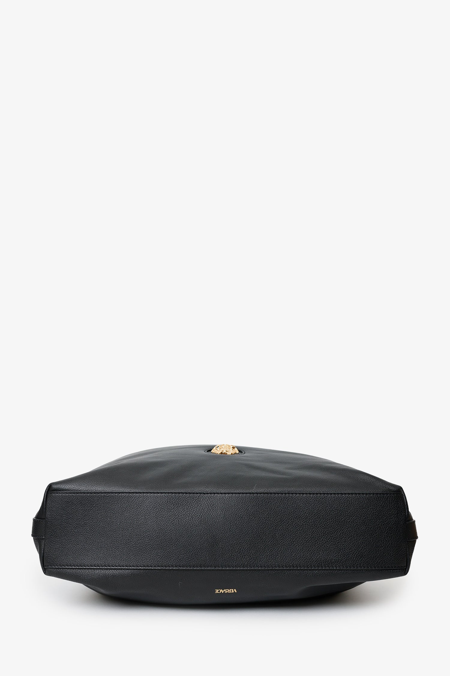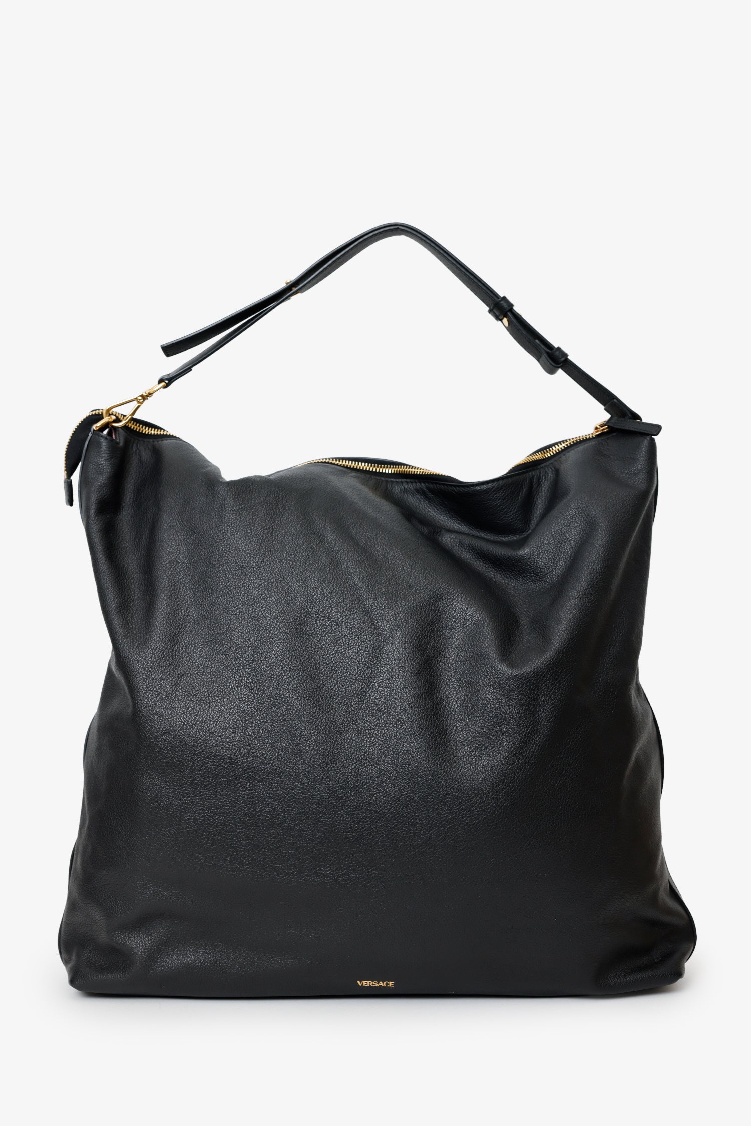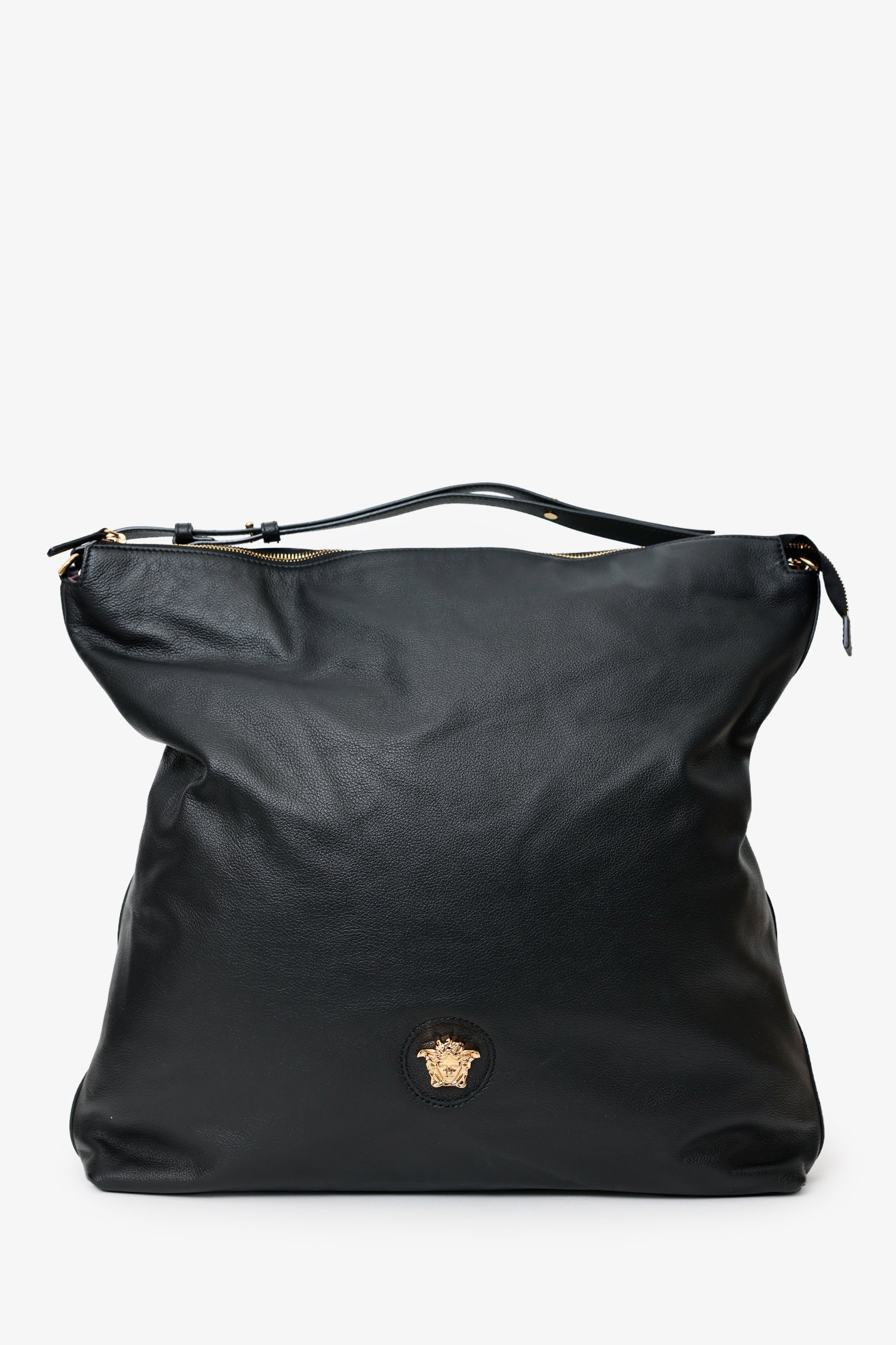 Versace Black Leather Pebbled Leather Medusa Large Hobo Shoulder Bag. Top zip closure. Top leather strap with one sided removable clasp closure and adjustable push-pin. Lined interior. 2 interior slip pockets. Gold-tone hardware. Tonal stitching.