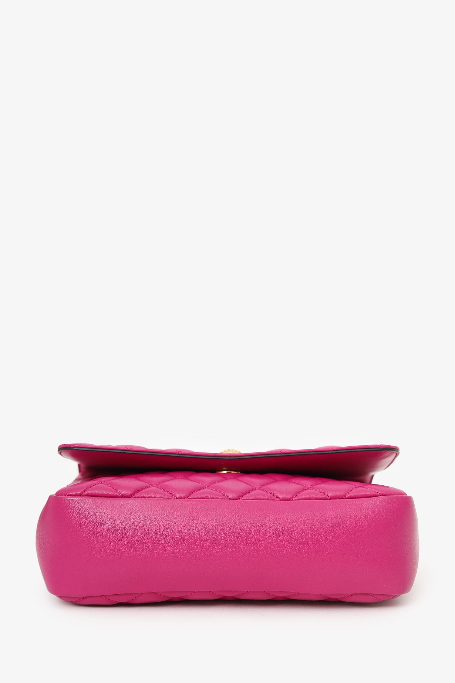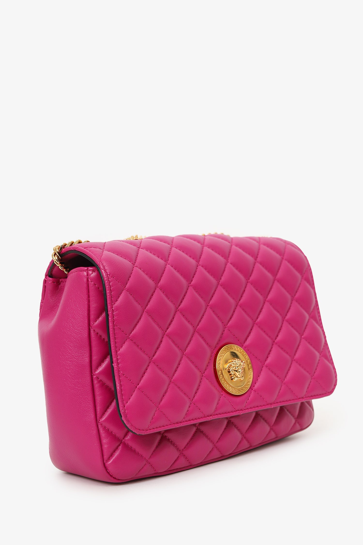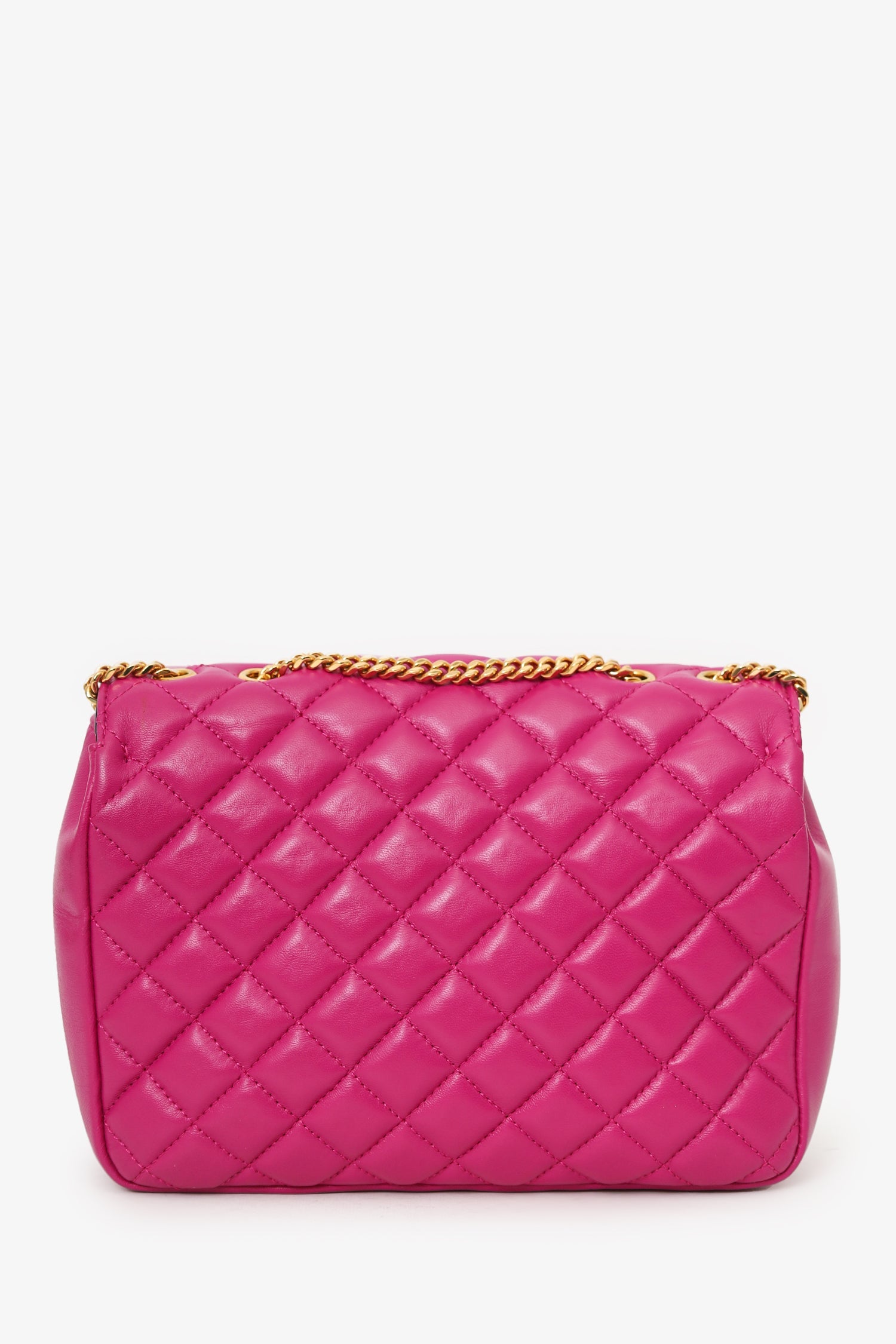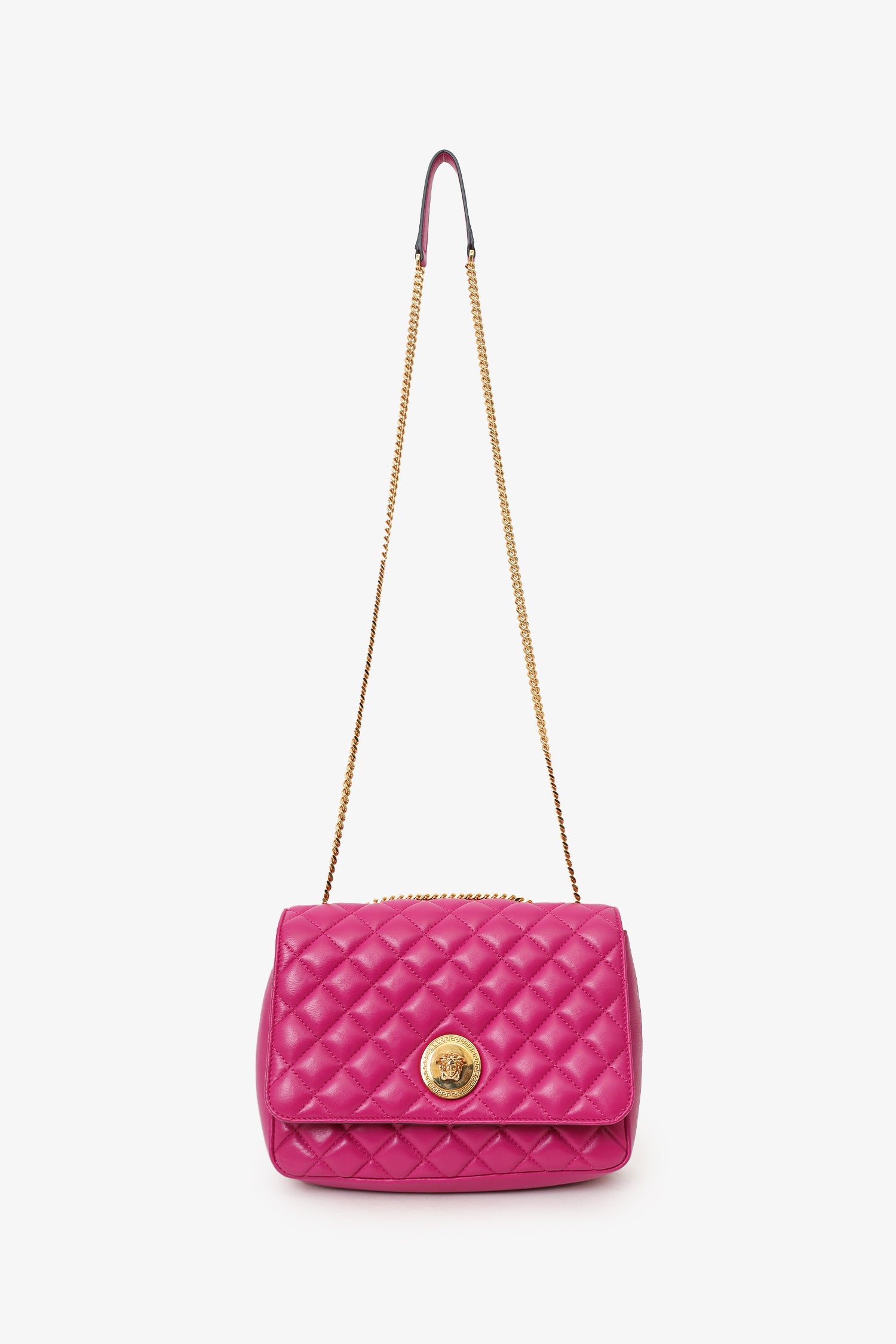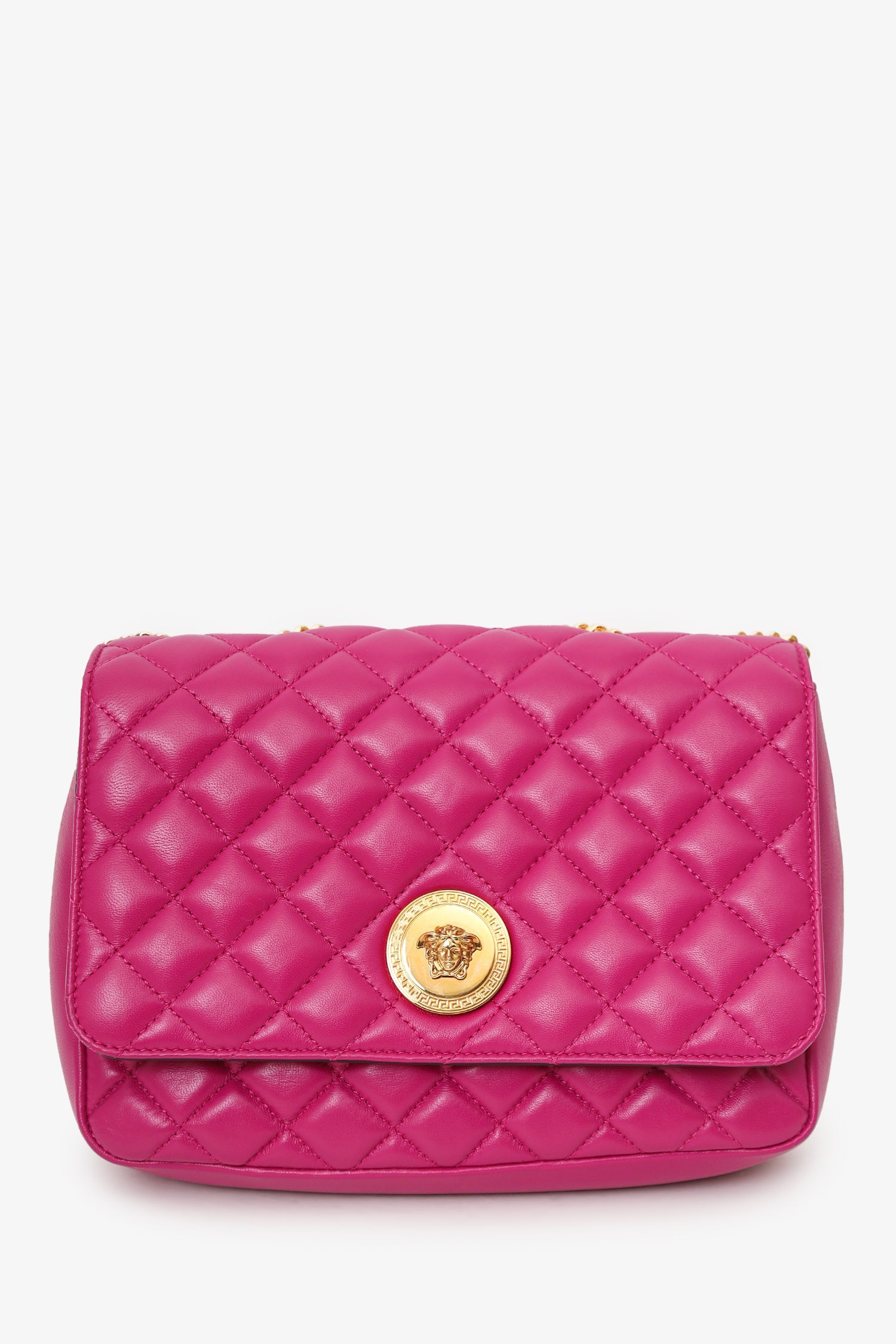Versace Fuchsia Nappa Quilted Leather Medusa Chain Bag. Front fold-over flap with magnetic closure. Twin chainlink straps that can be pulled into one long strap. Lined interior. Single interior slip pocket. Gold-tone hardware. Tonal stitching.