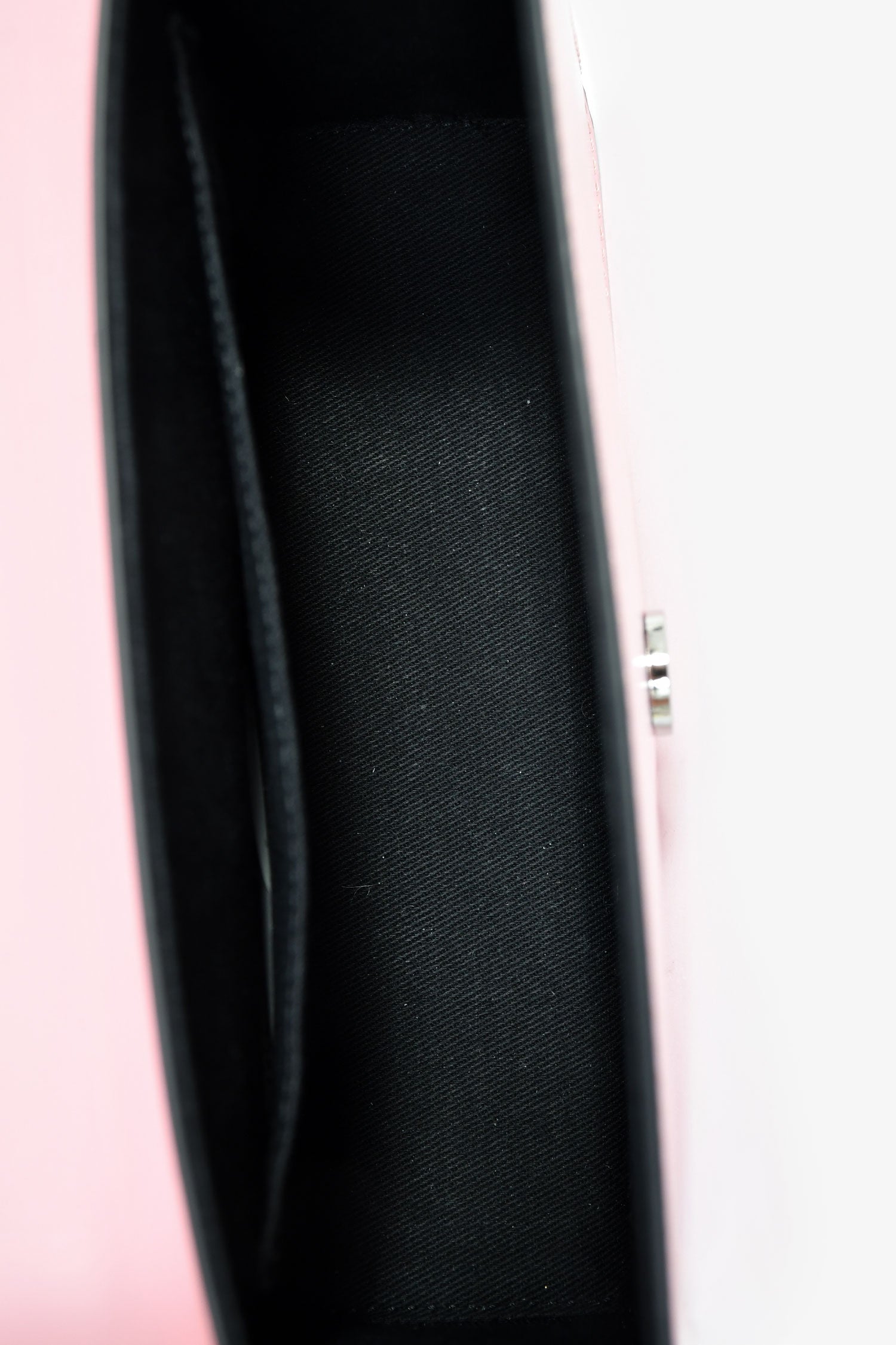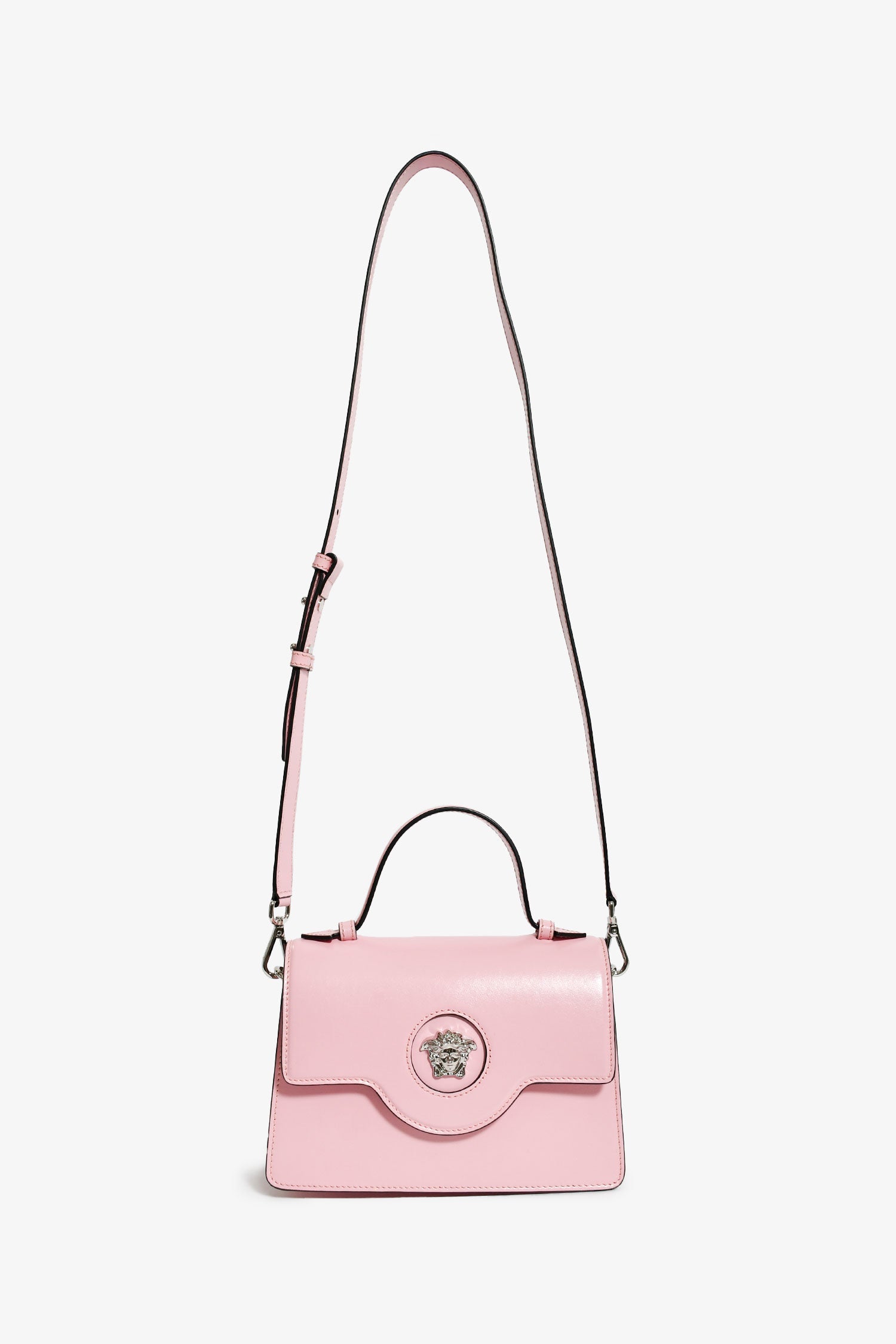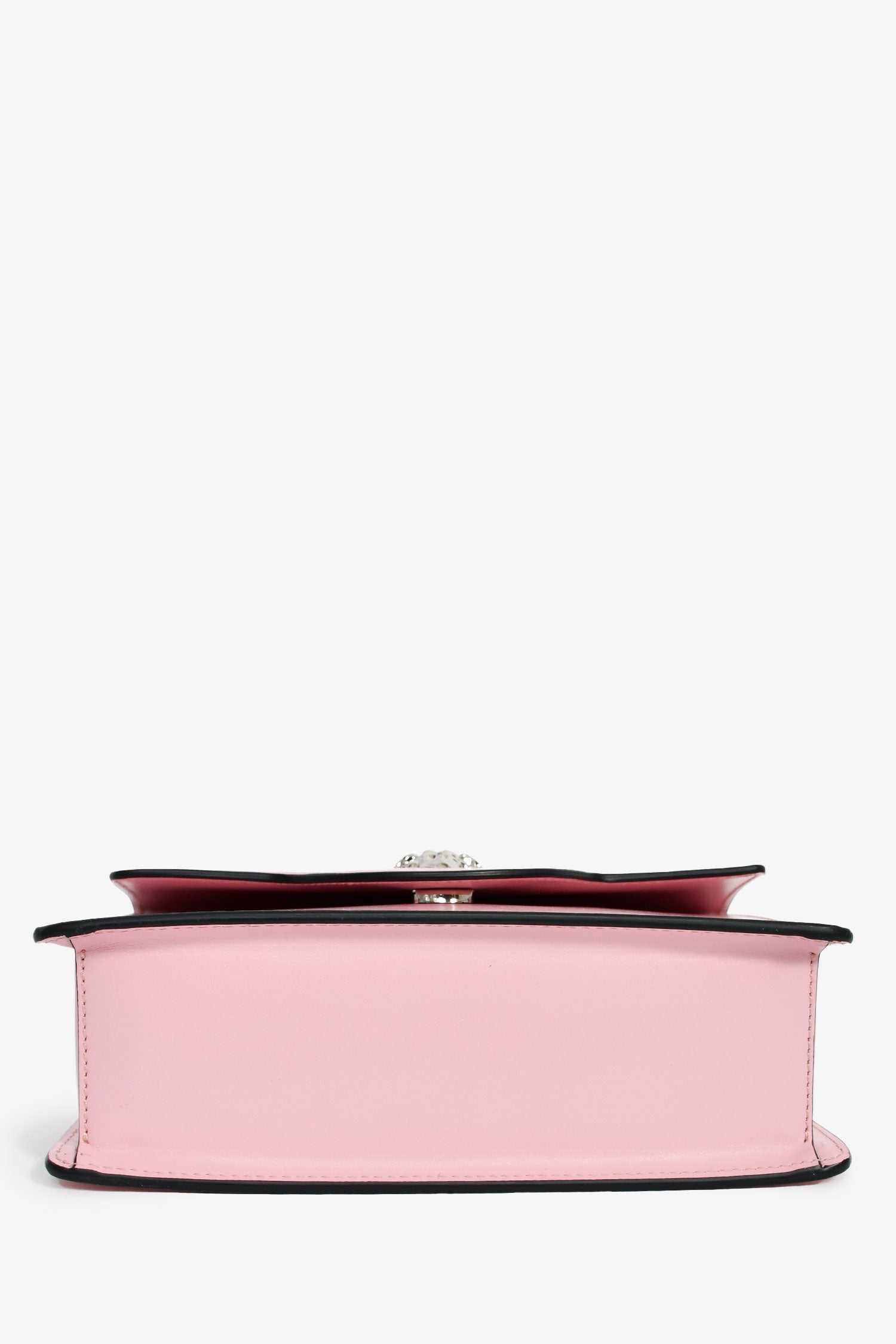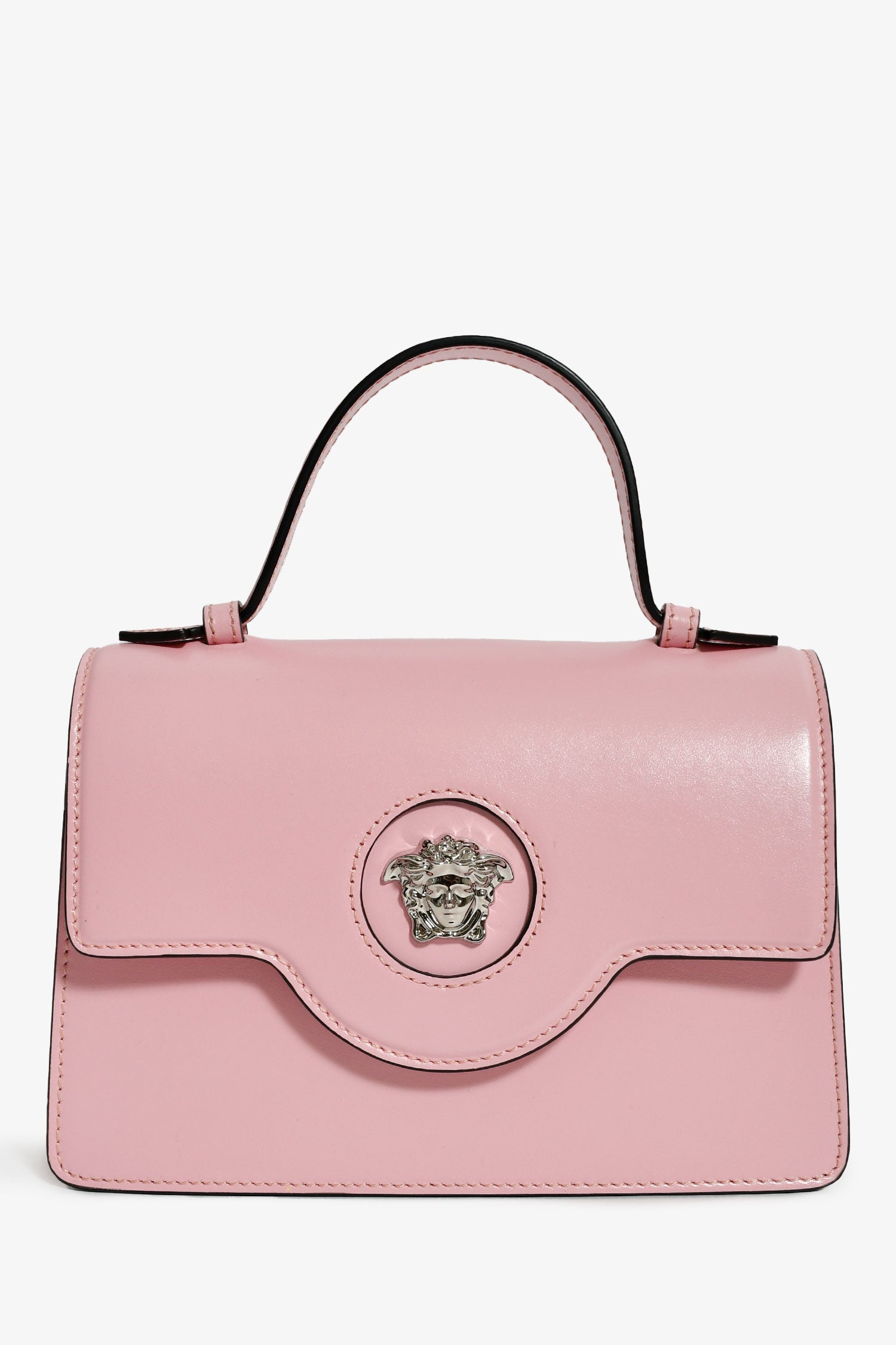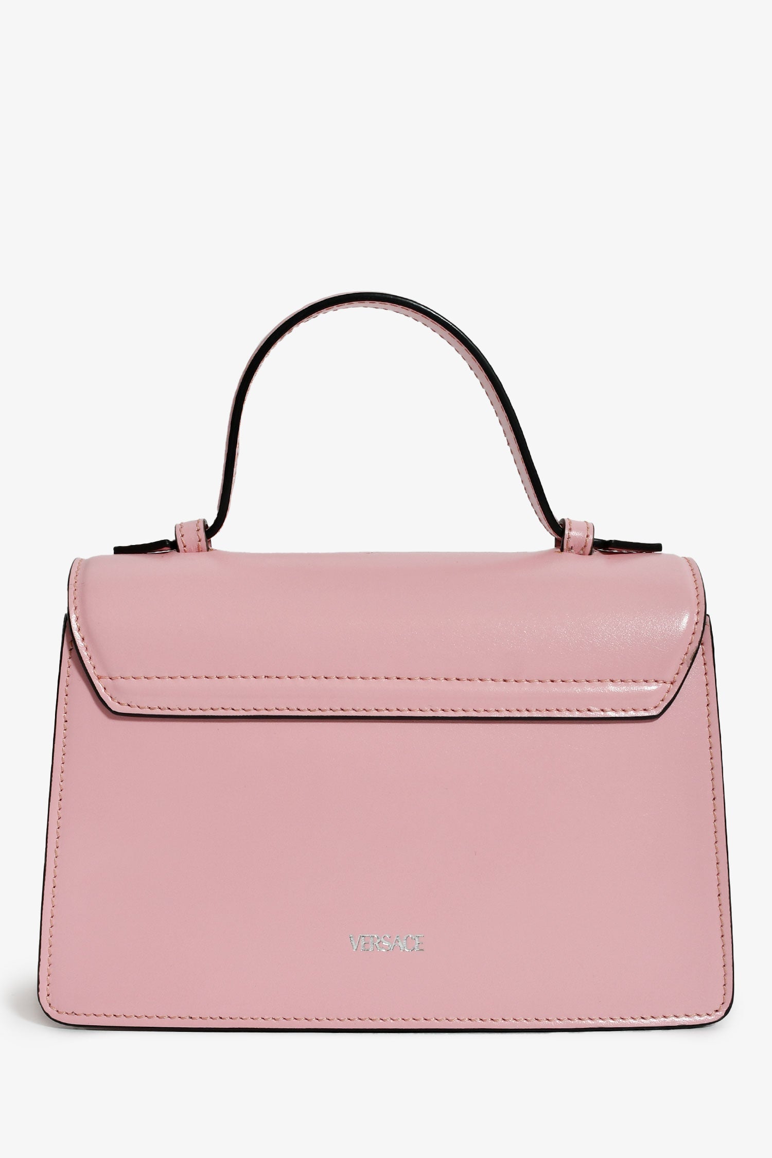 Versace Pink Leather Medusa Top Handle. Fold-over flap with a snap closure. Single top handle. Adjustable crossbody strap. Textile lined interior with 1 wall slot. Silver-tone hardware. Tonal stitching.