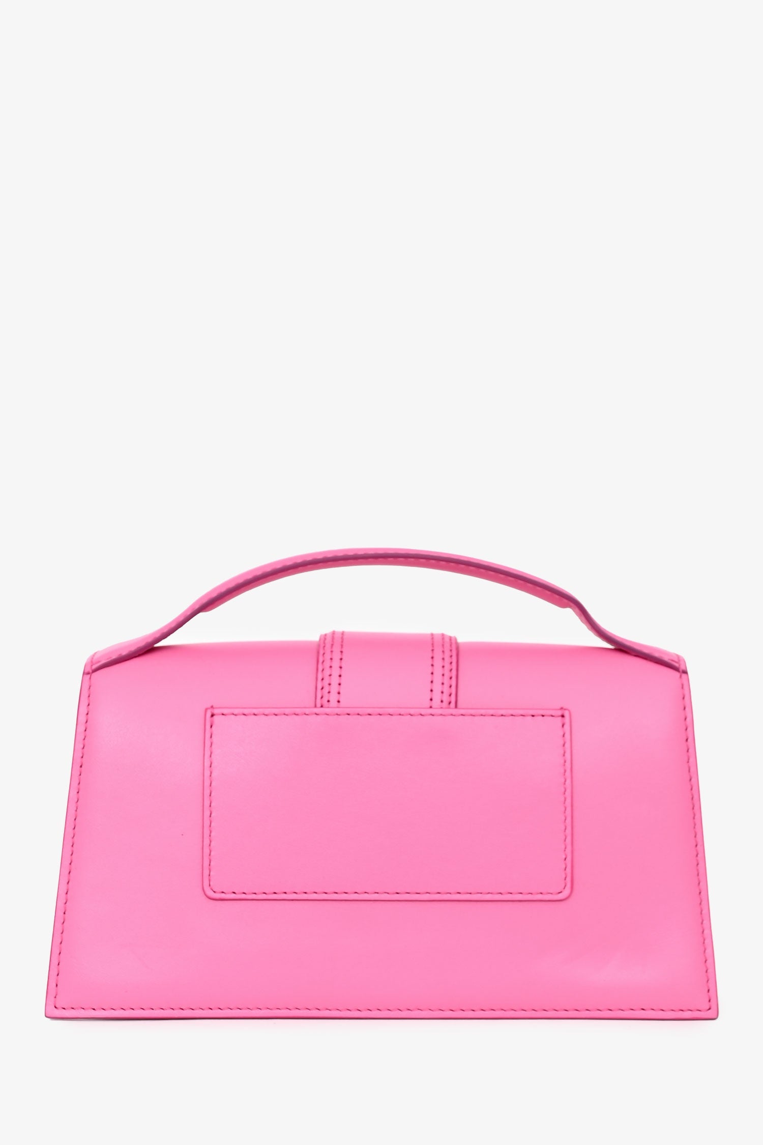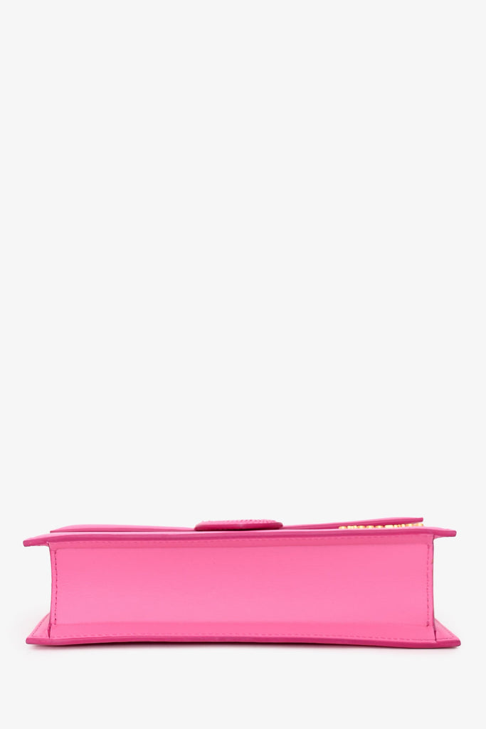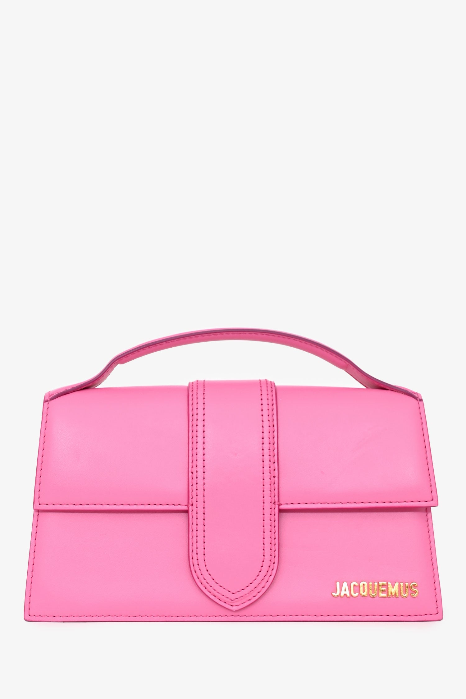 Jacquemus Pink Leather Le Bambino Top Handle Bag. Front fold-over flap with magnetic button closure. Single top handle. 1 exterior slip pocket. 1 interior slip pocket. Gold-tone hardware. Tonal stitching.