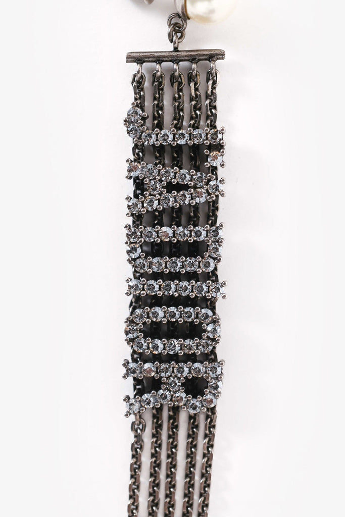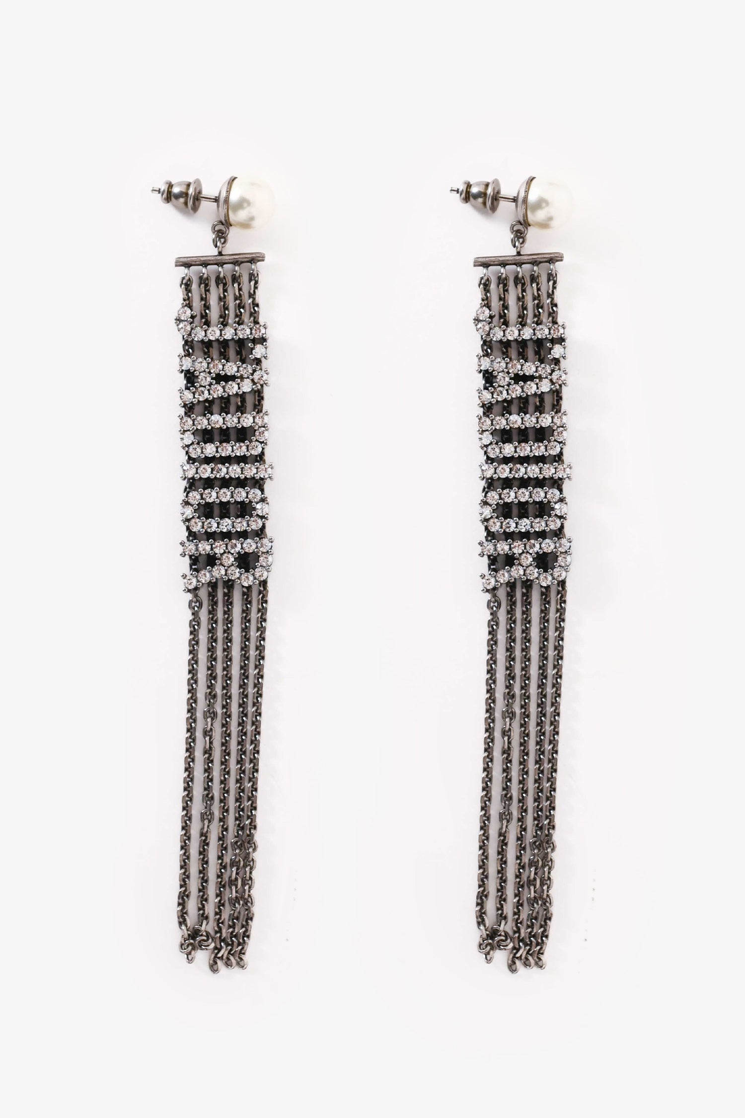 Christian Dior Silver Tone Metal/Faux Pearl/Crystal Embellished J'ADior Ear Pendants. Post-back fastening with faux pearl studs. Logo-detail upper bar accented with crystal embellishments and cascading chain fringe. Polished finish.