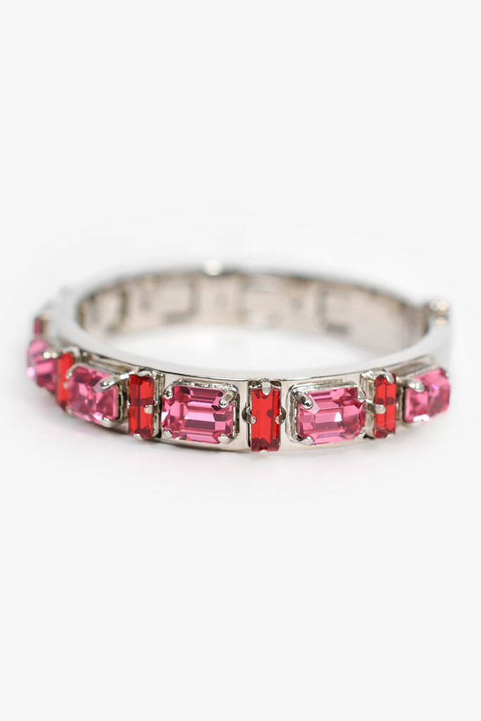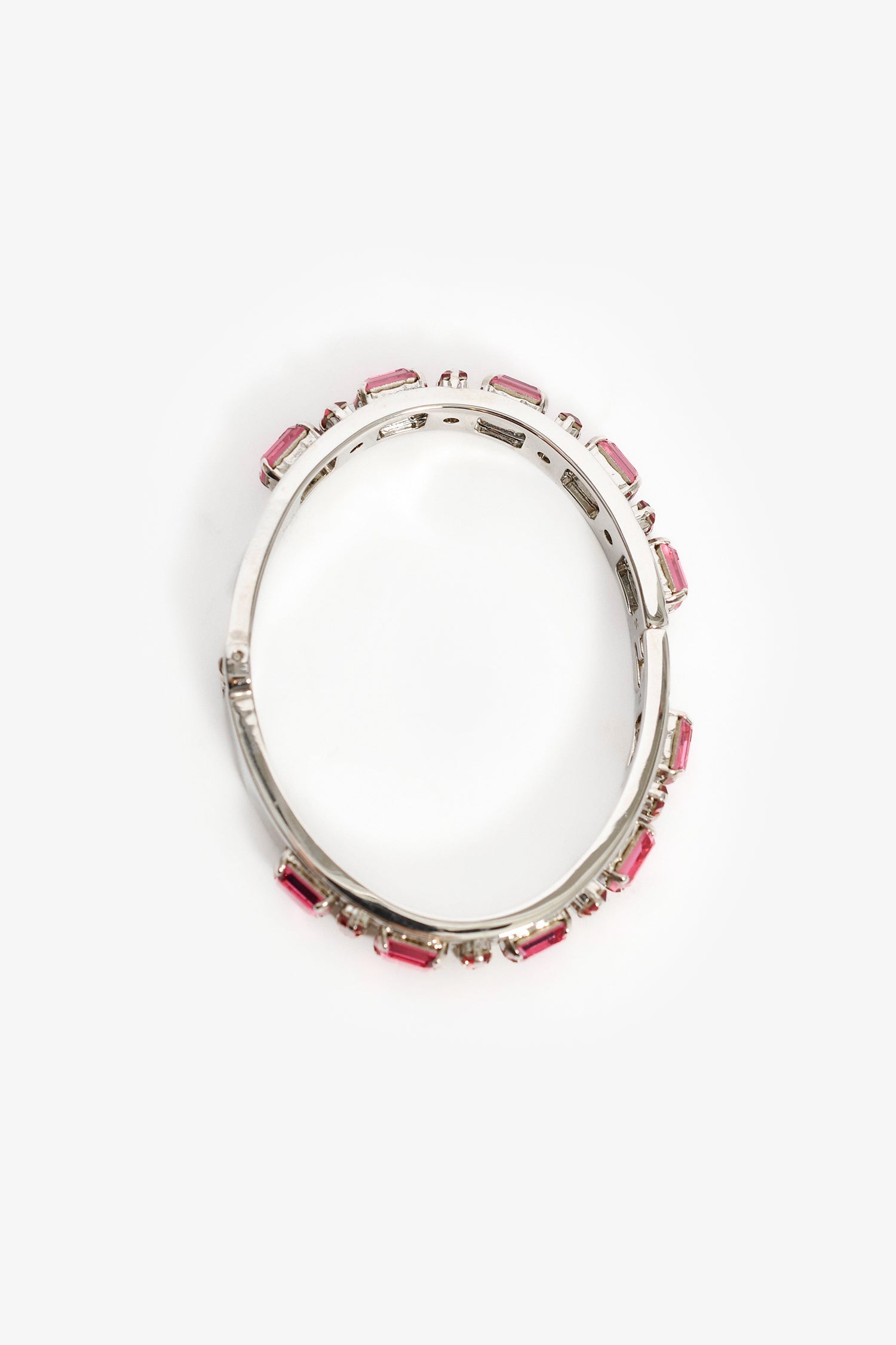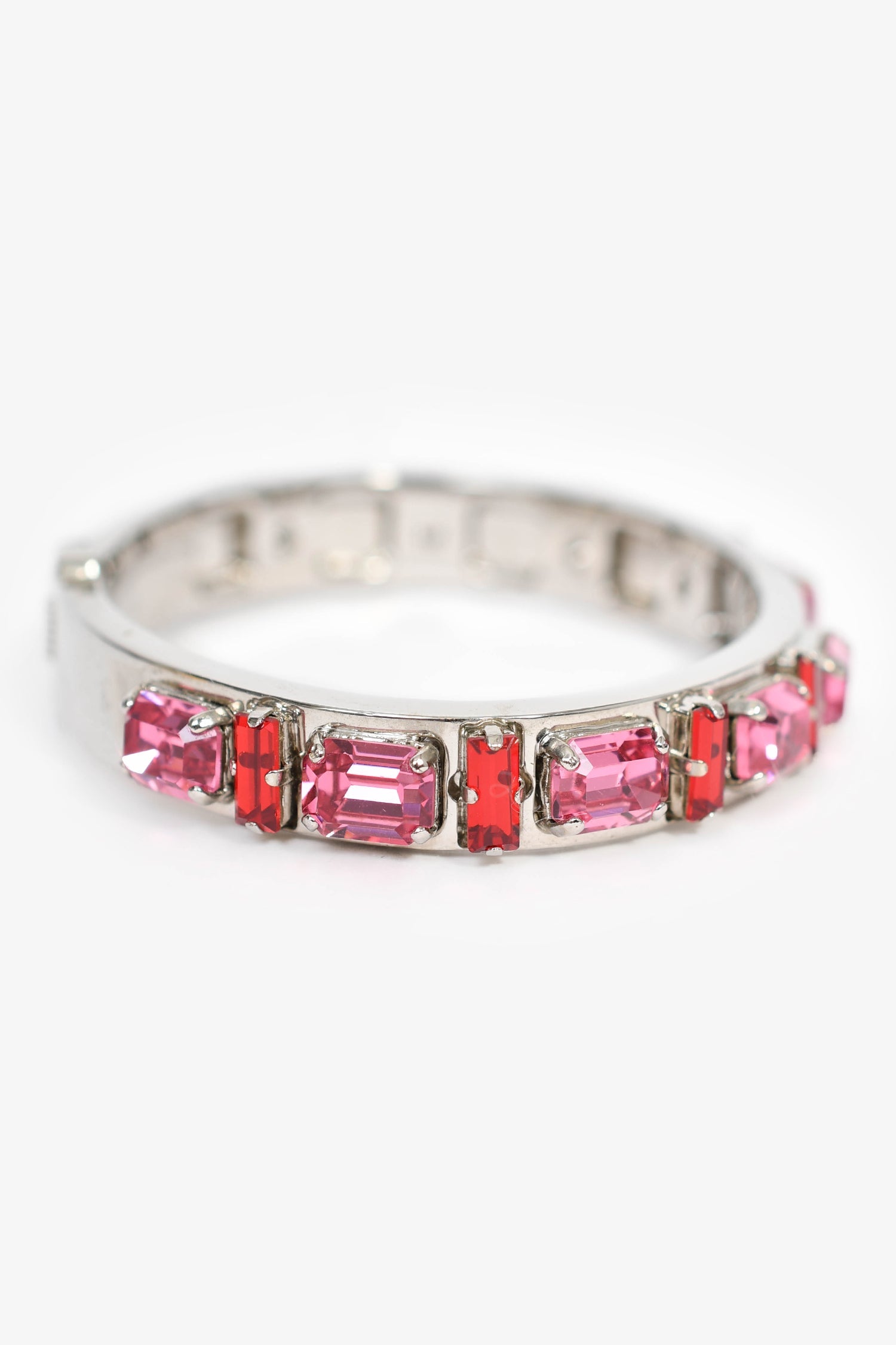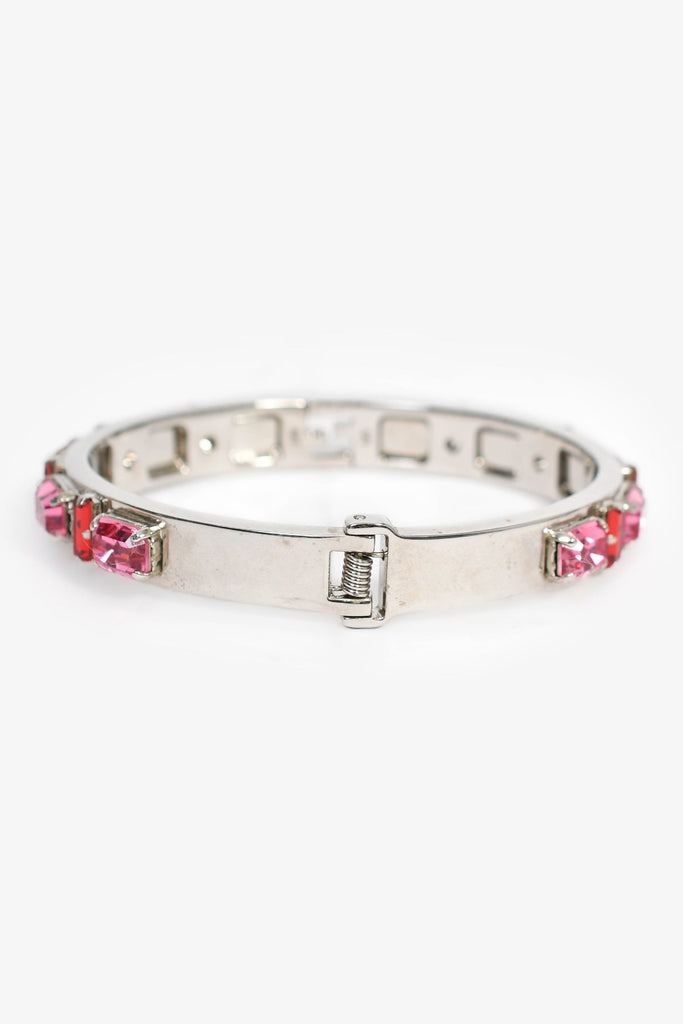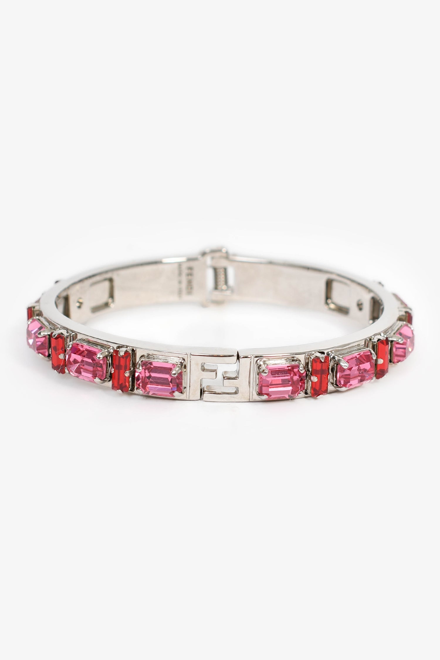 Fendi Silver Toned Red/Pink Crystal Bracelet. Silver-tone hardware. Hinge opening. Pink-tone crystals.