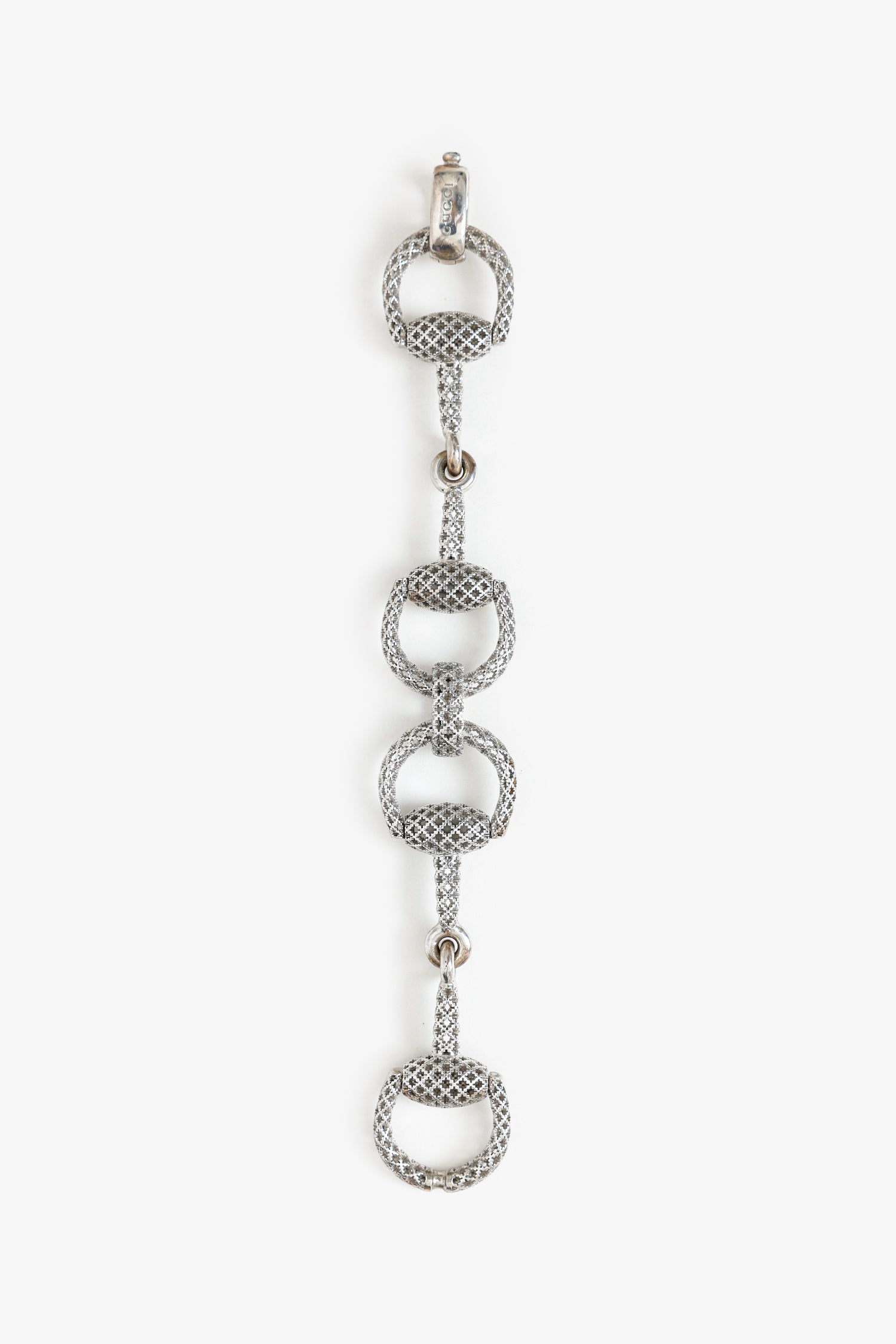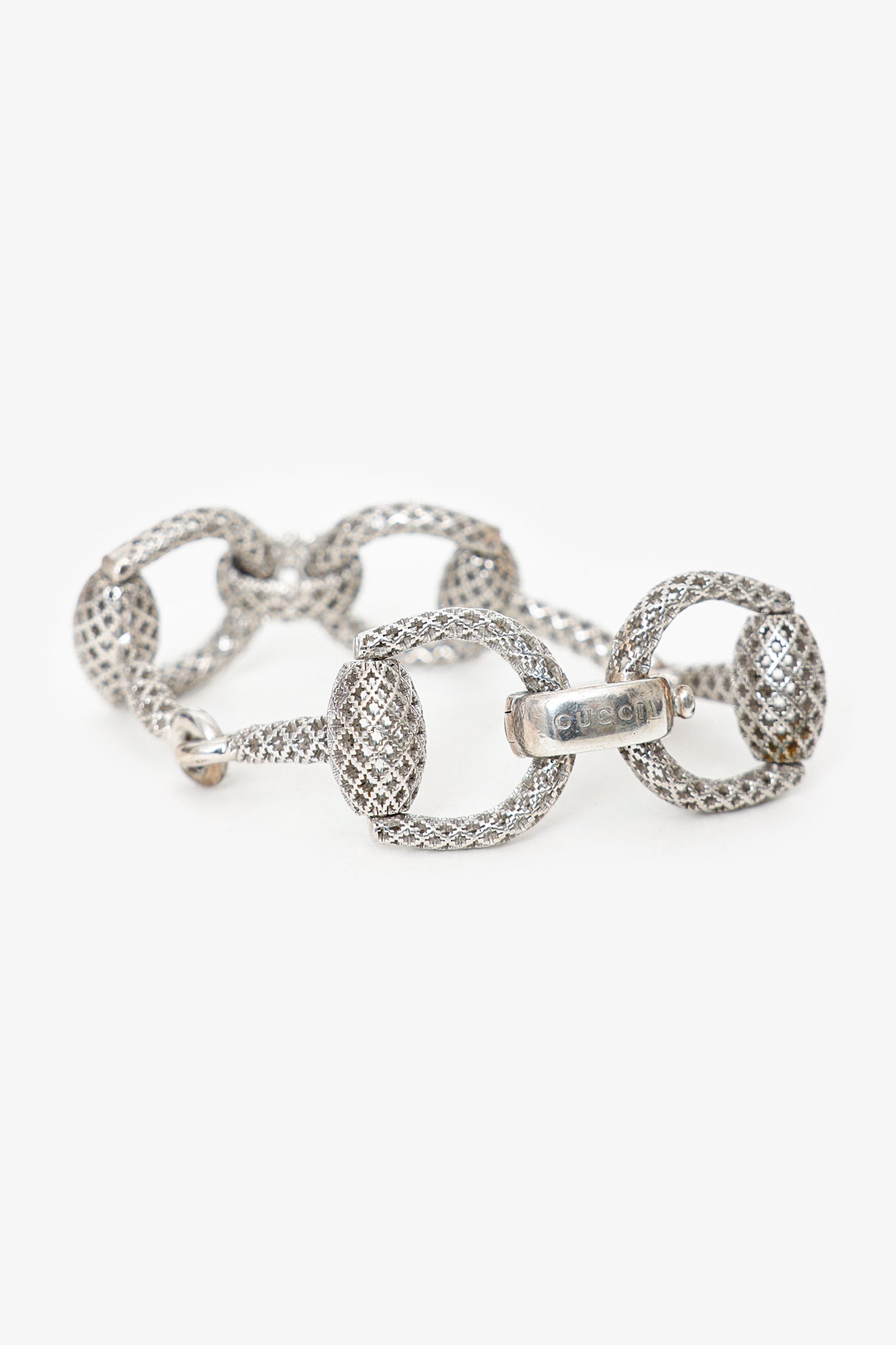 Gucci Sterling Silver Horsebit Diamantissima Bracelet. Rear clasp closure. Silver-tone hardware.
