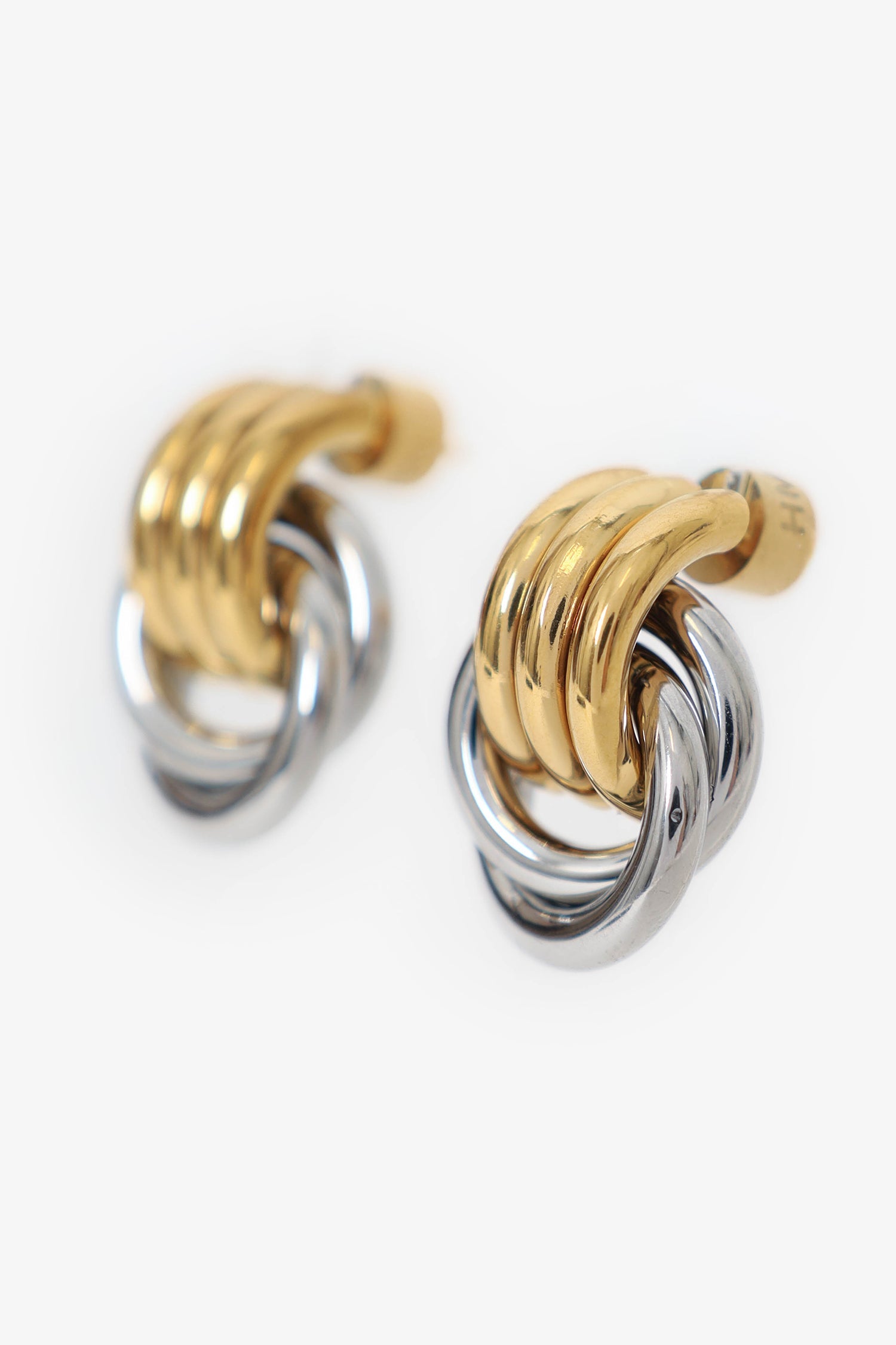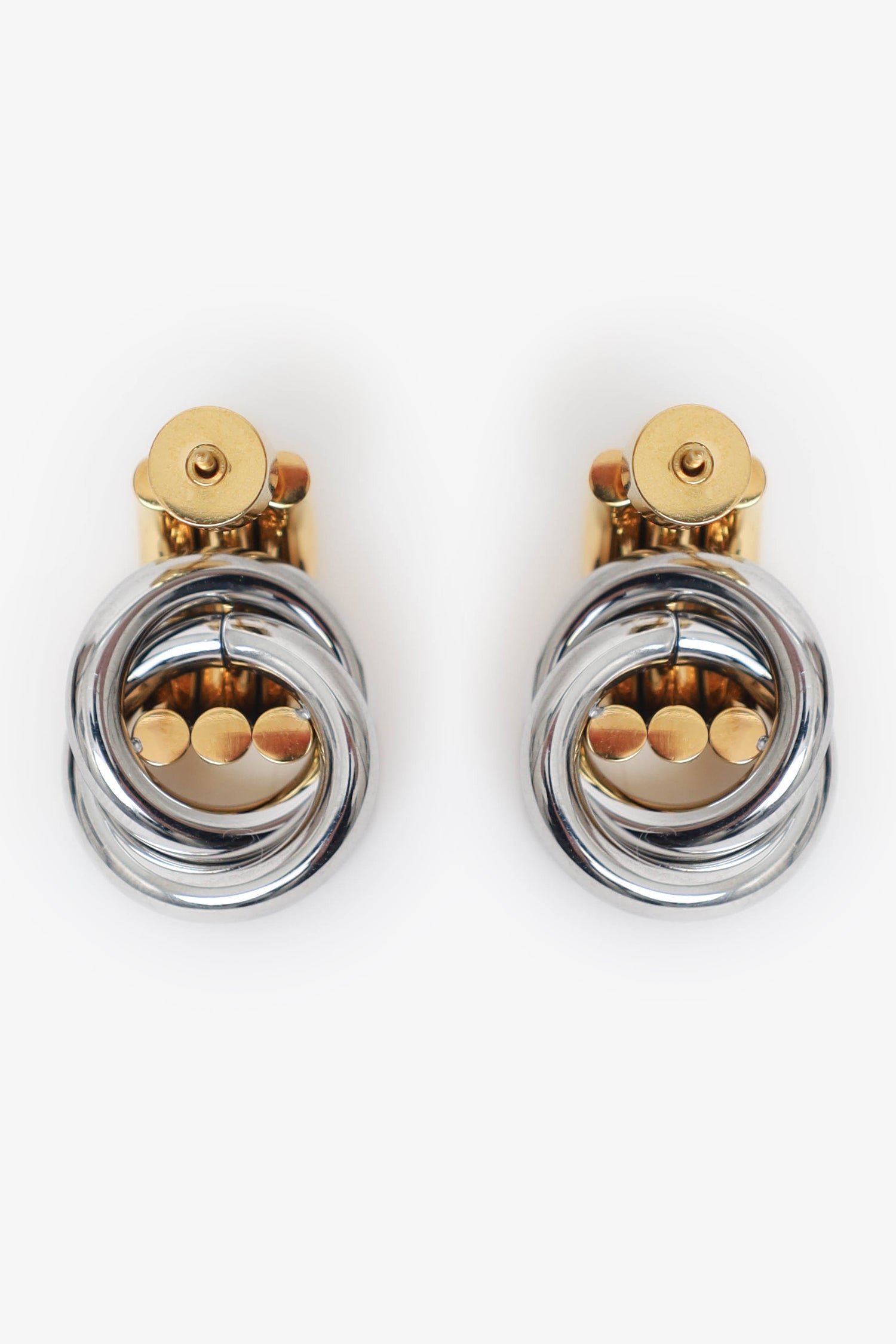 Heaven Mayhem Gold/Silver-Toned Baby Knot Earrings. Rear push-pin backing. Gold and silver-tone hardware.