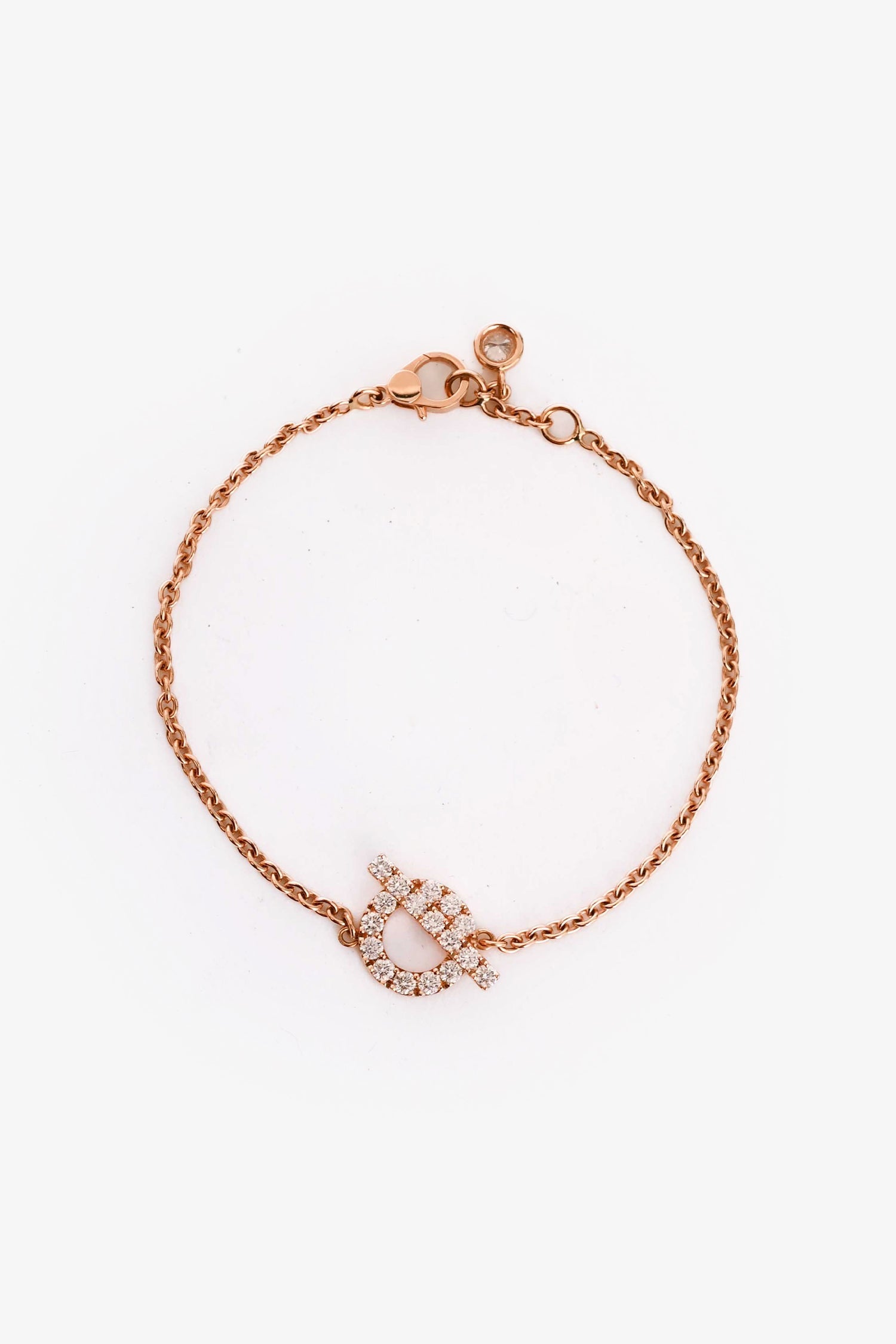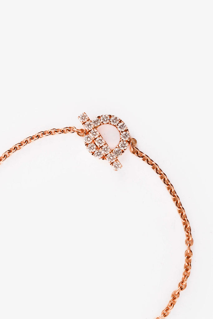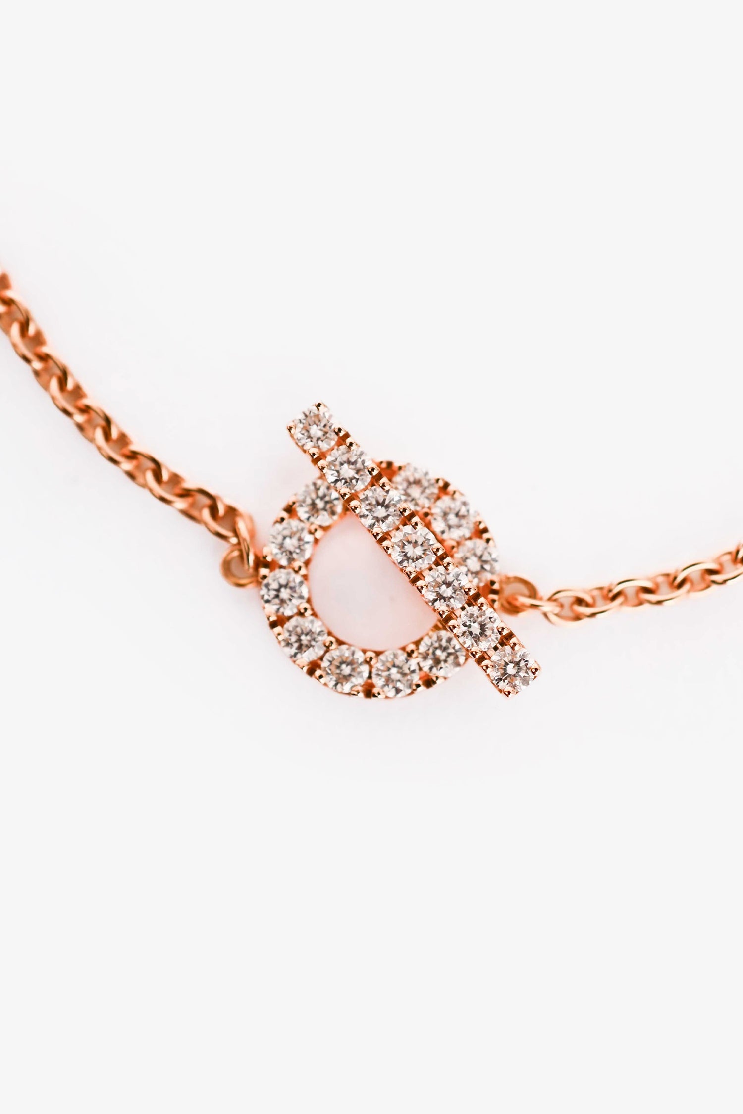 Hermes 18K Rose Gold Diamond Set Finesse Bracelet. 18 round, brilliant cut diamonds. Diamond encrusted open circle with a bar. Rose gold hardware. Lobster clasp closure.