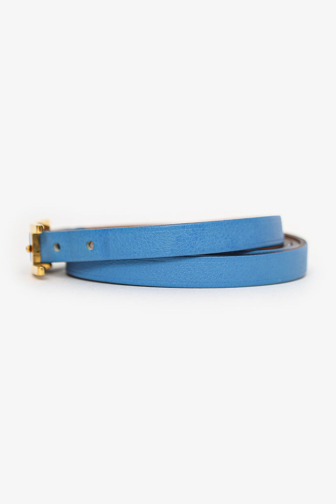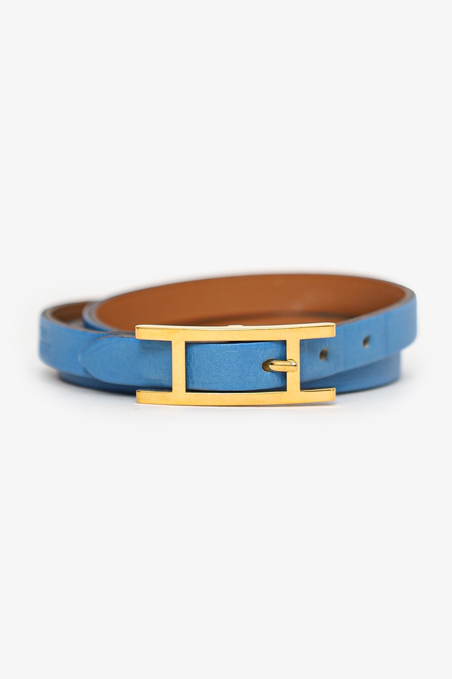 Hermès Blue Swift Leather Hapi 4 Tours Wrap Bracelet. Adjustable pull-through buckle closure. Gold-tone hardware.