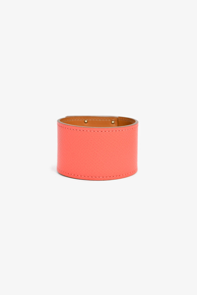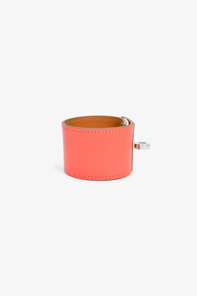 Hermes Coral Leather 'Kelly Dog' Bracelet. Silver-tone hardware. Turn-lock closure with 3 slot openings. Tonal stitching.