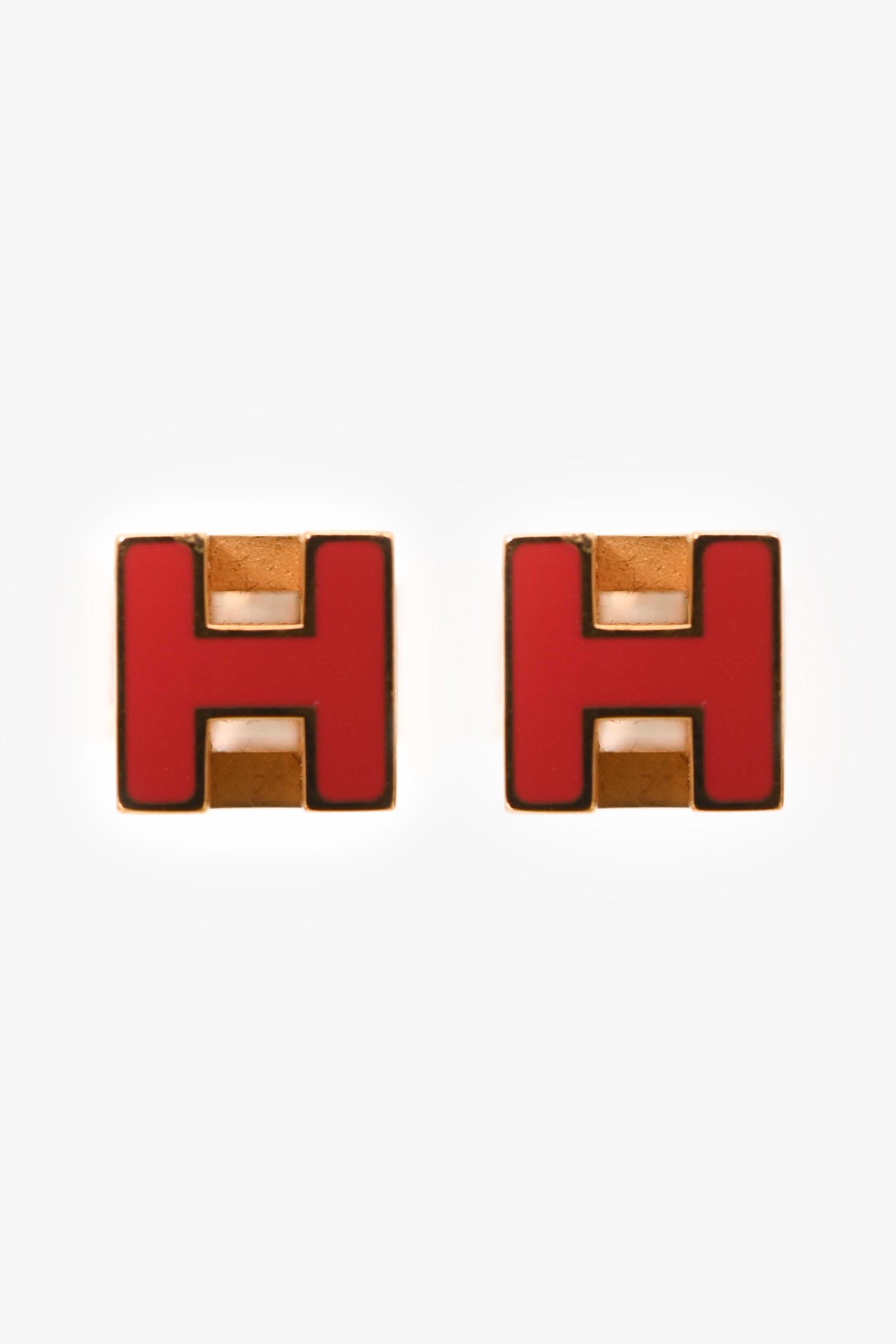 Hermès Gold-Tone Metal/Red Enamel H Cube Earrings. Post-back fastening. Signature H-shaped studs in red enamel with gold-tone trim. Polished finish.