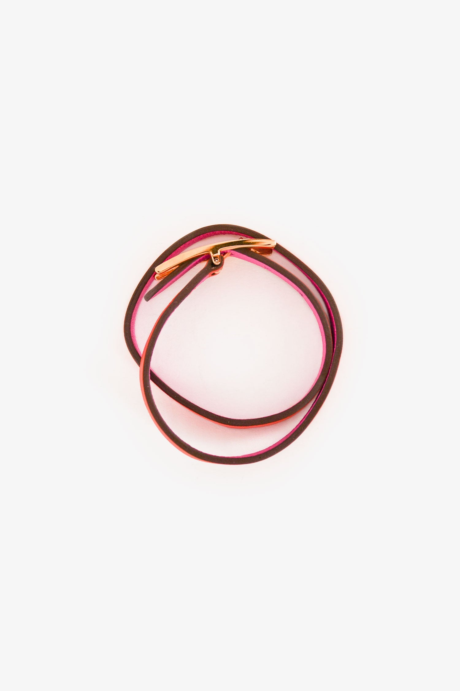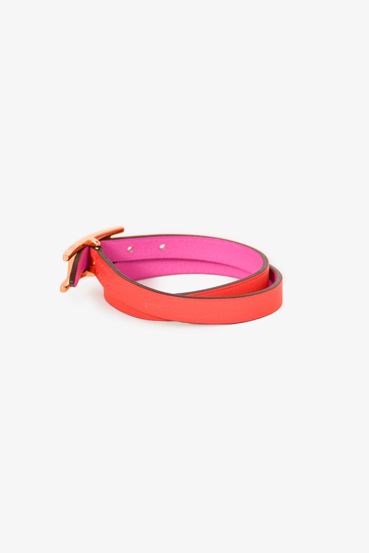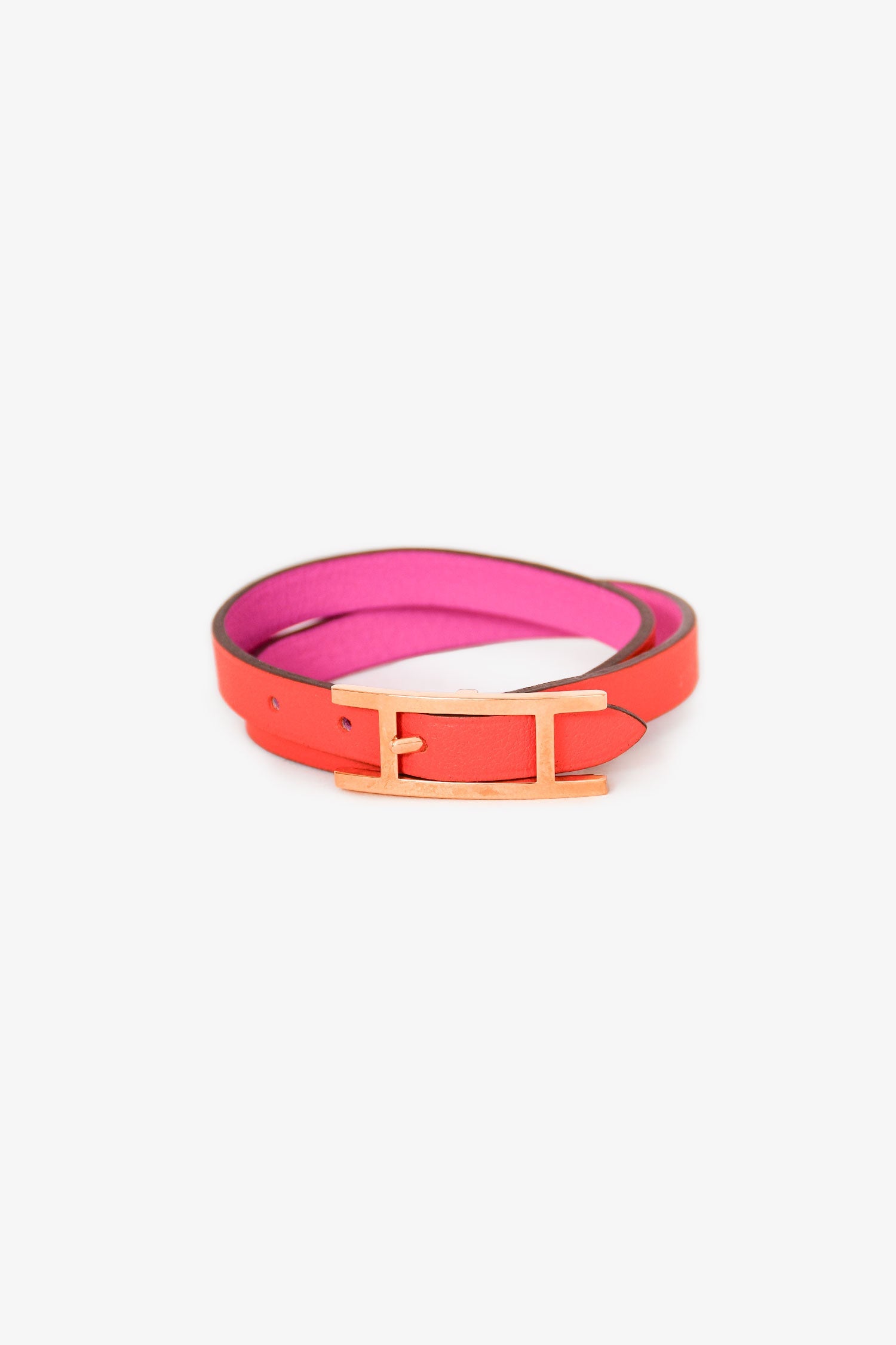 Hermes Red/Pink Swift Leather Behapi Double Tour Bracelet. Gold-tone hardware. Coated trimming. Tonal stitching.