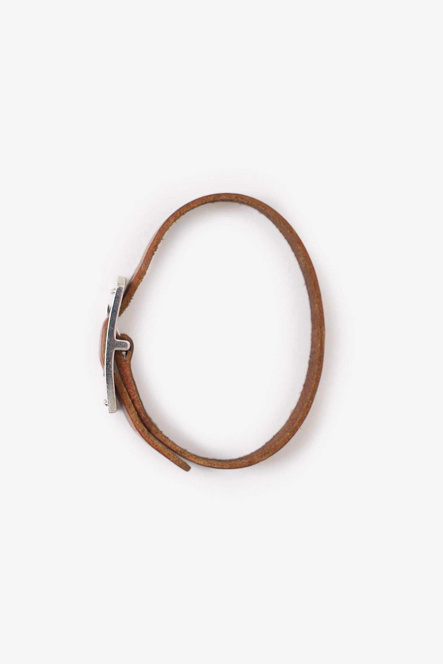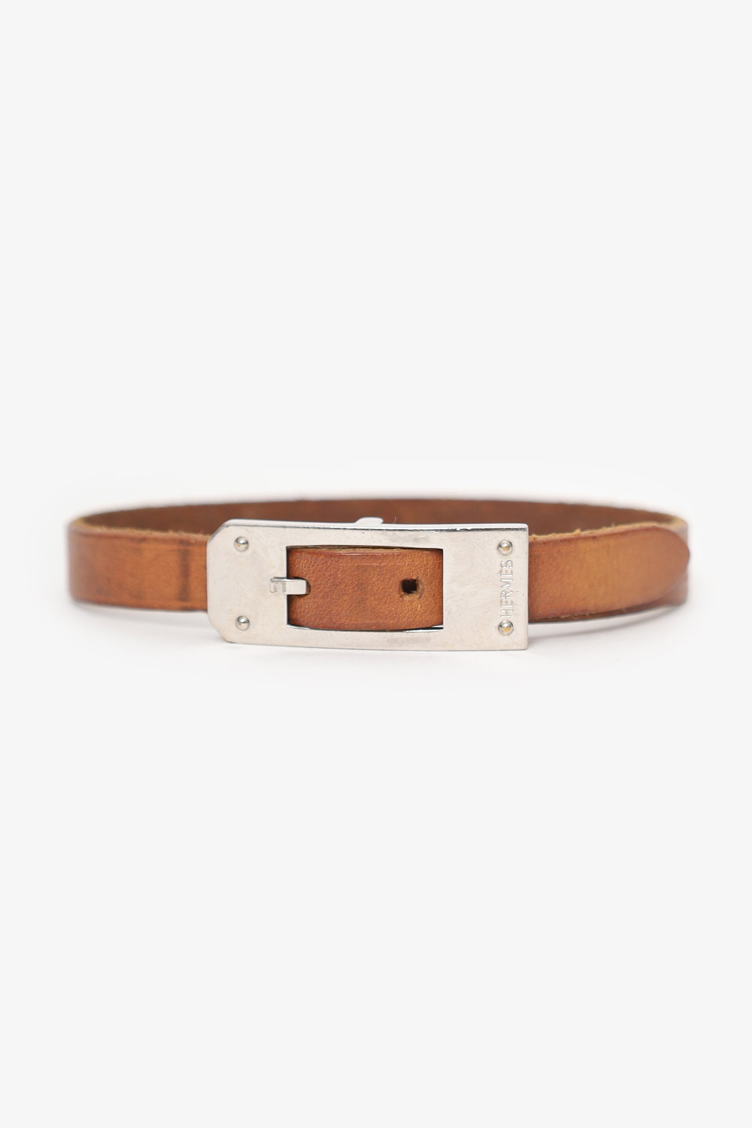 Hermes Tan Leather Api Bracelet. Adjustable pull-through buckle closure. Contrast stitching. Silver-tone hardware.