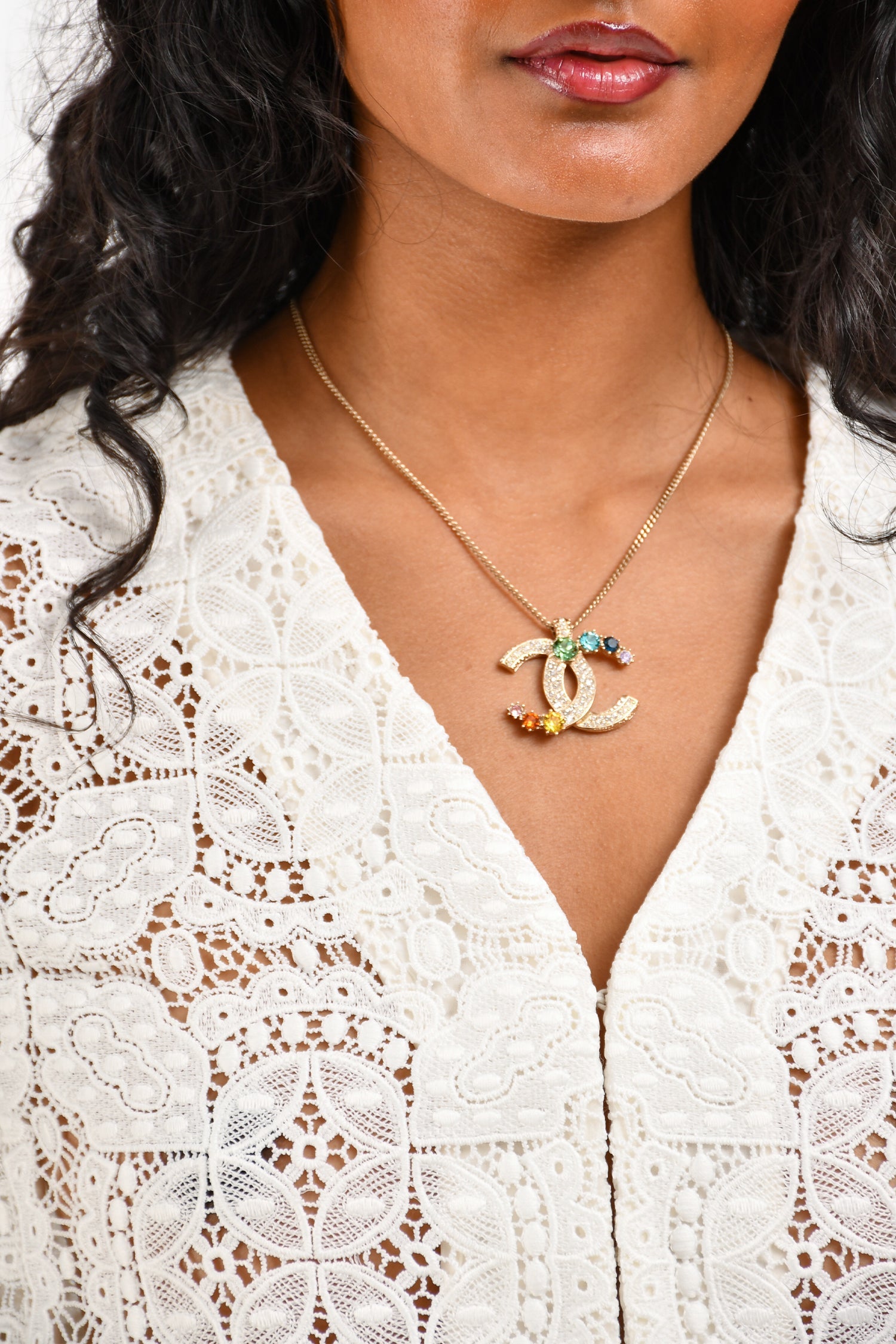 Pre-Loved Chanel™ 2019 Gold Toned Rainbow Crystal CC Necklace. Lobster clasp closure.