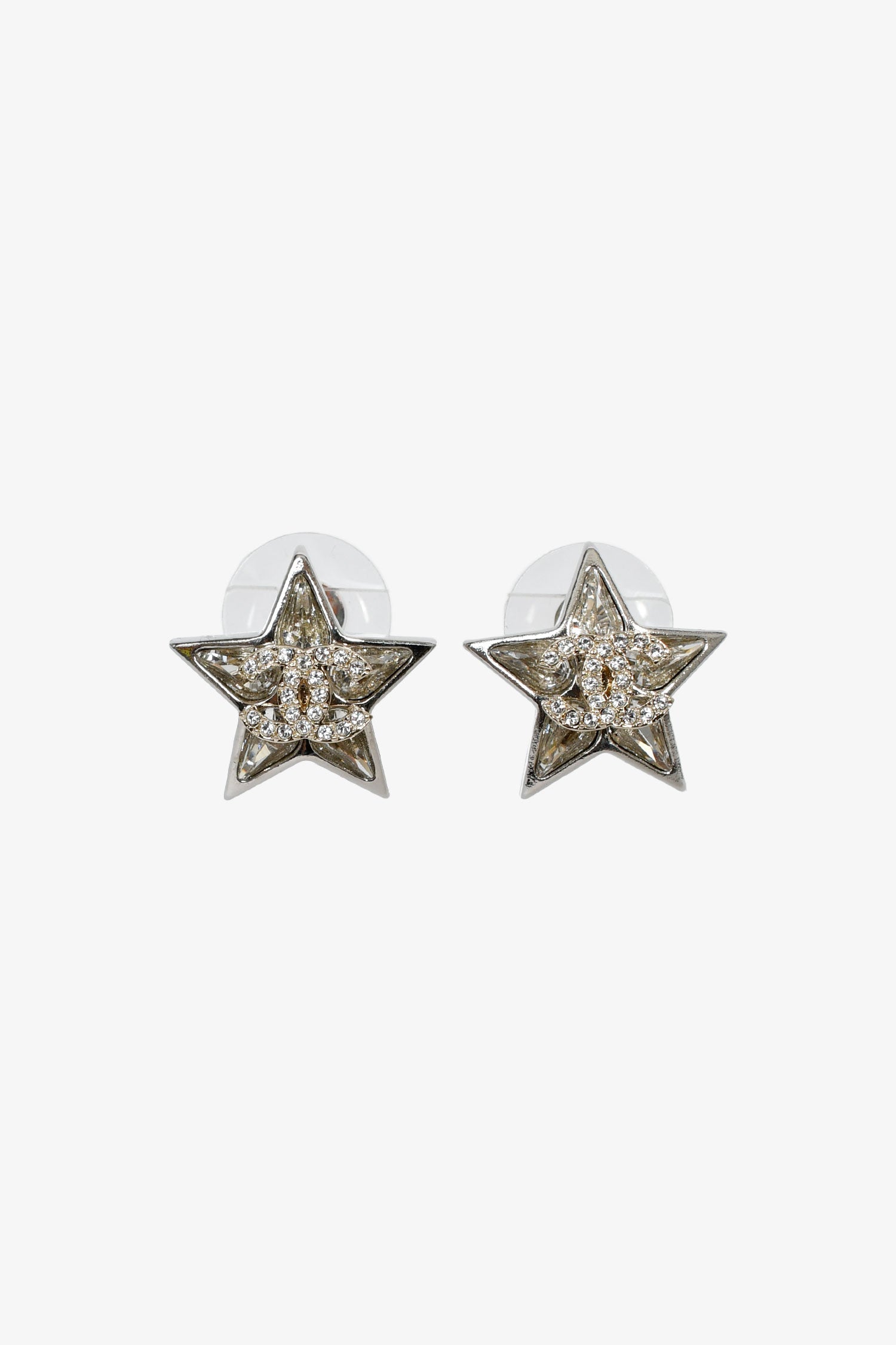 Pre-Loved Chanel™ 2023 Silver Toned Star CC Stud Earrings. Post-stud closures.